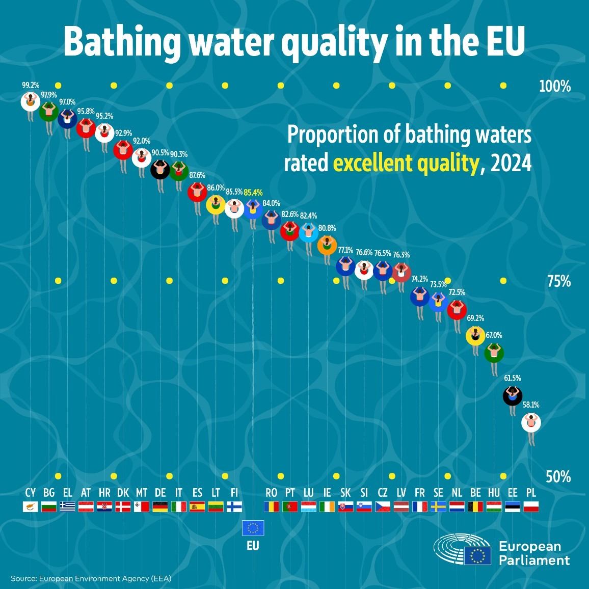 2024 wurden über 85 % der Badegewässer in fast 22.000 Zonen als „ausgezeichnet“ bewertet. 96 % erfüllten die Mindeststandards. Nur 1,5 % waren von schlechter Qualität.