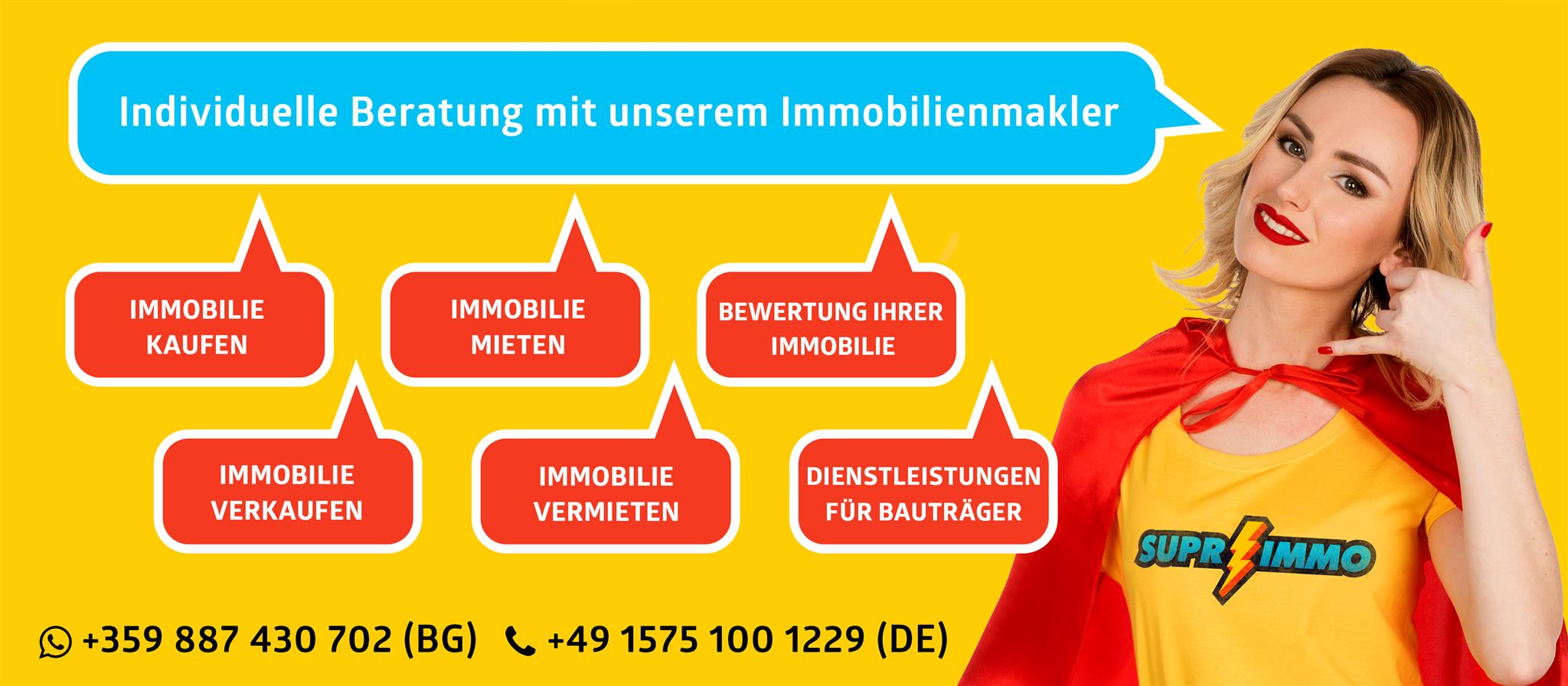 Unsere Büros befinden sich im ganzen Staat. Unsere Makler arbeiten flexibel und helfen Ihnen gern bei der Immobilienauswahl in Bulgarien! Mit unserer Dienstleistung Personalmakler von SUPRIMMO steht Ihnen ein Makler mit umfangreicher Erfahrung zur Verfügung. Er wird nur die passenden Angebote nach Ihren Ansprüchen auswählen, Besichtigungen organisieren und Sie während des Abschlusses eines erfolgreichen Geschäfts unterstützen. Die Agentur SUPRIMMO arbeitet mit einem revolutionären Ansatz, der sich vom etablierten Marktmodell in den letzten 25 Jahren in Bulgarien unterscheidet. Wir kombinieren die unbegrenzten Möglichkeiten des gegenwärtigen Digitalmarketings mit den besten Traditionen der qualitativen Maklerbetreuung.