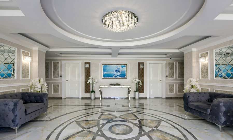 Die öffentlichen Bereiche, Flur und Treppenhäuser, die Rezeption und die Lobby werden gemäß einem Designprojekt fertiggestellt.
