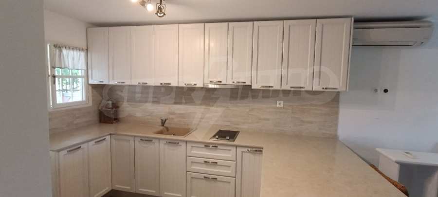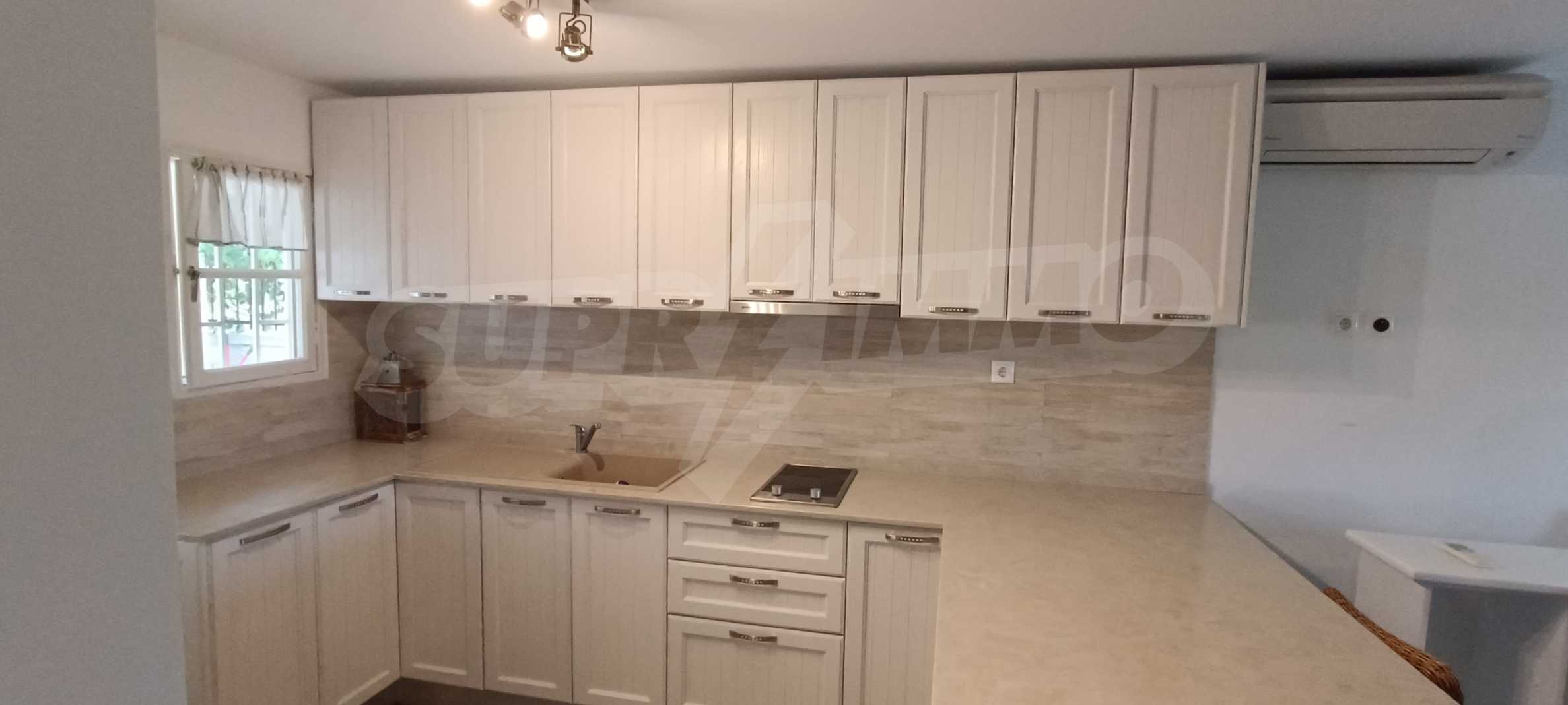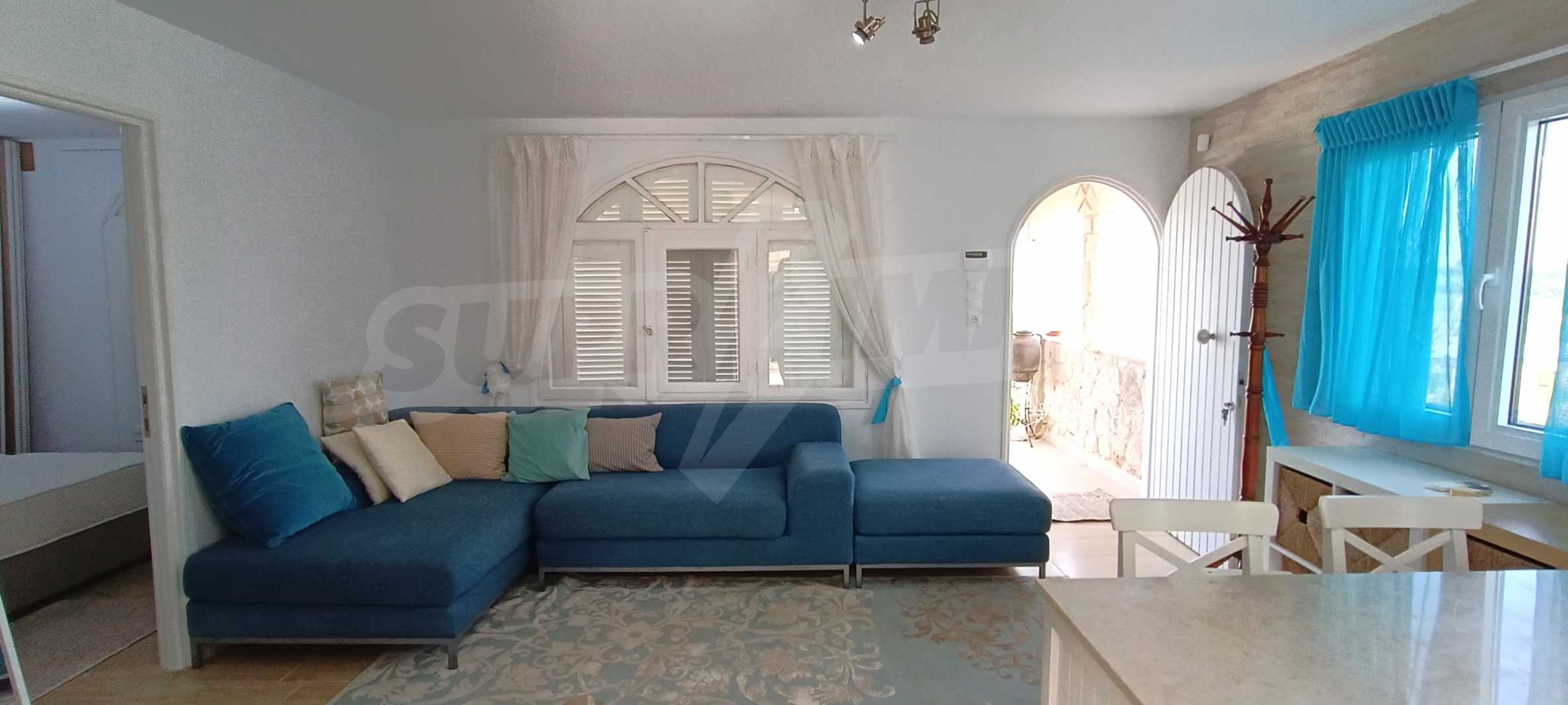 Wir präsentieren Ihnen eine Villa mit typisch ionischer Architektur in Nea Potidea, Kassandra, Chalkidiki. Die Villa ist auf einem Grundstück von 1000 qm gebaut und besteht aus zwei Flügeln, die als 2 separate Wohnungen getrennt sind. Jeder Flügel hat ein Wohnzimmer und eine Kochnische, zwei Schlafzimmer und ein Badezimmer mit Toilette. Das Haus hat auch eine Pergola-überdachte Sommerküche mit Grill, ein Apartment mit einem Schlafzimmer für Hilfspersonal und einen Abstellraum.