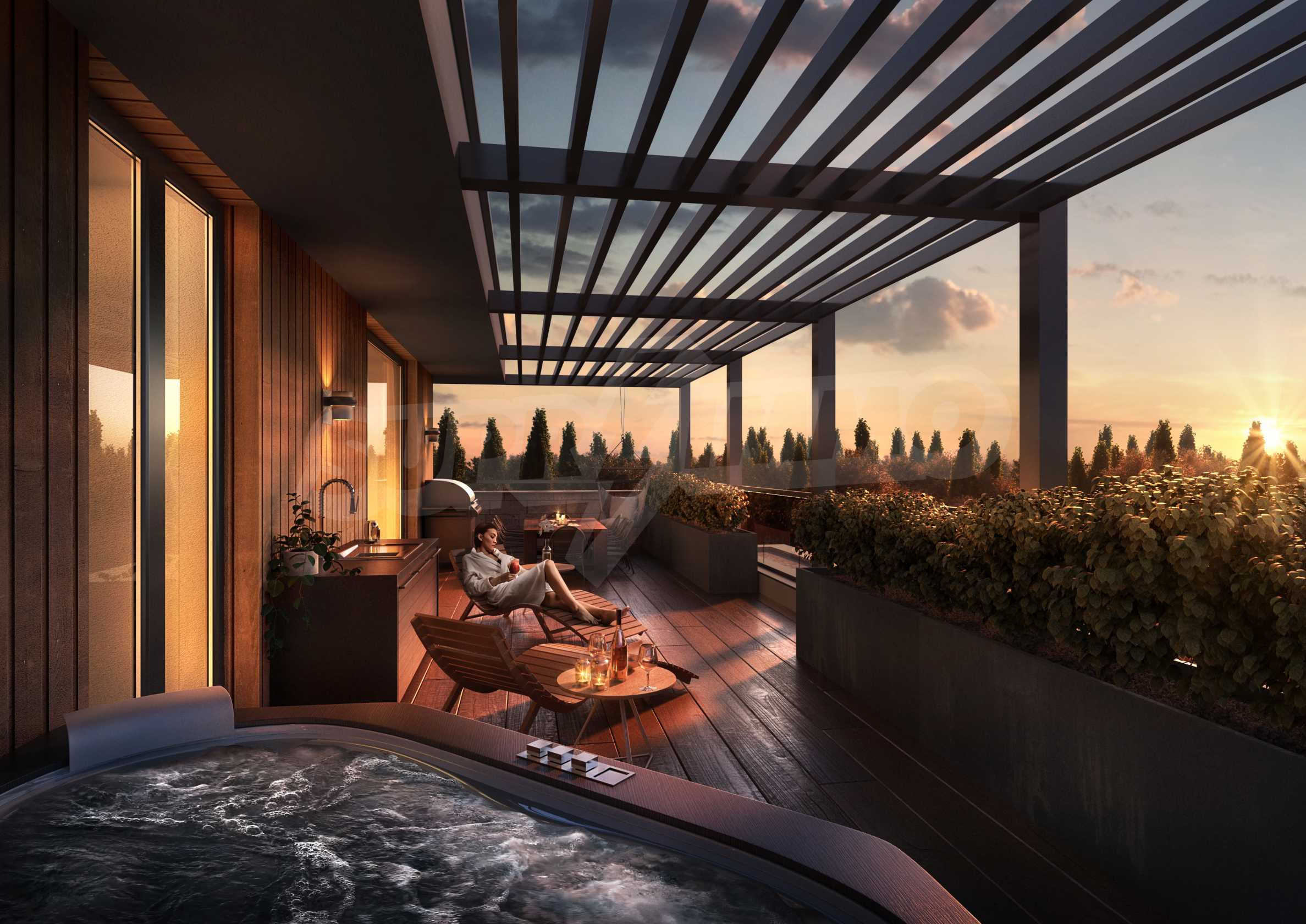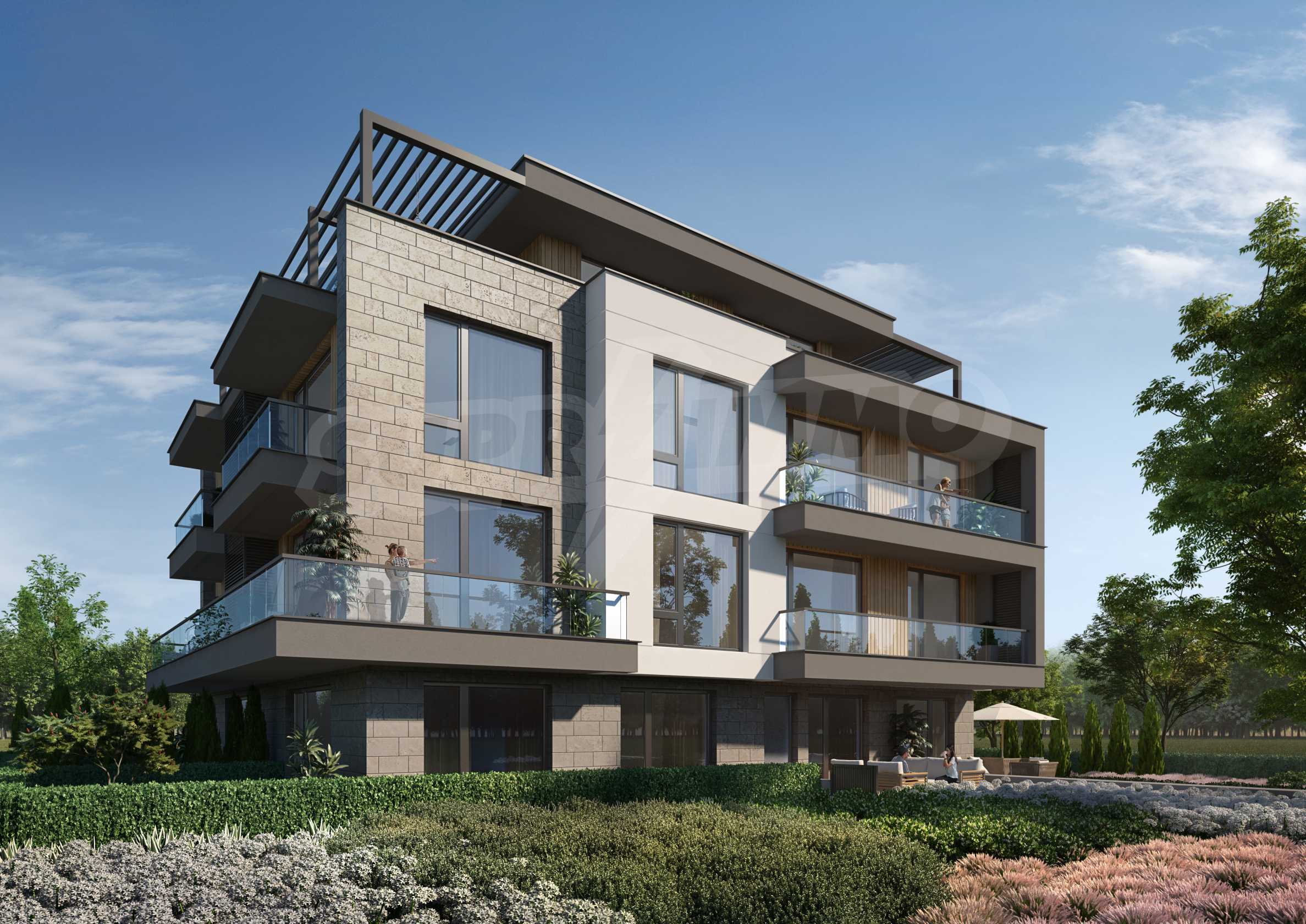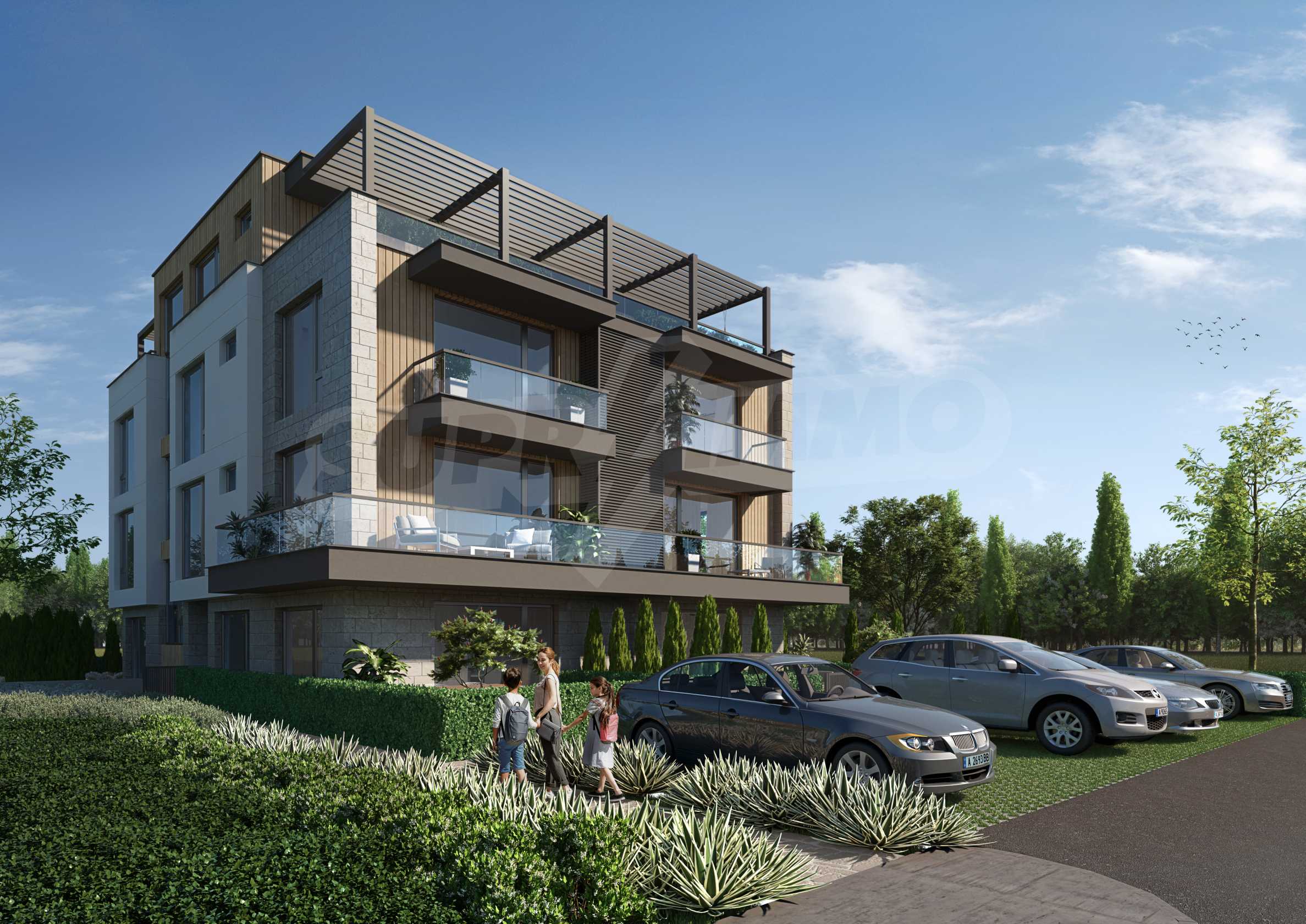 - BDS-Wohnungen mit einer Eingangstür aus Metall mit eingebautem Geheimschloss, 5-Kammer-PVC-Fenstern und Aluminiumgeländern auf den Terrassen;