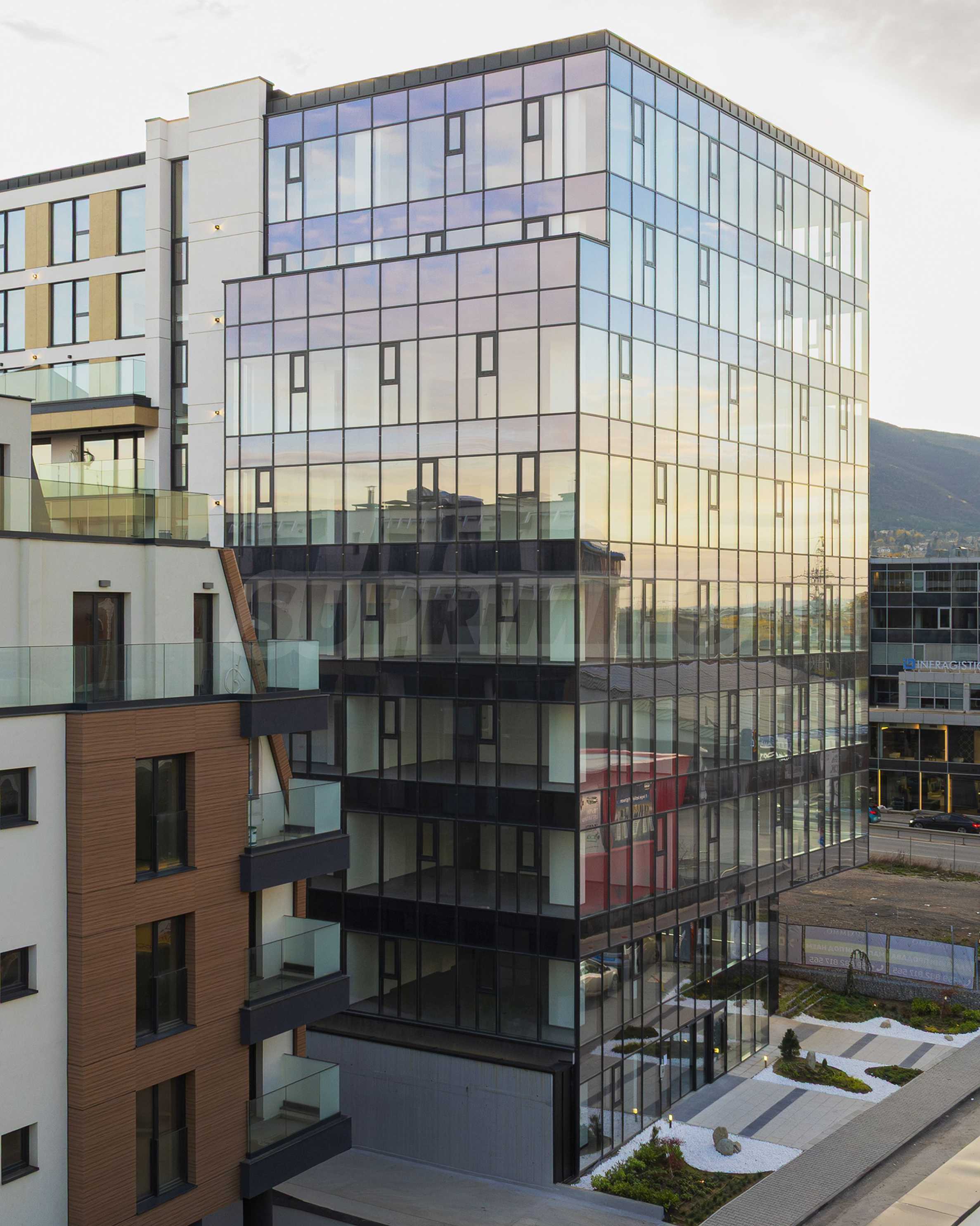 Die Tischlerei stammt von der führenden europäischen Marke Alumil aus der Serie M 11 500 Aluterm Super Plus – ein Aluminiumsystem mit einer breiten unterbrochenen Wärmebrücke. Entspricht der höchsten Klasse der europäischen Spezifikationen in Bezug auf Wärme- und Schallschutz, Luft- und Wasserdichtigkeit gemäß den Tests des Instituts ift Rosenheim (Uf = 1,9 W/M2K). Dieses System ist auch vom EKANAL-Labor geprüft und zertifiziert, das nach EU-Normen offiziell zugelassen ist.