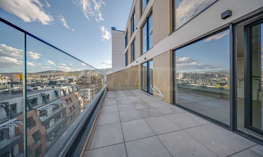 Der Bodenbelag in den Gemeinschaftsbereichen des Gebäudes, Lobby, Korridoren und Treppen wird mit Platten aus Naturstein - poliertem Granit - ausgefüllt. Die Treppengeländer sind aus durchbrochenem Aluminium, ein architektonisches Detail, das in den 3D-Innenansichten des Gebäudes sichtbar ist. Rauchdichte, selbstschließende Glastüren zu den Bodenbereichen sind vorgesehen. Für die Böden der Balkone und Loggien haben wir italienische Granitfliesen gewählt, die rutschfest sind. Die offenen Terrassen erhalten einen Doppelboden und Bodenbeläge aus italienischen Keramikfliesen.