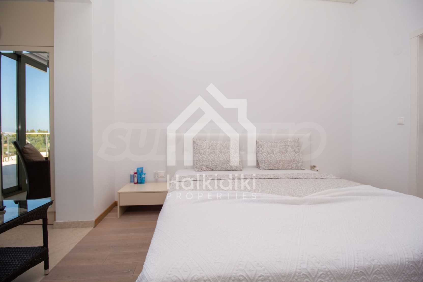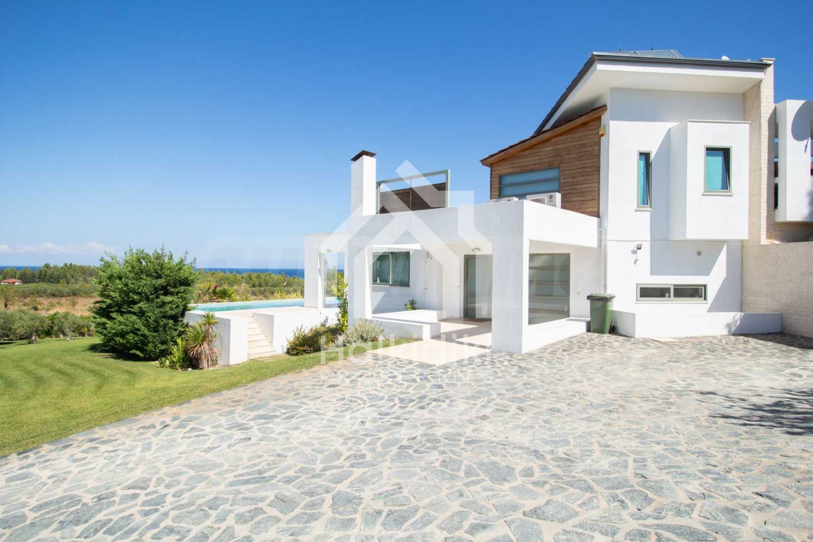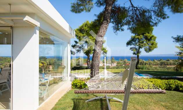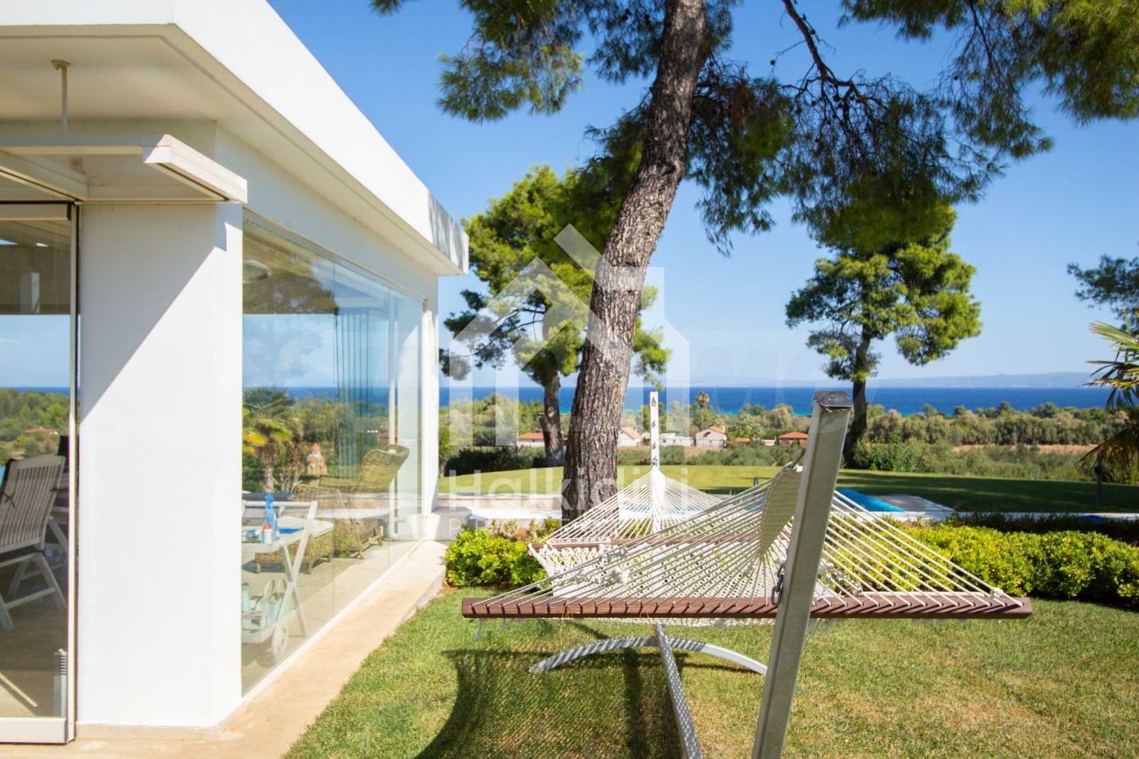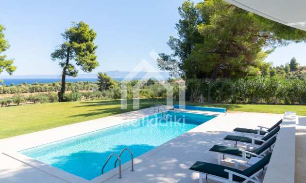 Luxusresidenz. Ein wunderschönes Einfamilienhaus mit luxuriösem Pool in bemerkenswerter Lage in Kassandra, im kleinen Paradies Chalkidiki. Das Anwesen befindet sich auf einer Fläche von 2000 qm. , mit außergewöhnlichem Meerblick, Es besteht aus 3 Ebenen mit insgesamt 330 qm. Wohngebiet. Das Anwesen umfasst 5 Schlafzimmer, 1 WC. , Abstellraum und 4 Badezimmer