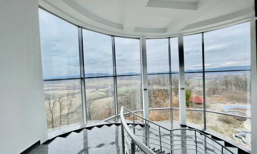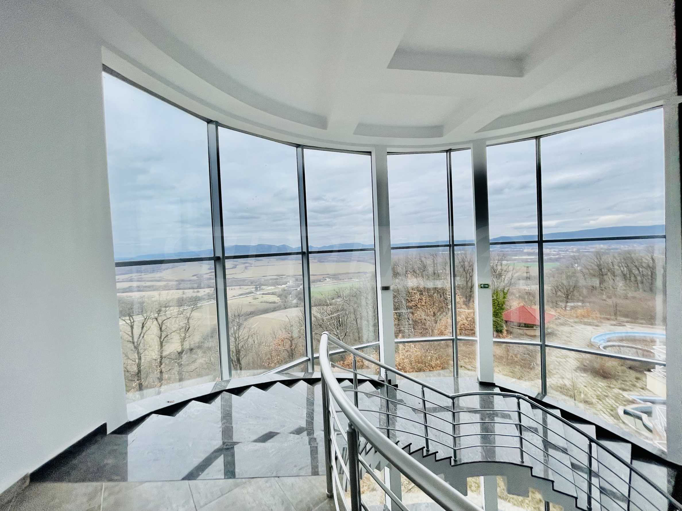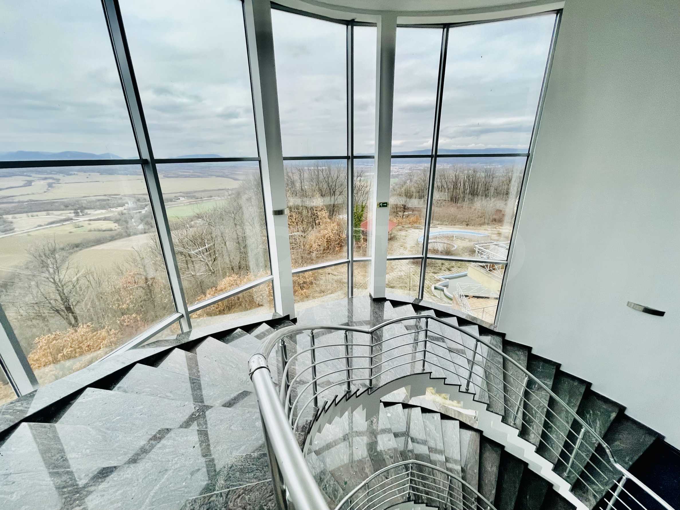 Das Anwesen hat eine bebaute Fläche von 5.000 m², befindet sich auf einem 10.000 m² großen Grundstück und verfügt über eine Tiefgarage und ein unvollendetes Spa-Center. Das Gebäude hat drei Etagen mit Zimmern mit Aussicht. Auf dem Dach befindet sich ein Restaurant