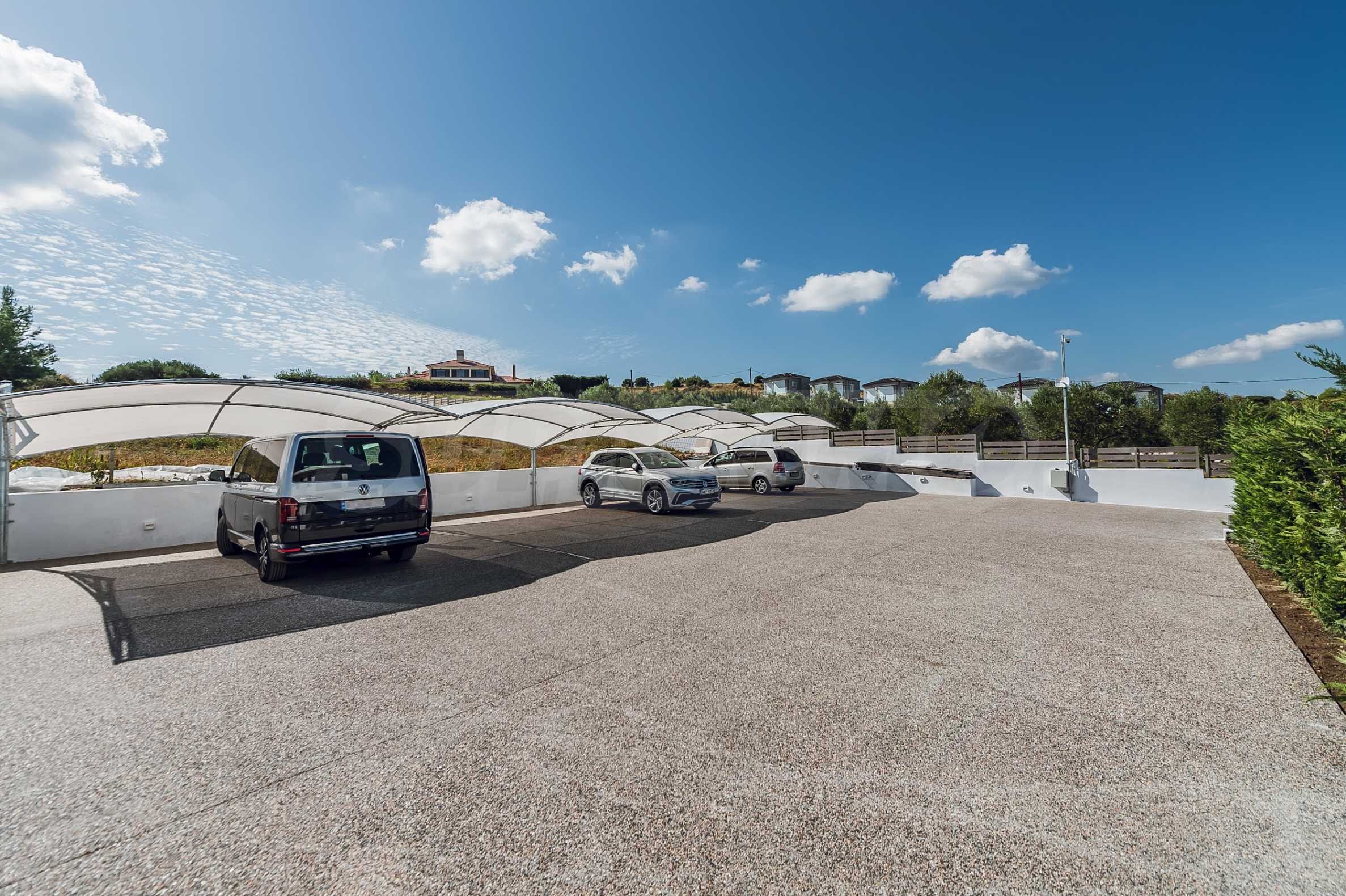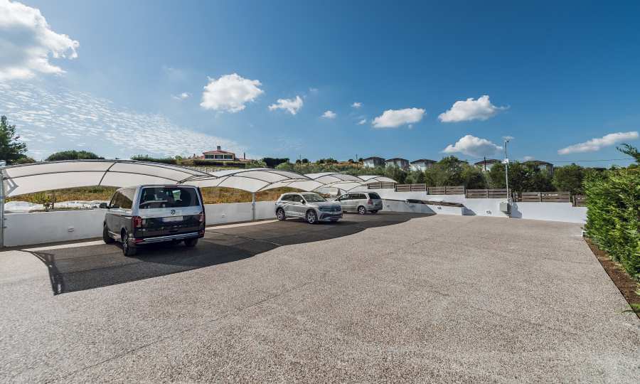 Überdachte Parkplätze bieten Platz für vier Autos. Auf der Straße wurde eine Beleuchtungsanlage installiert, die die Silhouette des Hauses positiv hervorhebt!