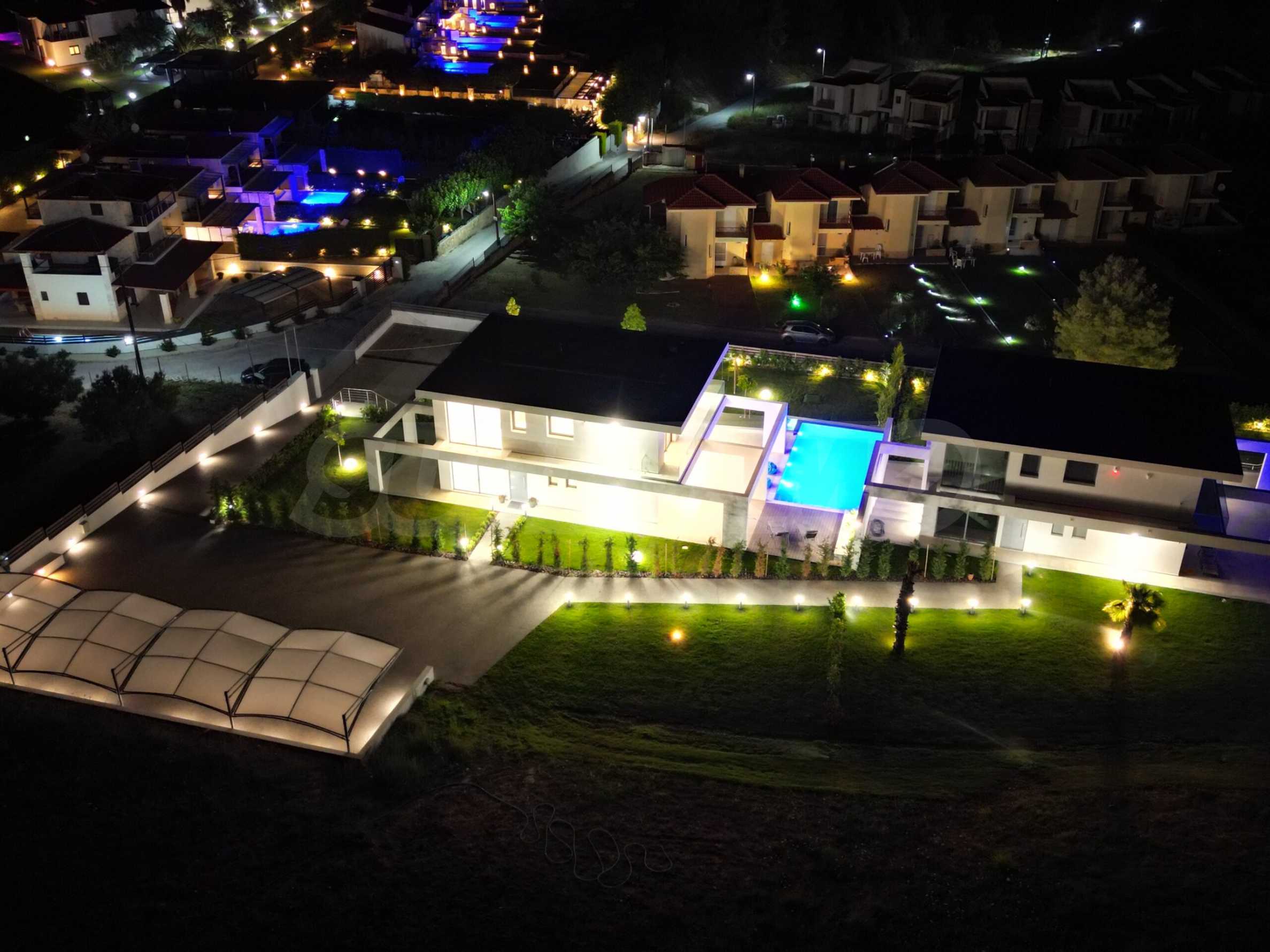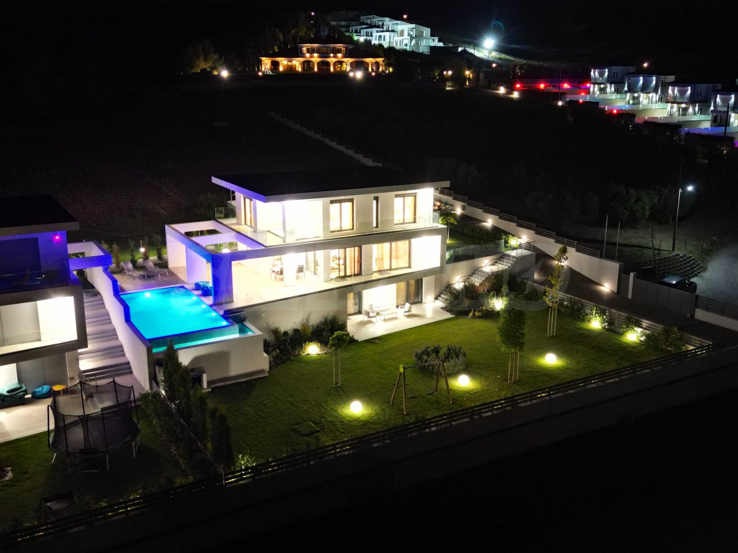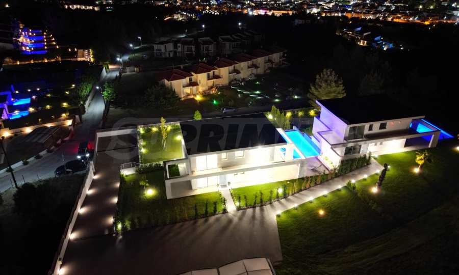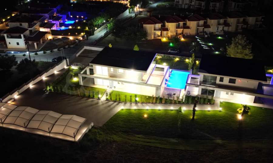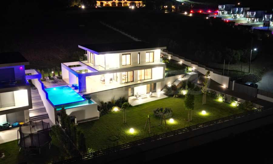 Die Villa hat eine moderne, minimalistische Ästhetik und ist in mediterranen Stiltönen mit modernen technischen Lösungen gebaut. Einige der Gebäude sind mit Naturstein, Travertin, dekoriert. Die Komposition aus eloxiertem Metall ist eine architektonische Lösung, die den modernen Stil gut unterstreicht. Dank dieser Lösungen wird das Haus auch nach Jahrzehnten noch beeindruckend aussehen!