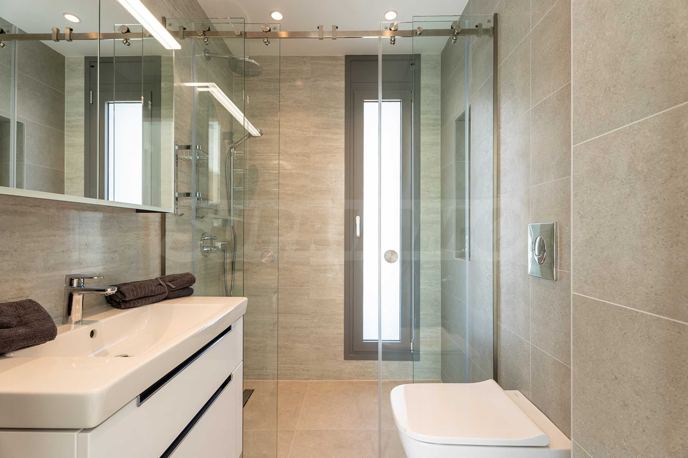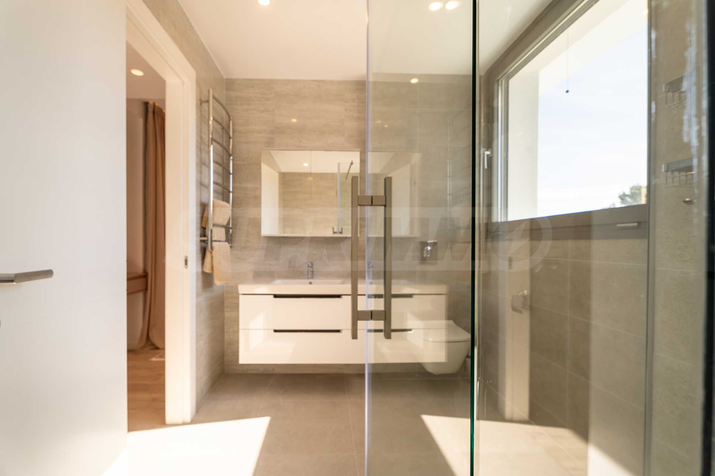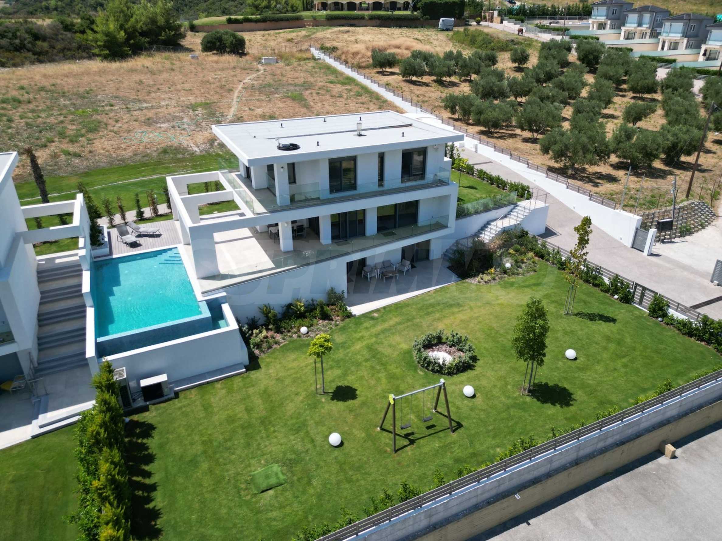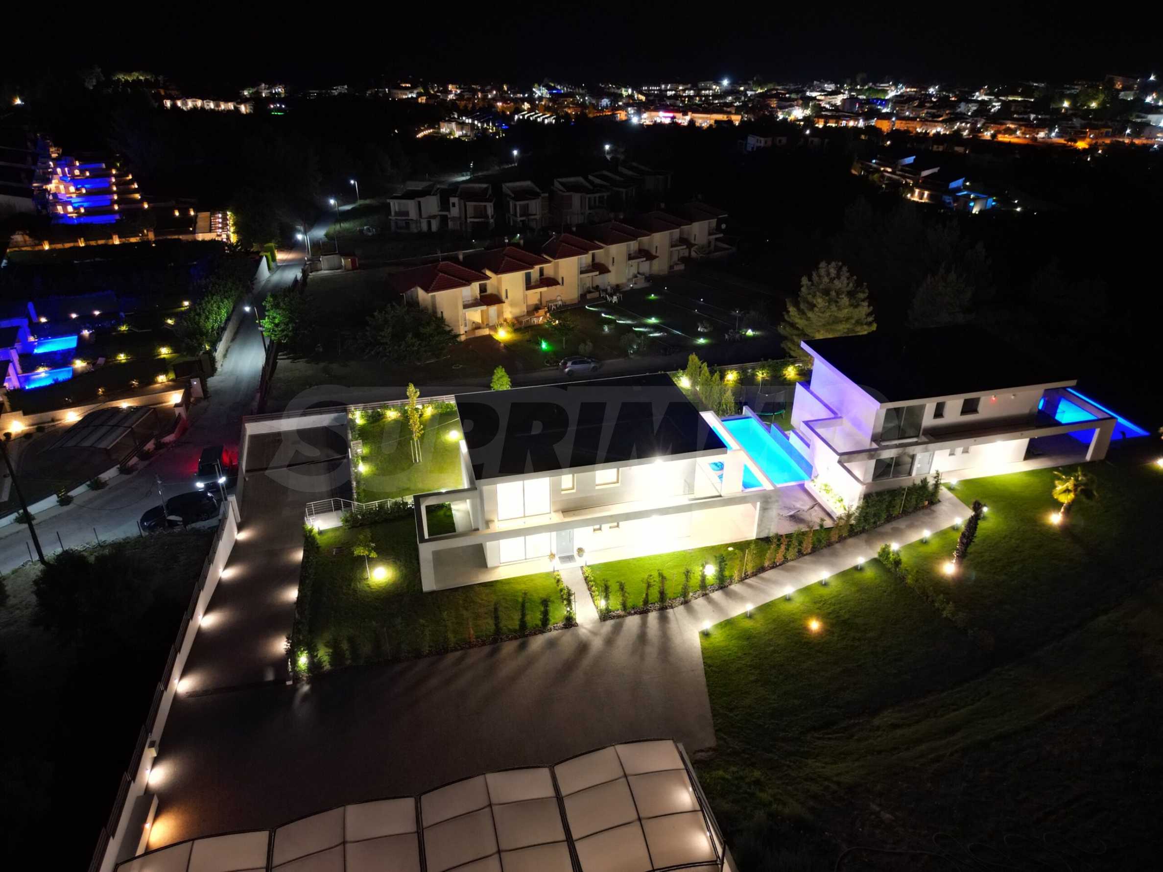 Die Villa hat eine moderne, minimalistische Ästhetik und ist in mediterranen Stiltönen mit modernen technischen Lösungen gebaut. Einige der Gebäude sind mit Naturstein, Travertin, dekoriert. Die Komposition aus eloxiertem Metall ist eine architektonische Lösung, die den modernen Stil gut unterstreicht. Dank dieser Lösungen wird das Haus auch nach Jahrzehnten noch beeindruckend aussehen!