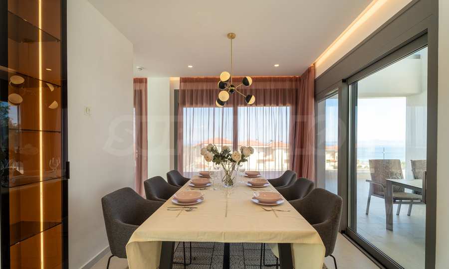 Die Panoramafenster des Wohnzimmers blicken auf die Ägäis und Chanioti. In der Mitte des Wohnzimmers befindet sich ein doppelseitiger Kamin, der eine Atmosphäre der Gemütlichkeit und Wärme schafft, aber auch an den seltenen kühlen Tagen gut wärmt.