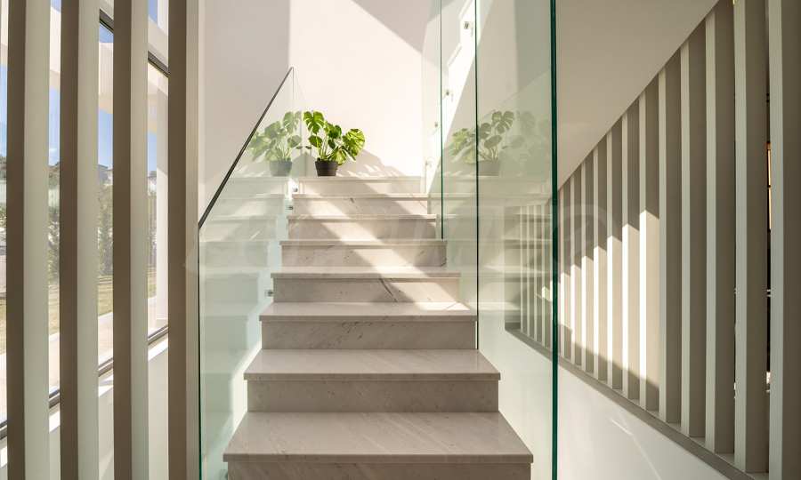 Im Innenhof gibt es einen zusätzlichen Bereich für einen Grill und ein Solarium, und dank der Verglasung eines Großteils des ersten Stockwerks wird die Aussicht vom Haus stark erhöht. Der Infinity-Pool mit einer Fläche von 45 m2 vermittelt das Gefühl, man befinde sich am Rand einer Klippe und die Wasseroberfläche sei endlos. Gleichzeitig ist es dank der rutschfesten Oberfläche aus technischem Granit sicher, um den Pool herumzugehen.