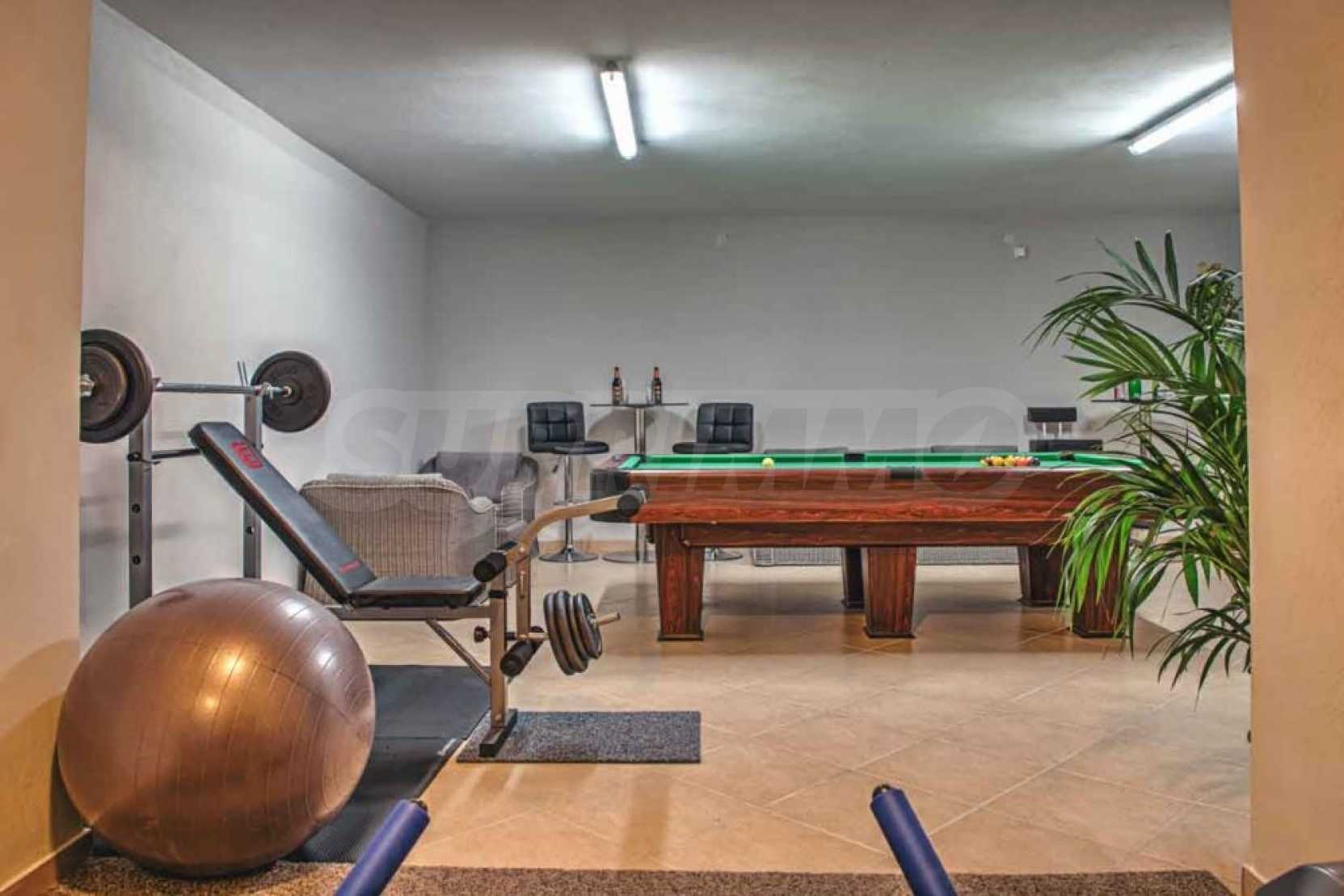 Ein weiteres Badezimmer befindet sich auf der Südseite dieser Ebene. Auf der unteren Ebene des Anwesens befindet sich ein weiteres Schlafzimmer mit Bad en Suite, Fitnessraum, Materialraum mit Bad en Suite und 2 weitere Abstellräume. Ein großer überdachter BBQ-Bereich, der Swimmingpool und ein Whirlpool im Freien runden das Äußere ab.