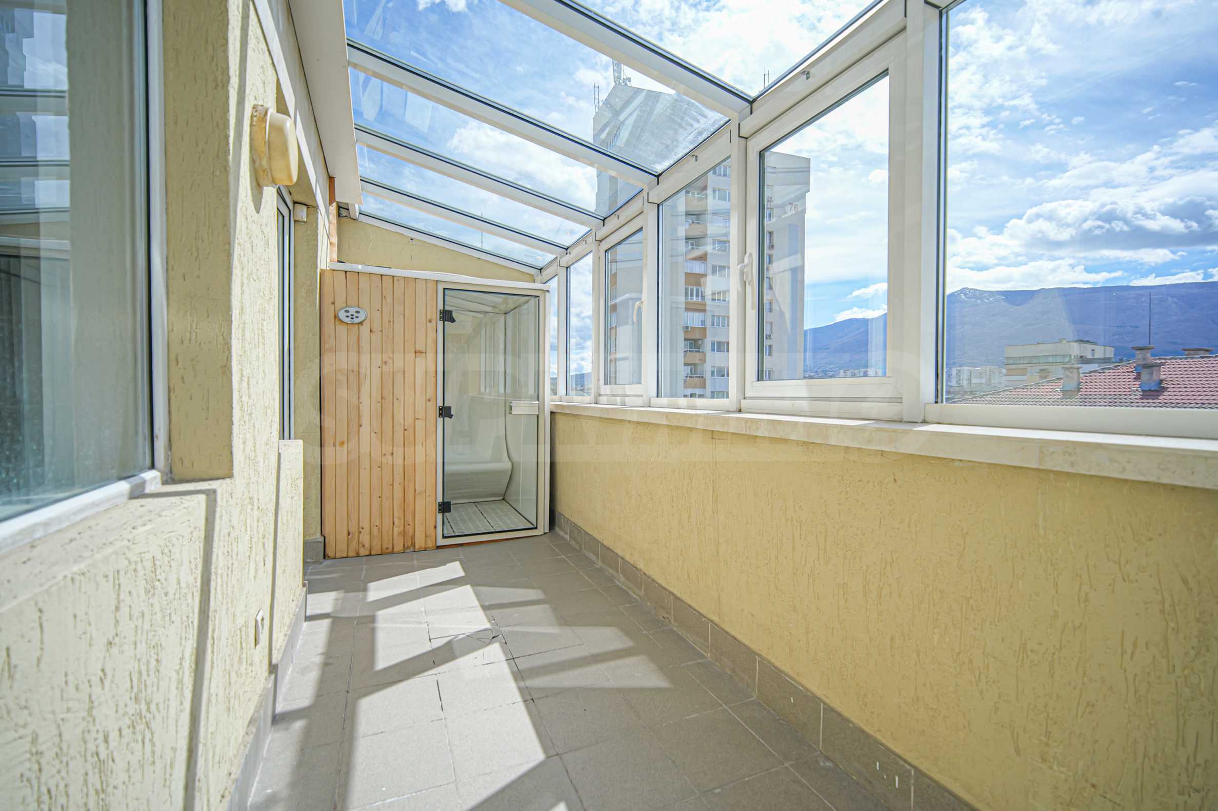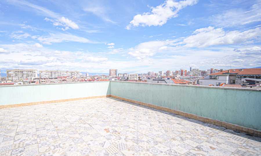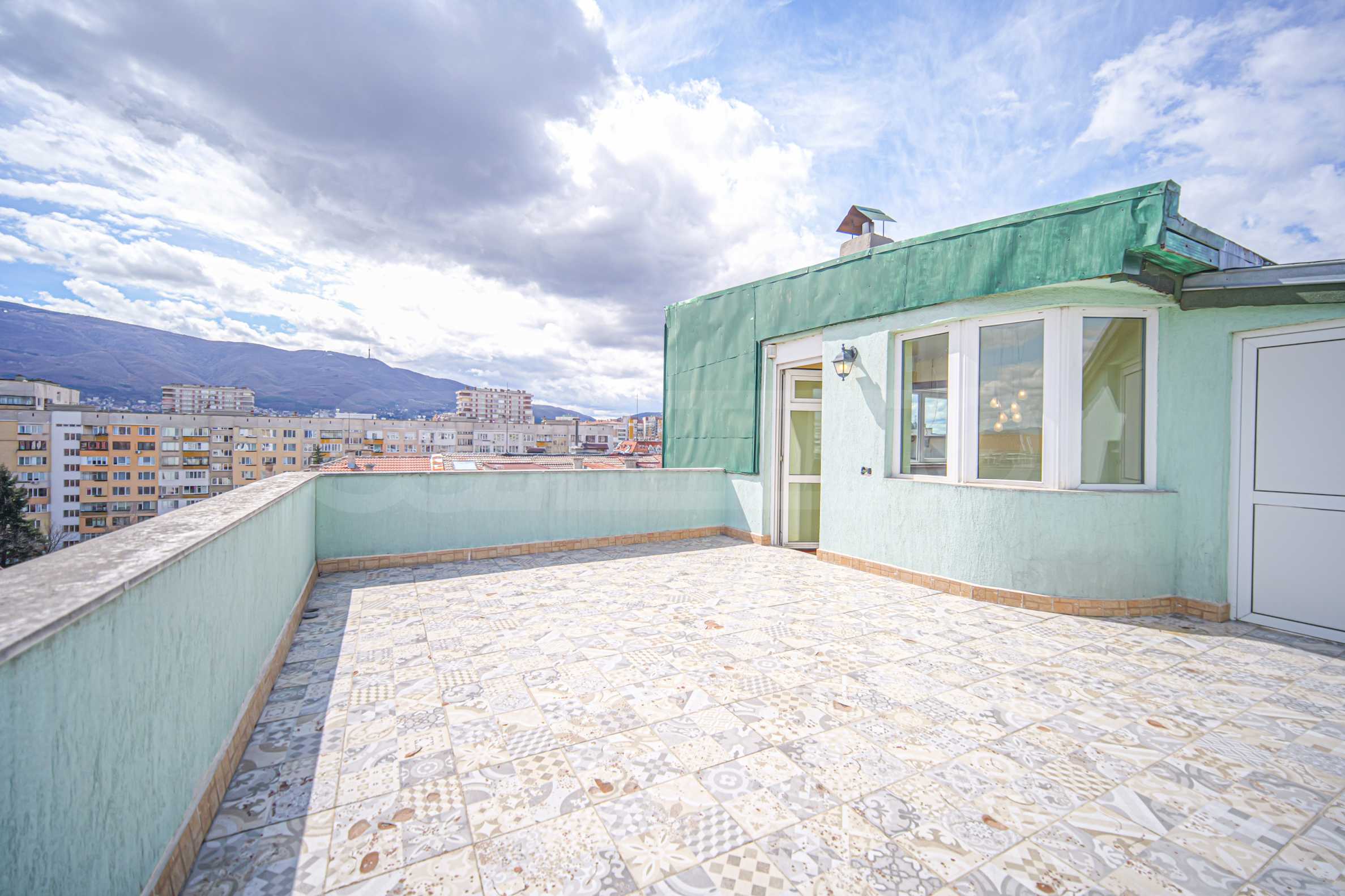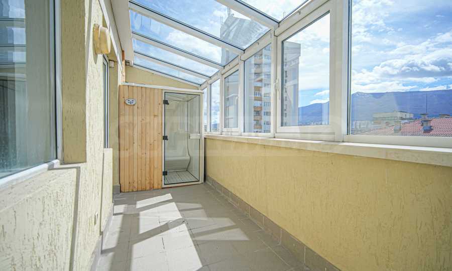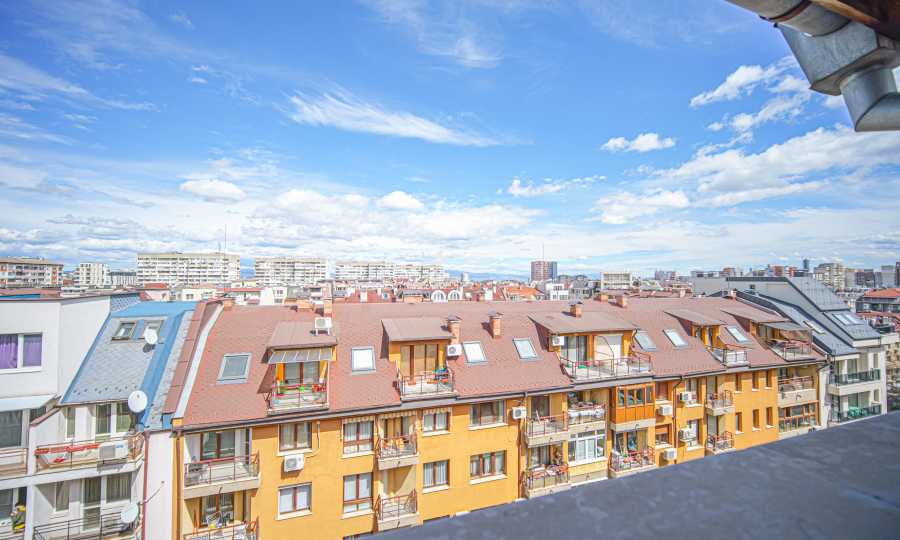 Das Apartment befindet sich in den oberen beiden Etagen eines achtstöckigen Gebäudes aus dem Jahr 2007 mit Aufzug und bietet eine geräumige Terrasse sowie einen herrlichen Panoramablick auf die Stadt und das Witoschagebirge. Es ist nach Süden ausgerichtet und verfügt über 154 m² Wohnfläche und 40 m² Terrassen.