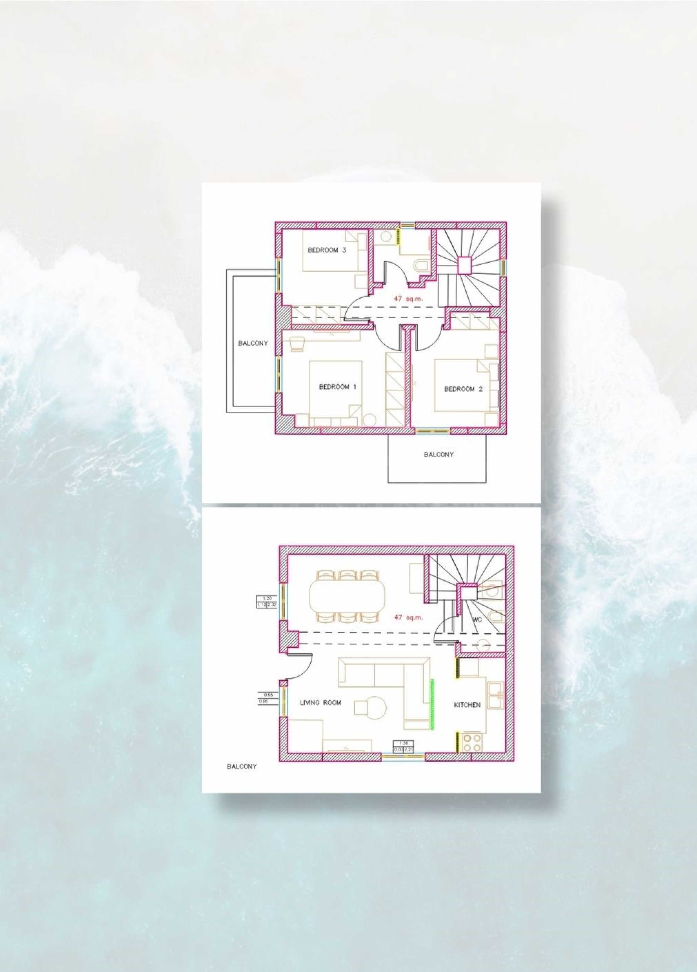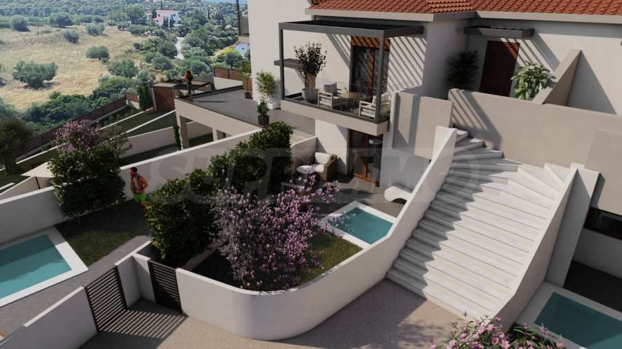 Die Wohnung verfügt über eine Nettonutzfläche von 94 qm, zwei Terrassen mit einer Gesamtfläche von 40,1 qm, einen an das Grundstück angrenzenden Privatgarten mit einer Fläche von 63 qm, sowie sowie einen eigenen Parkplatz. Die Maisonette-Wohnung erstreckt sich über zwei Ebenen, wobei sich die Schlafzimmer im Erdgeschoss befinden und das Wohnzimmer mit der Küchenzeile und dem Essbereich auf der zweiten Ebene, von wo aus man einen wunderschönen Blick auf das Ägäische Meer und die umliegende Landschaft hat.