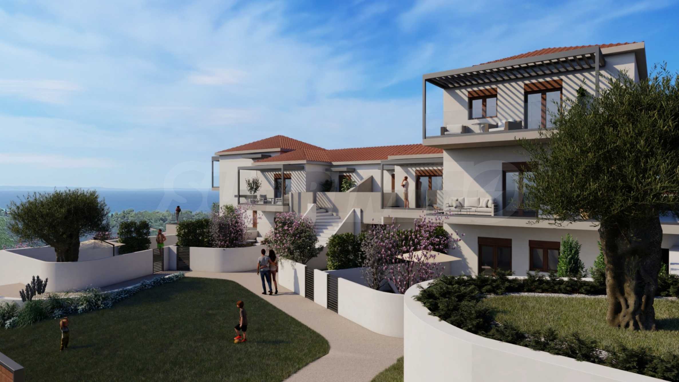 Der Komplex wurde 2012 fertiggestellt und verfügt über 12 Ferienimmobilien in drei Hauptgebäuden mit einer bebauten Gesamtfläche von 1270 qm. Das Grundstück, auf dem der Komplex errichtet wird, hat eine Fläche von etwa 7.000 Quadratmetern und liegt am höchsten Punkt der Stadt Nikiti, von wo aus sich ein atemberaubender Blick auf das Ägäische Meer bietet. In der Anlage gibt es Entspannungsbereiche mit Pavillons und Grills sowie die Möglichkeit eines kleinen privaten Pools oder Whirlpools für jedes der Objekte.