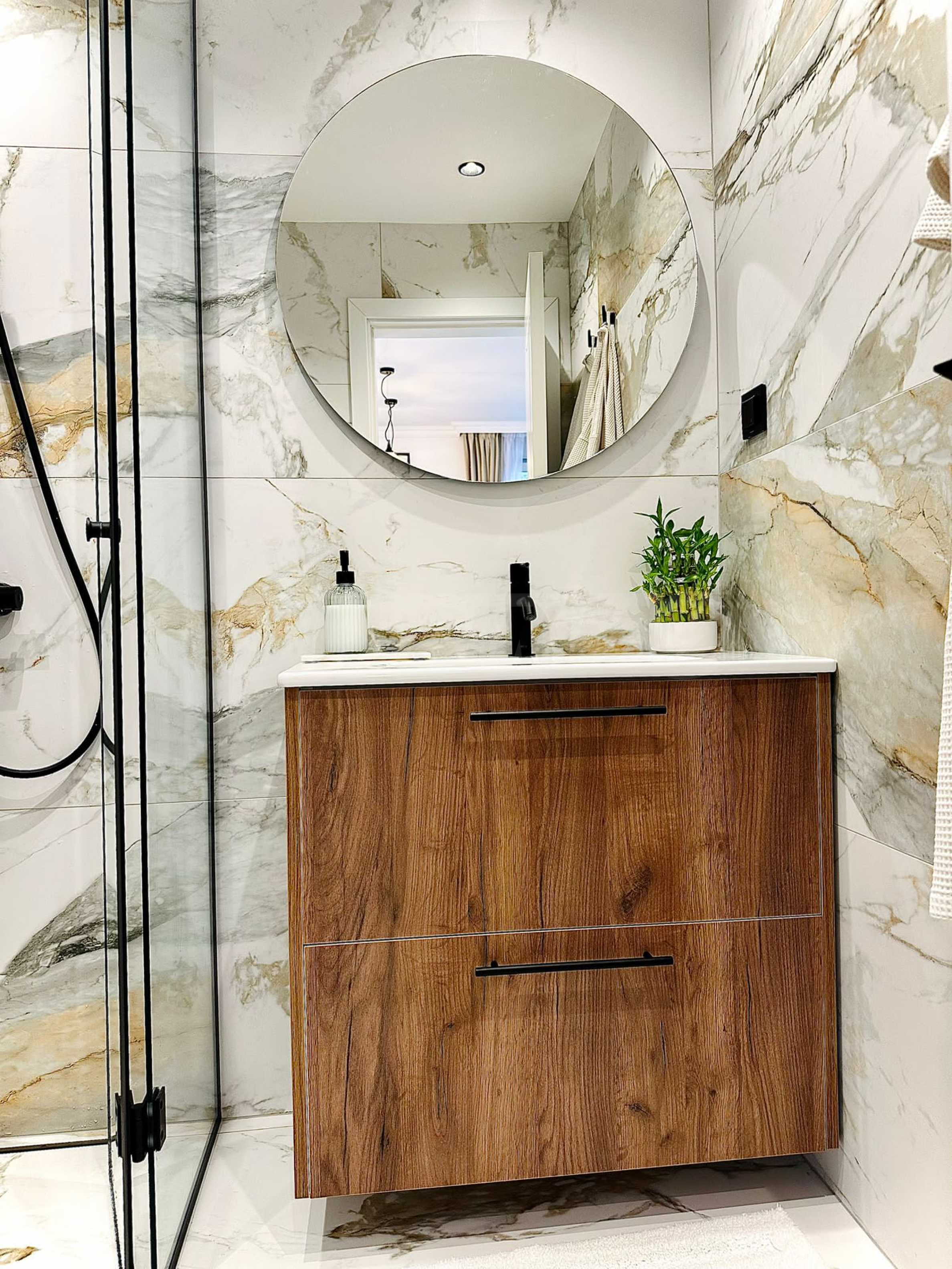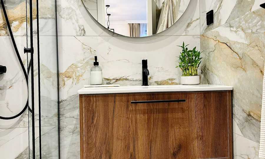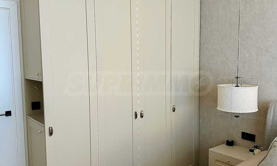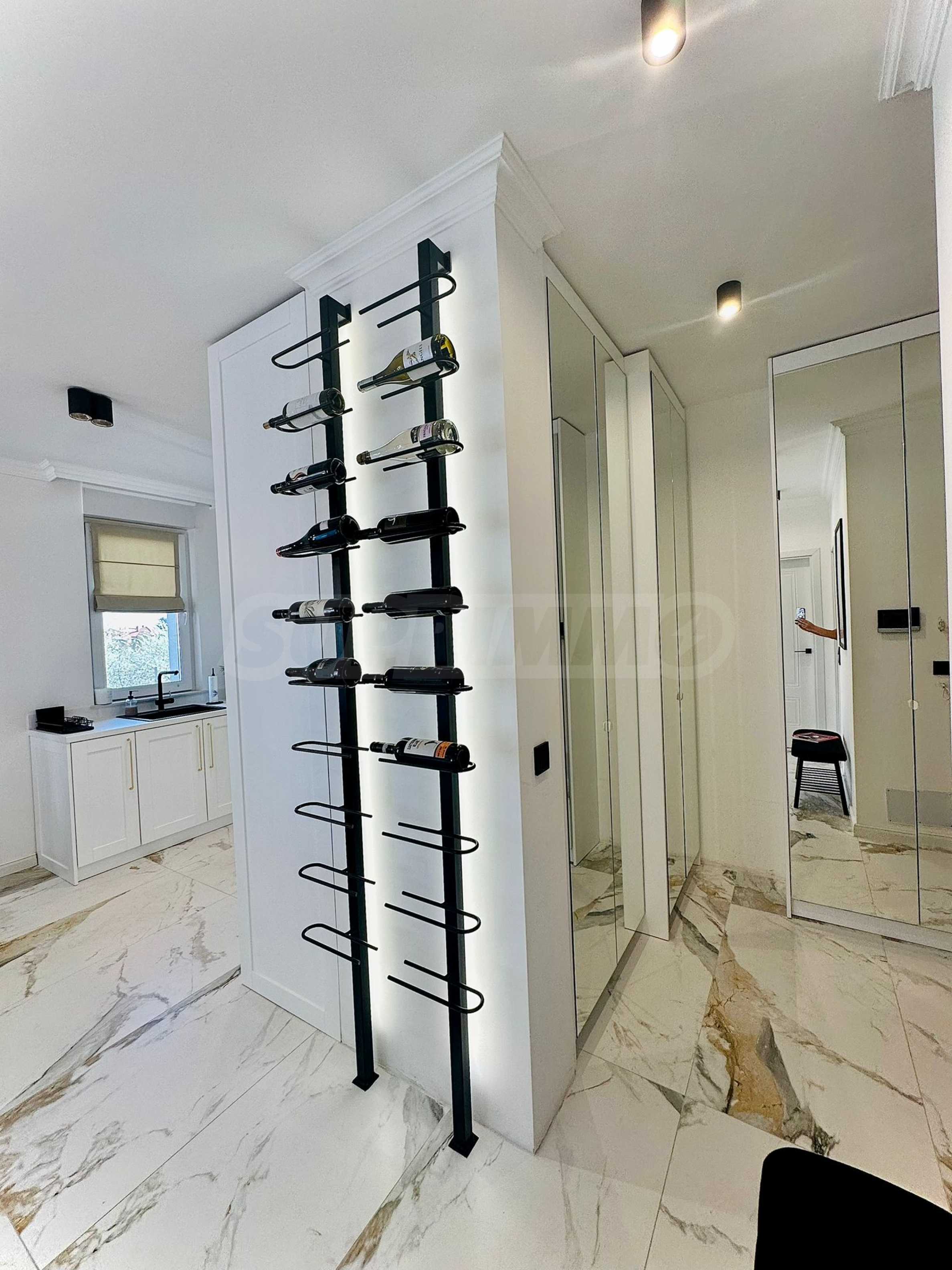 Die Wohnung wurde nach einem individuellen Gestaltungskonzept fertiggestellt, das sich durch klare Linien, eine sanfte Farbpalette und präzise ausgewählte funktionale Lösungen auszeichnet. Für zusätzliche Gemütlichkeit und Atmosphäre sorgt ein Bioethanolkamin im Wohnzimmer.