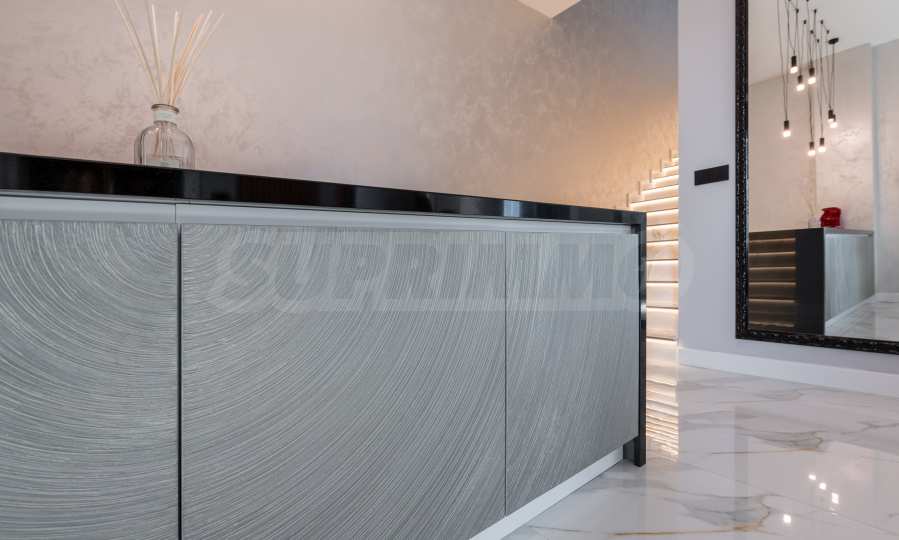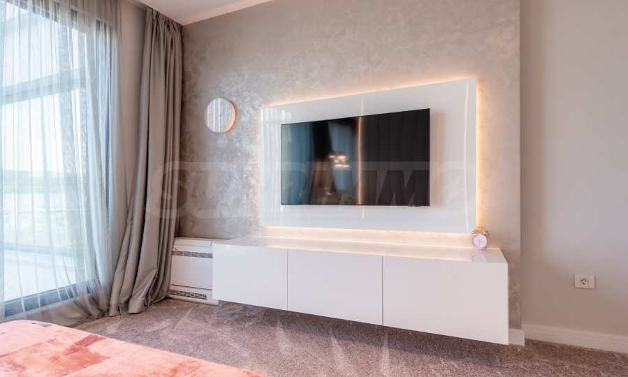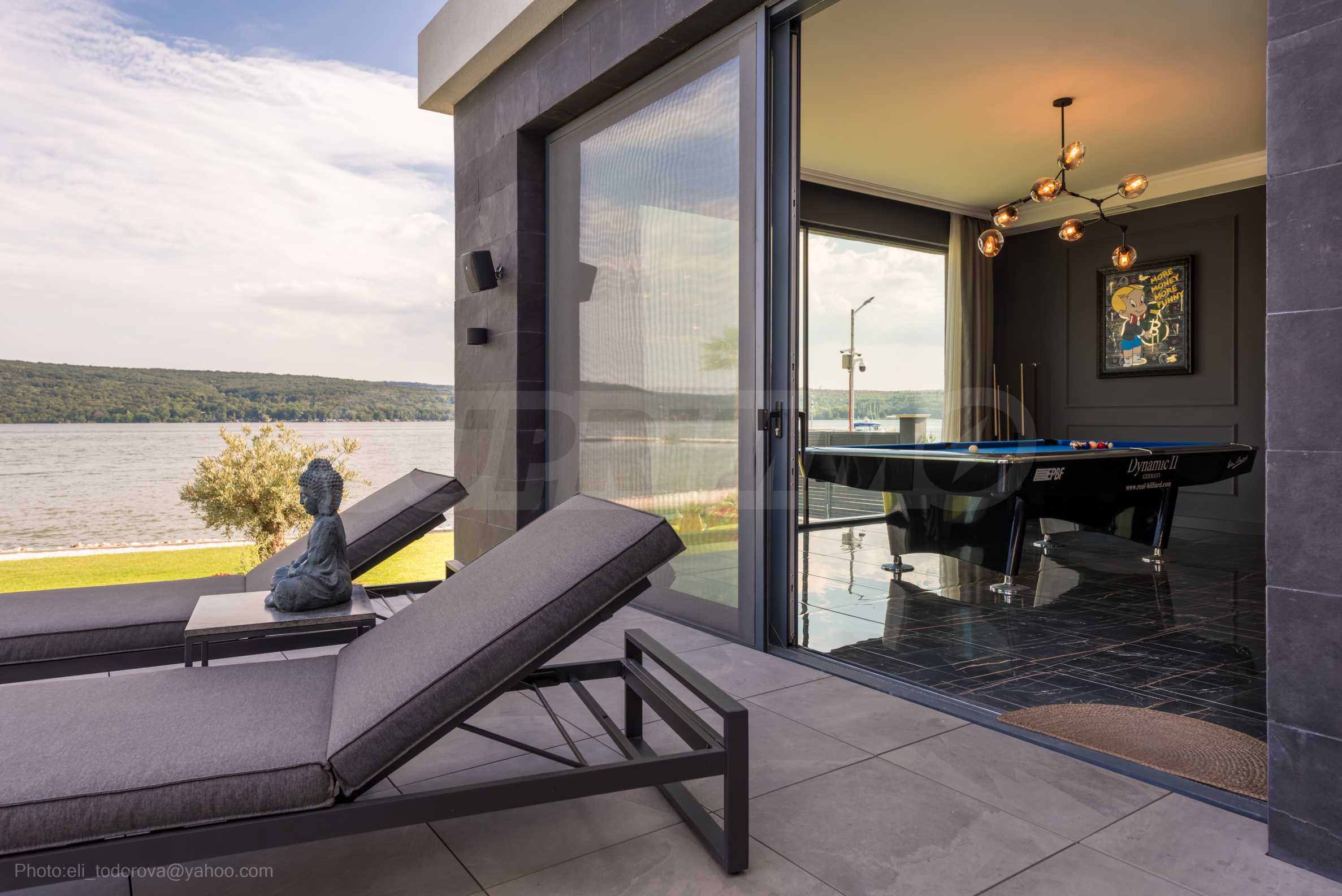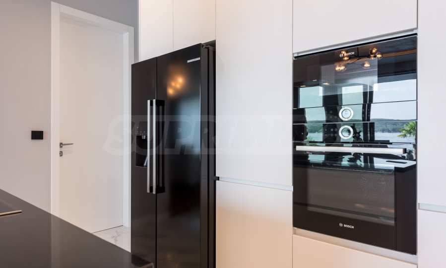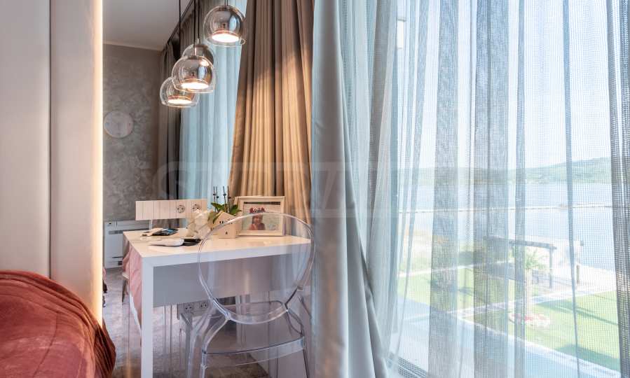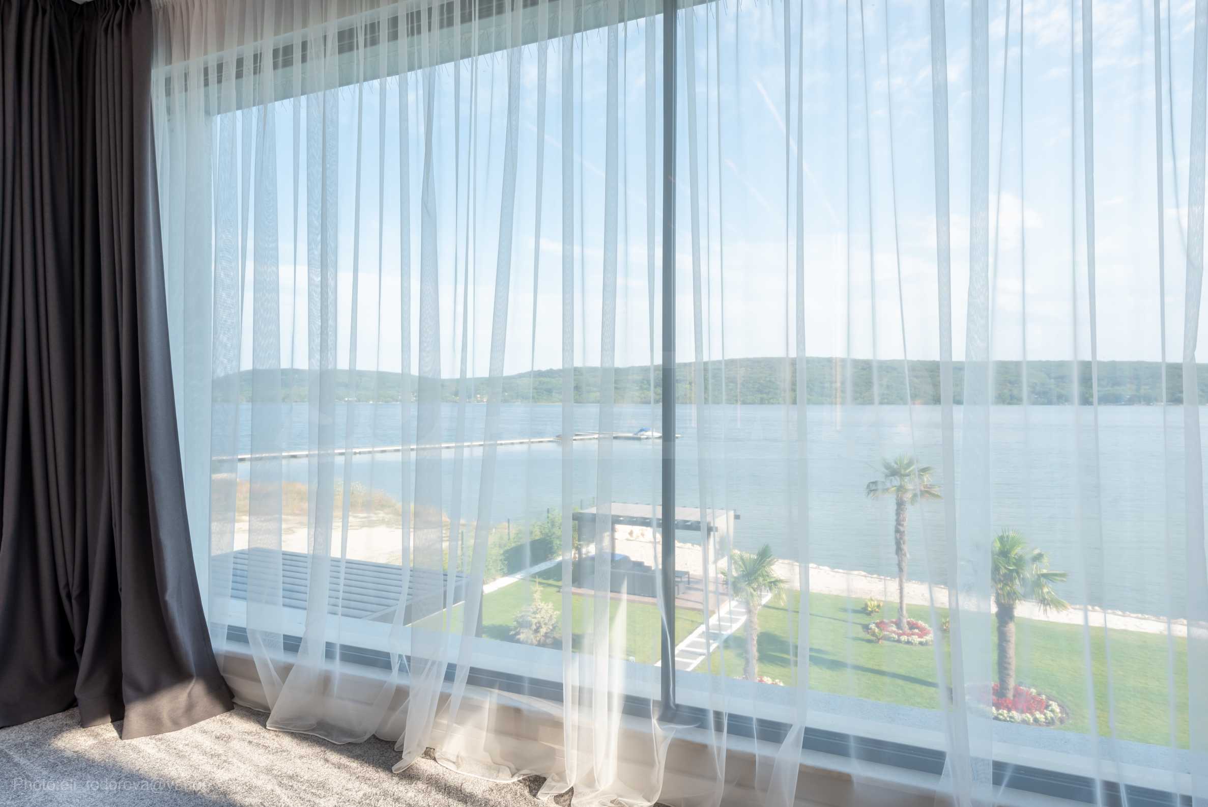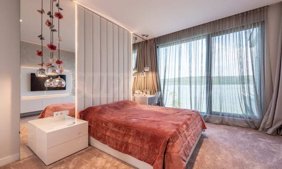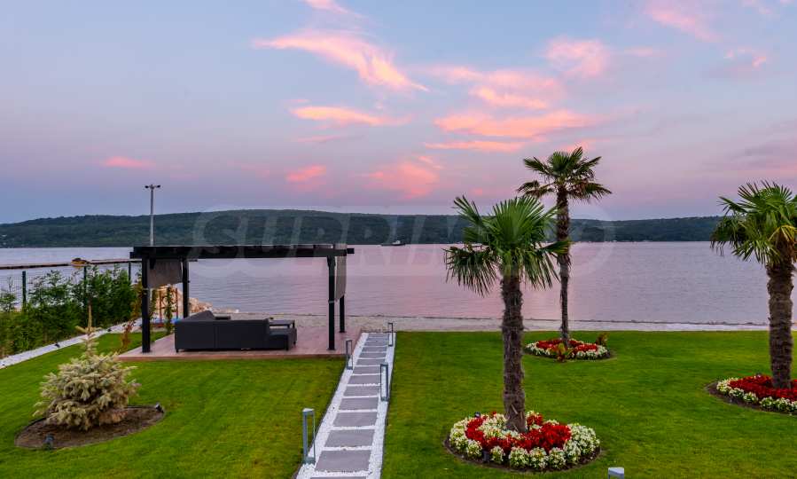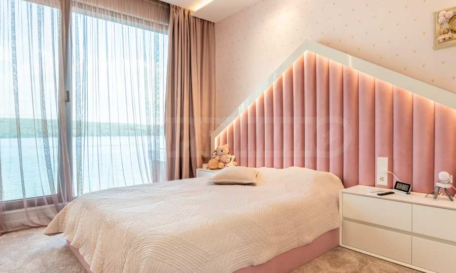 Das bemerkenswerte Haus liegt direkt am Ufer des Varna-Sees und verfügt über einen eigenen Sandstrand mit direktem Zugang über einen Bootssteg. Das Anwesen beeindruckt durch seine spektakuläre moderne Fassade, die abends elegant beleuchtet wird und sich harmonisch in den Sonnenuntergang und das Grün des Gartens einfügt. Das Interieur ist im Einklang mit dem Äußeren gewählt, modern und stilvoll und spiegelt gleichzeitig ruhigen Luxus wider und unterstreicht den Charakter des Hauses. Die Sicherheit und die friedliche Atmosphäre des Anwesens sind sehr hoch und ermöglichen ungestörtes und vertrauliches Wohnen mit Verbindung zur umgebenden Natur.