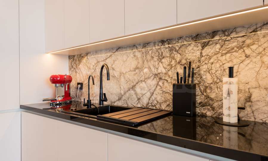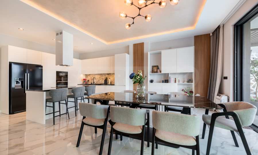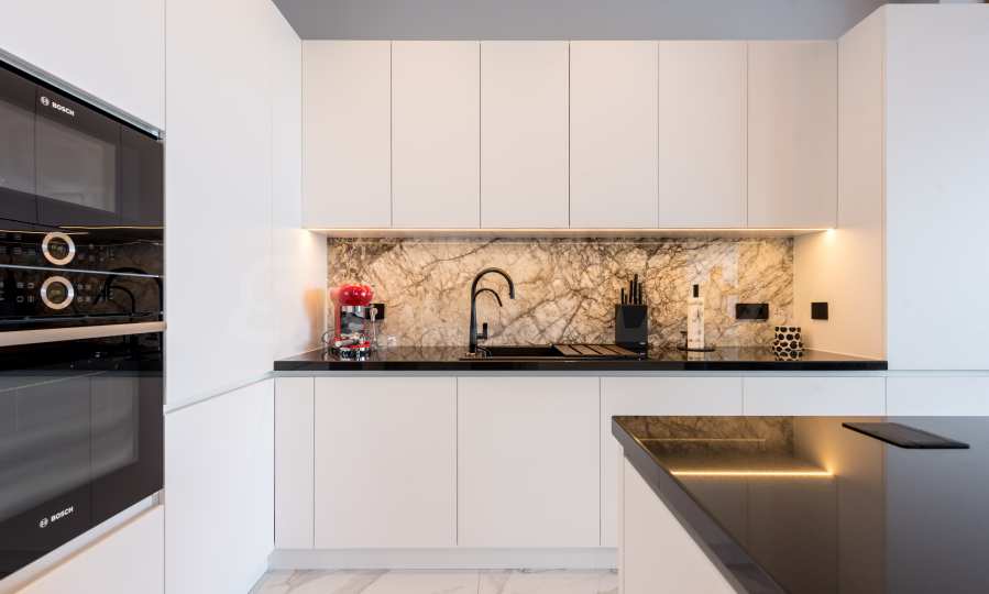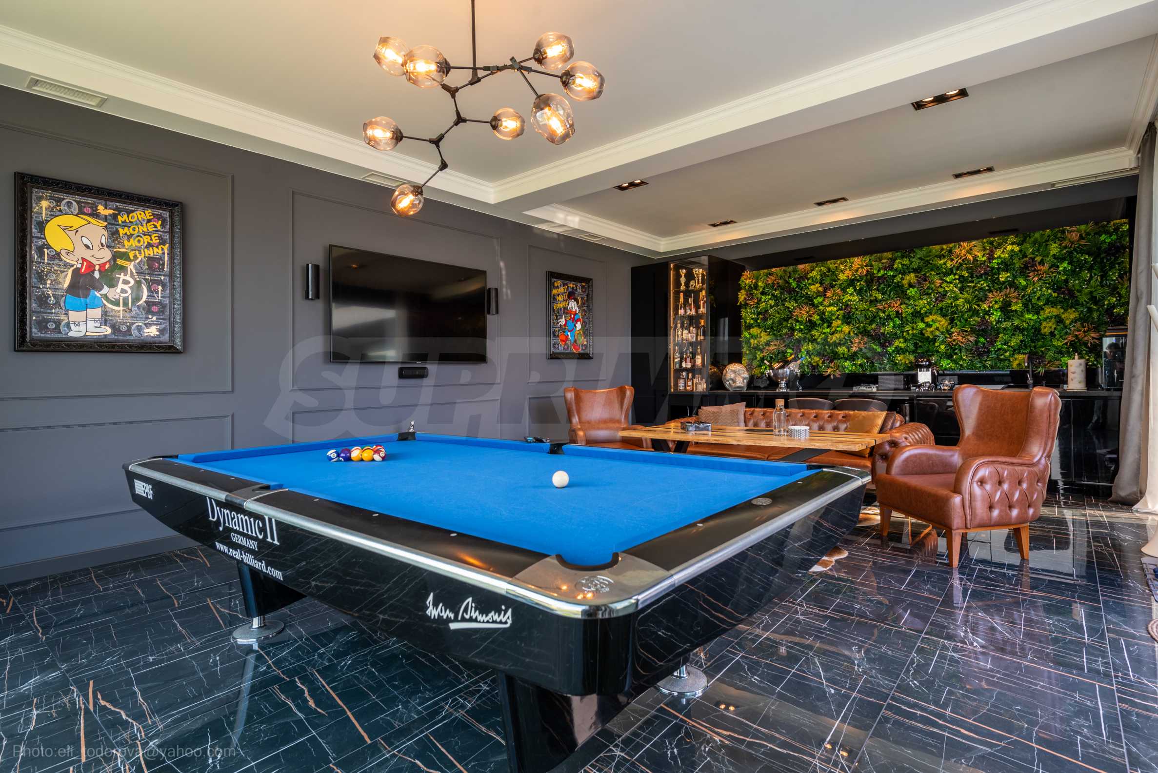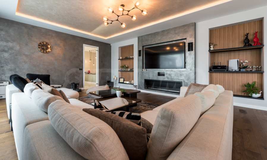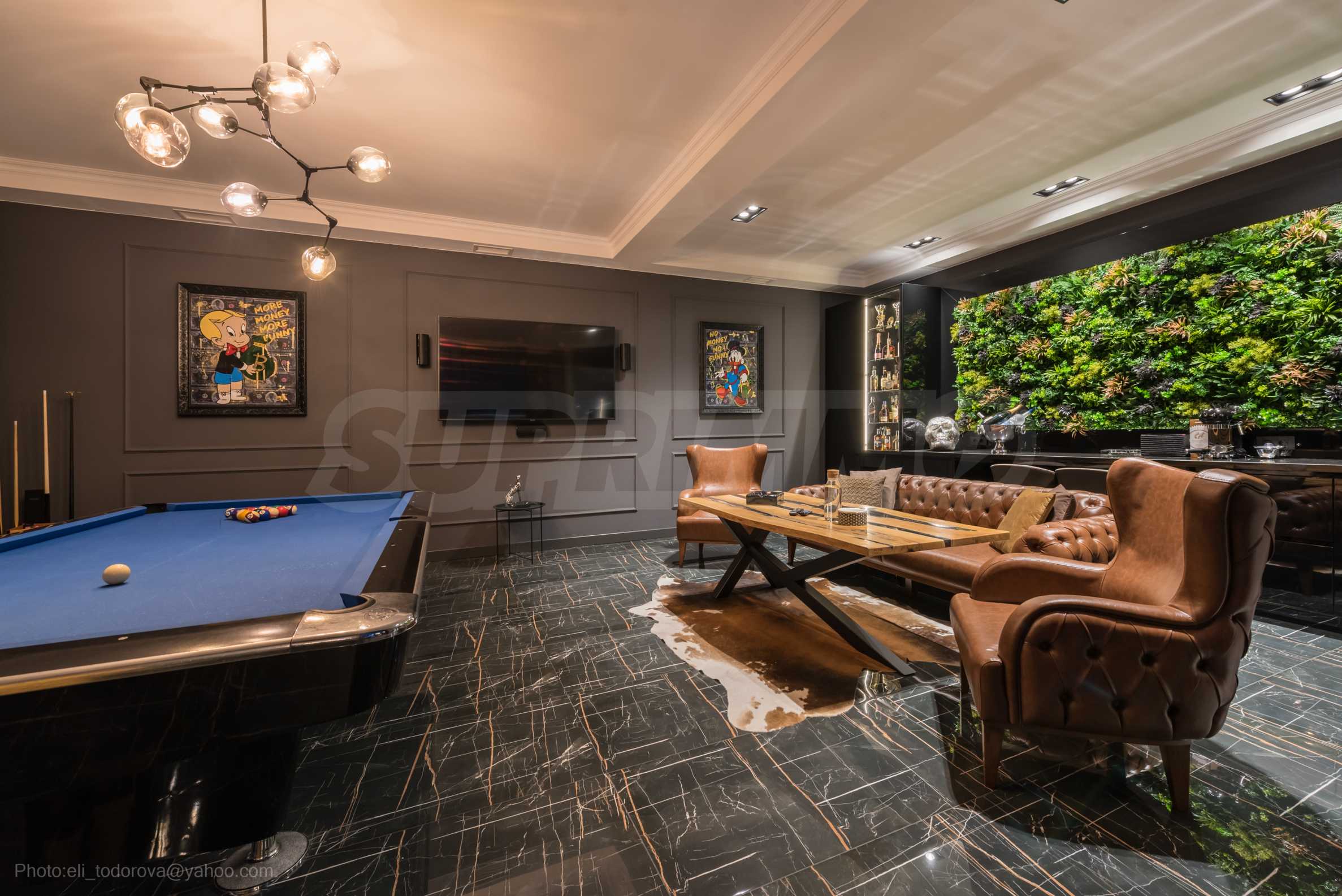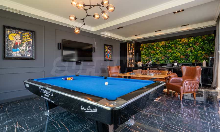Die erste Ebene des Anwesens besteht aus: einem Wohnzimmer mit Küche (77 qm), Hauswirtschaftsräumen, einem Schrank, einer massiven und wunderschön beleuchteten Treppe zum zweiten Stock und einem Raum für Unterhaltung und Entspannung, der sogenannten „Herrentoilette“ – 44 qm mit direktem Zugang zum Pool. Hier gibt es einen Billardtisch, eine Bar für Getränke und bequeme Sessel für Geschäftsgespräche und warum nicht einfach zum Entspannen.