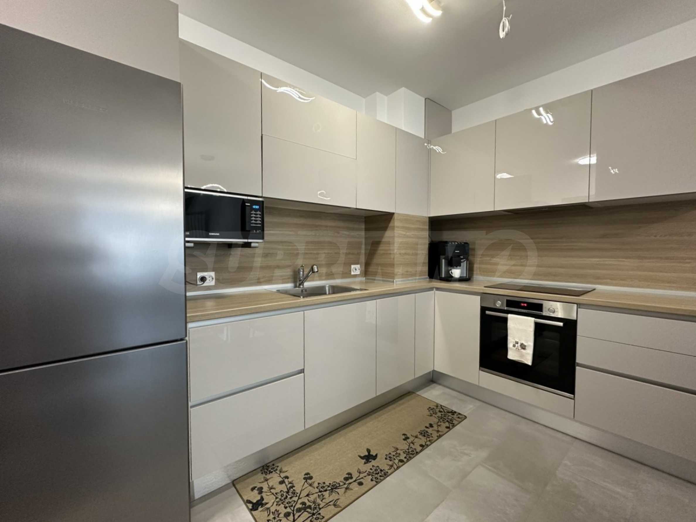 Die Wohnung besticht durch hochwertige Ausstattung, moderne Möbel und eine voll ausgestattete Küche mit Einbaugeräten, einer Bosch-Waschmaschine und einem Liebherr-Kühlschrank. Beheizt wird die Wohnung über eine Zentralheizung, und in jedem Zimmer ist zudem eine Mitsubishi-Klimaanlage installiert.