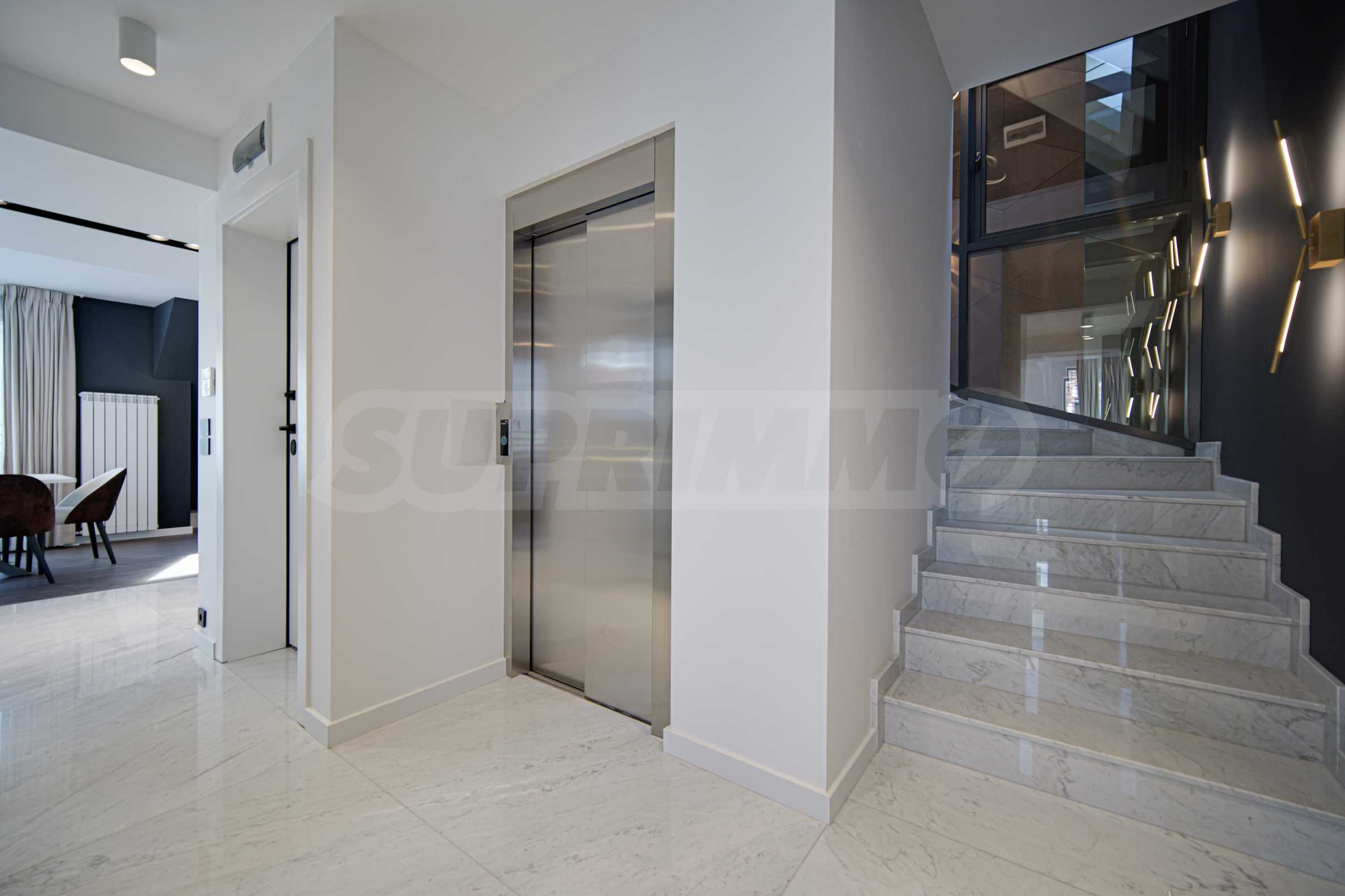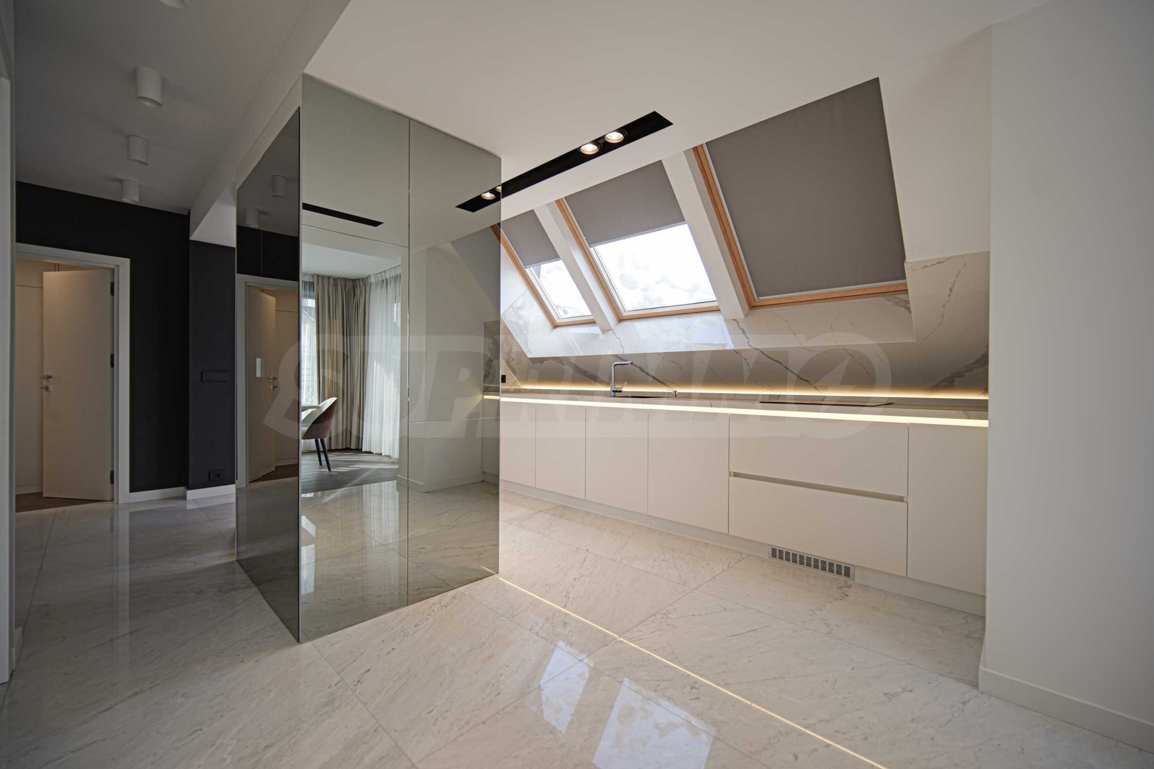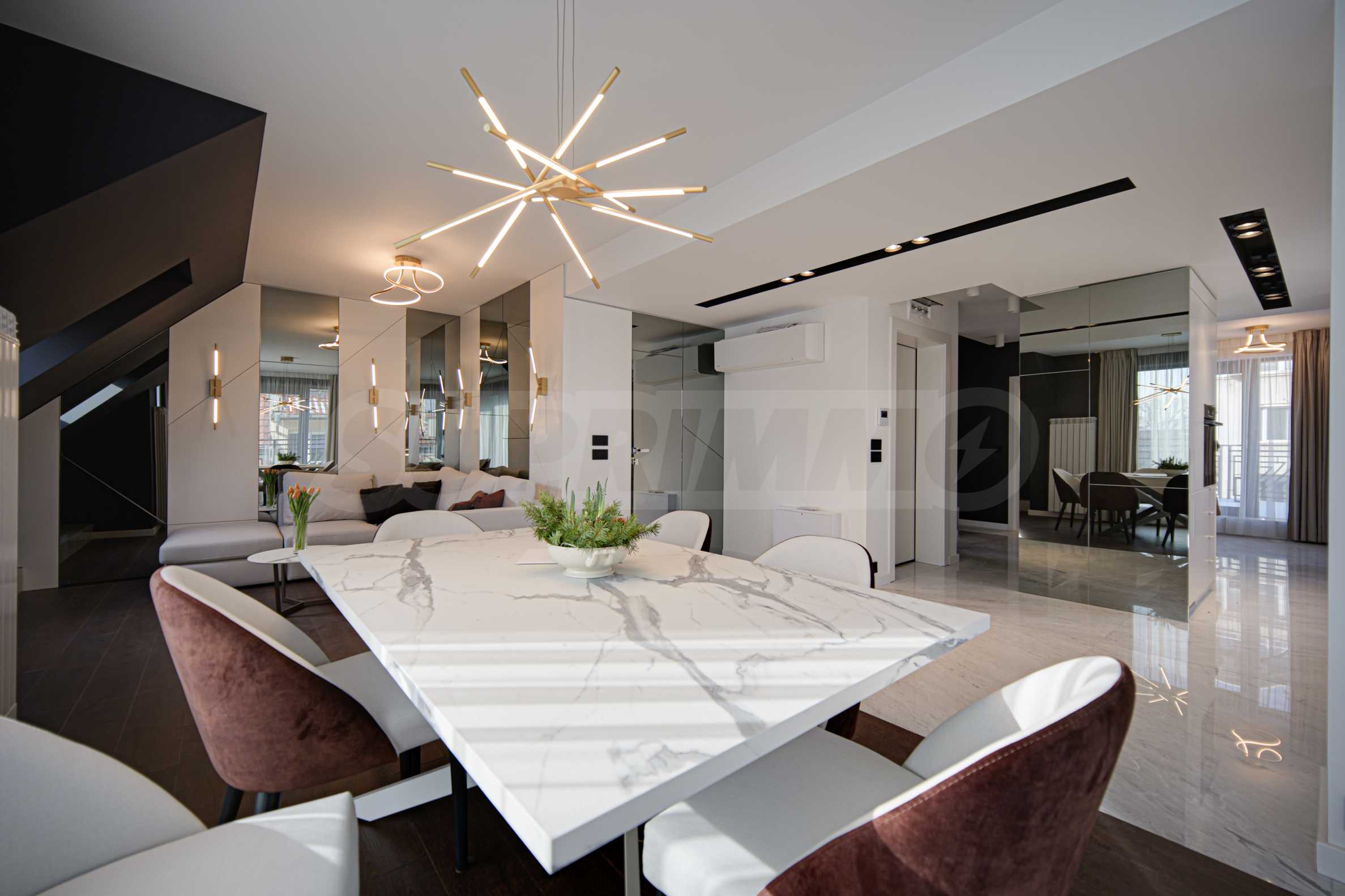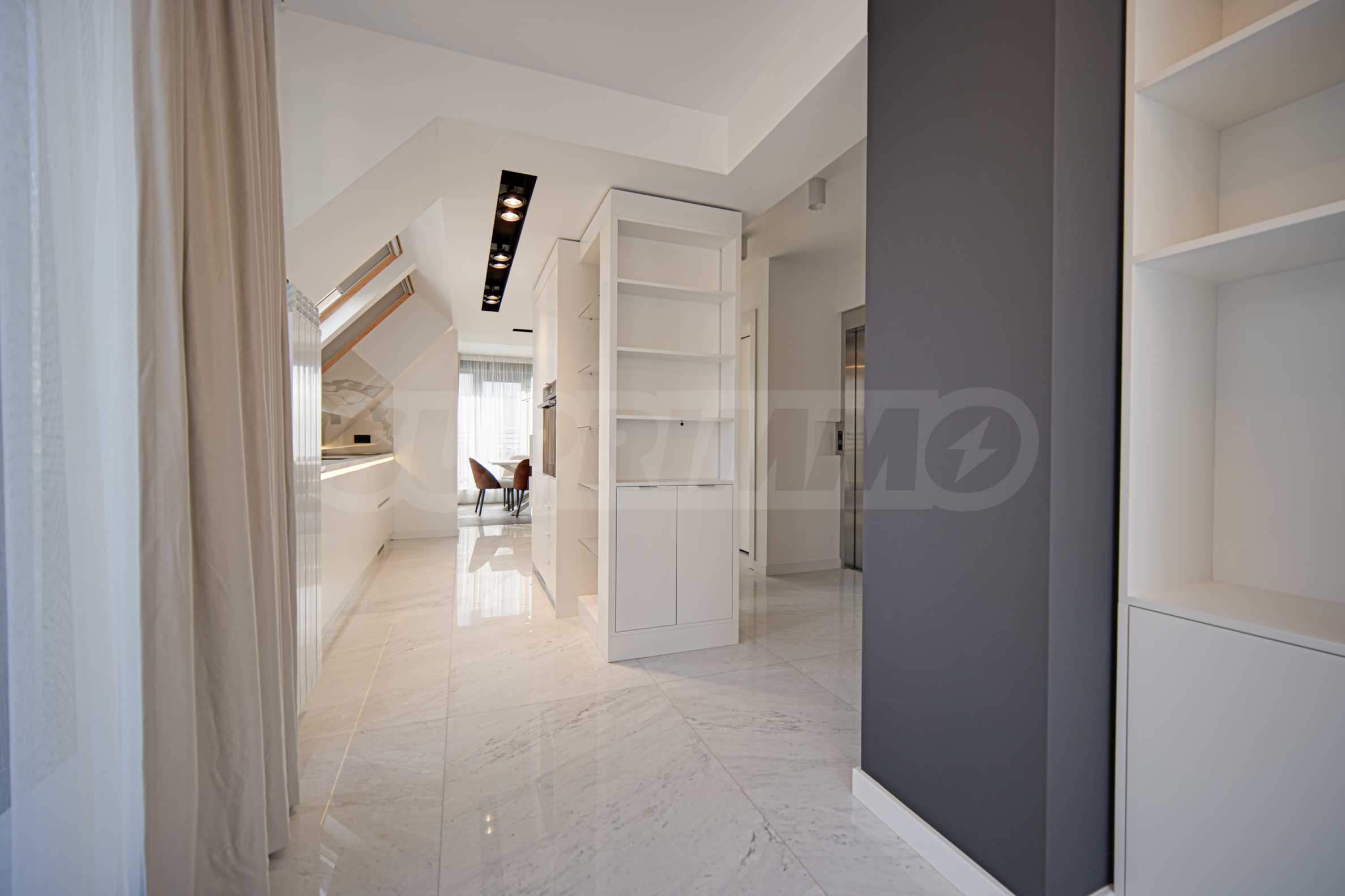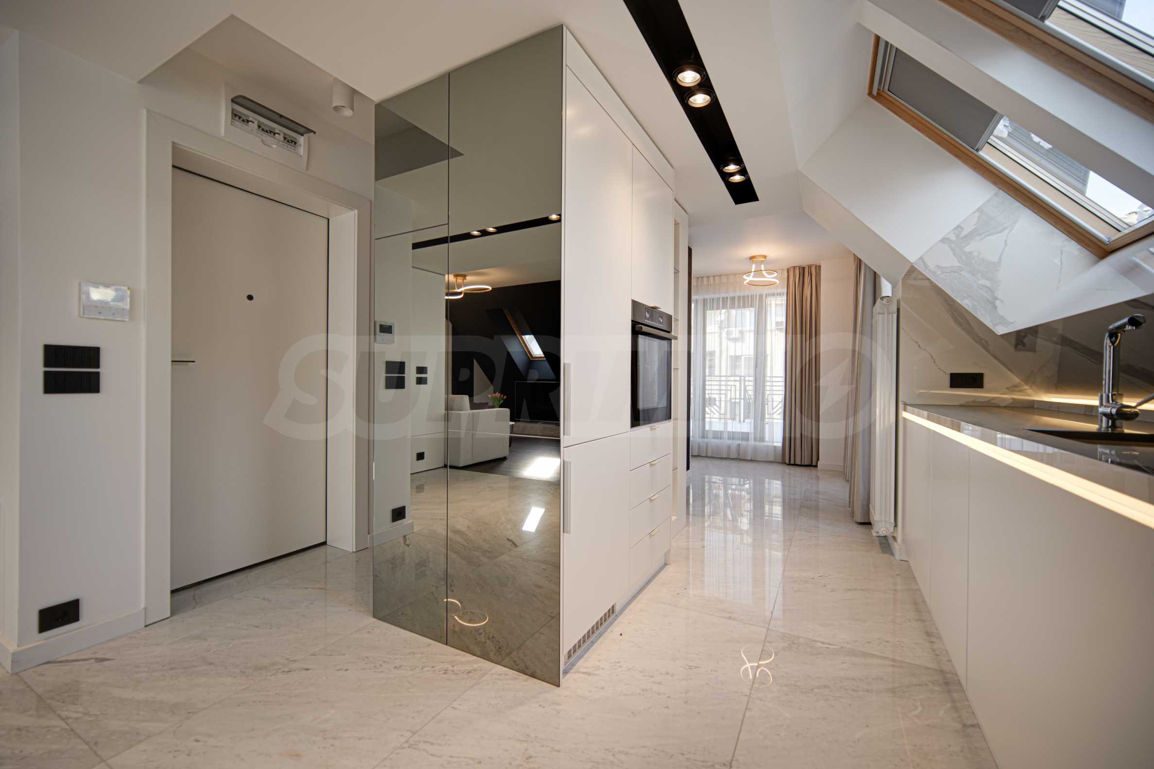 Die Wohnung verfügt über französische Fenster, die für viel Tageslicht sorgen. Die Inneneinrichtung ist elegant und mit Liebe zum Detail gestaltet. Die Böden bestehen aus Marmor und Naturparkett, die Möbel sind modern und die Küche ist komplett ausgestattet mit Kühlschrank, Cerankochfeld mit Dunstabzugshaube, Waschtrockner und großem Geschirrspüler.