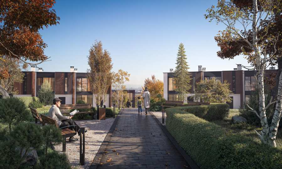• drei dreistöckige Mehrfamilienhäuser - Dreizimmerwohnungen in den obersten Stockwerken und Vierzimmerwohnungen mit Hof oder Terrassen;