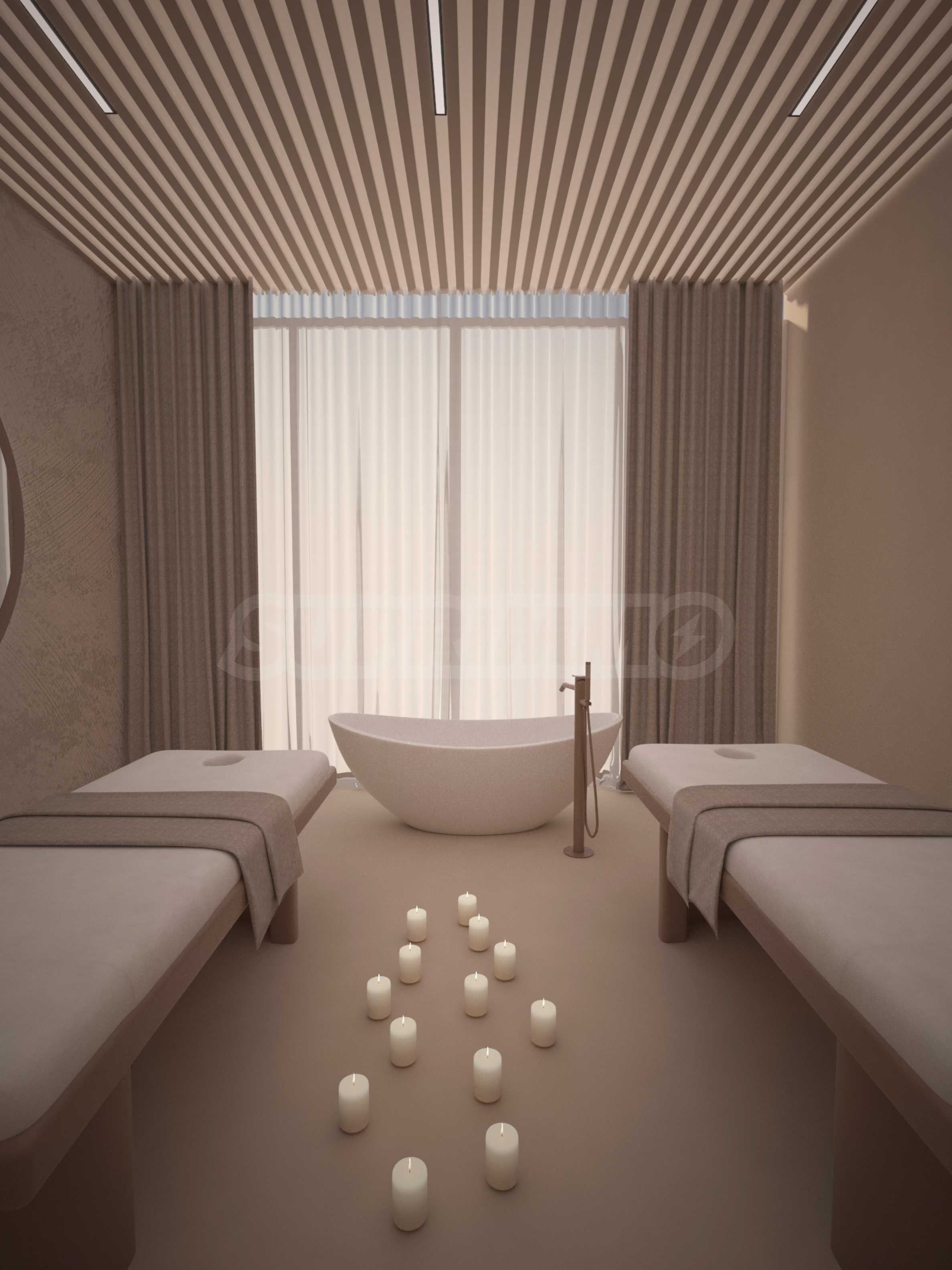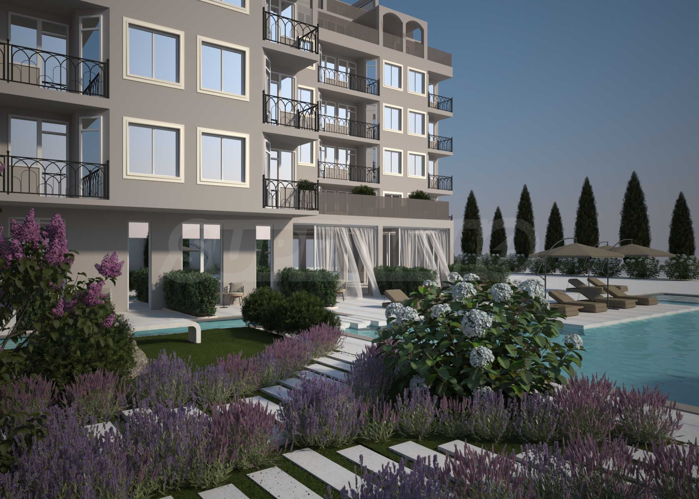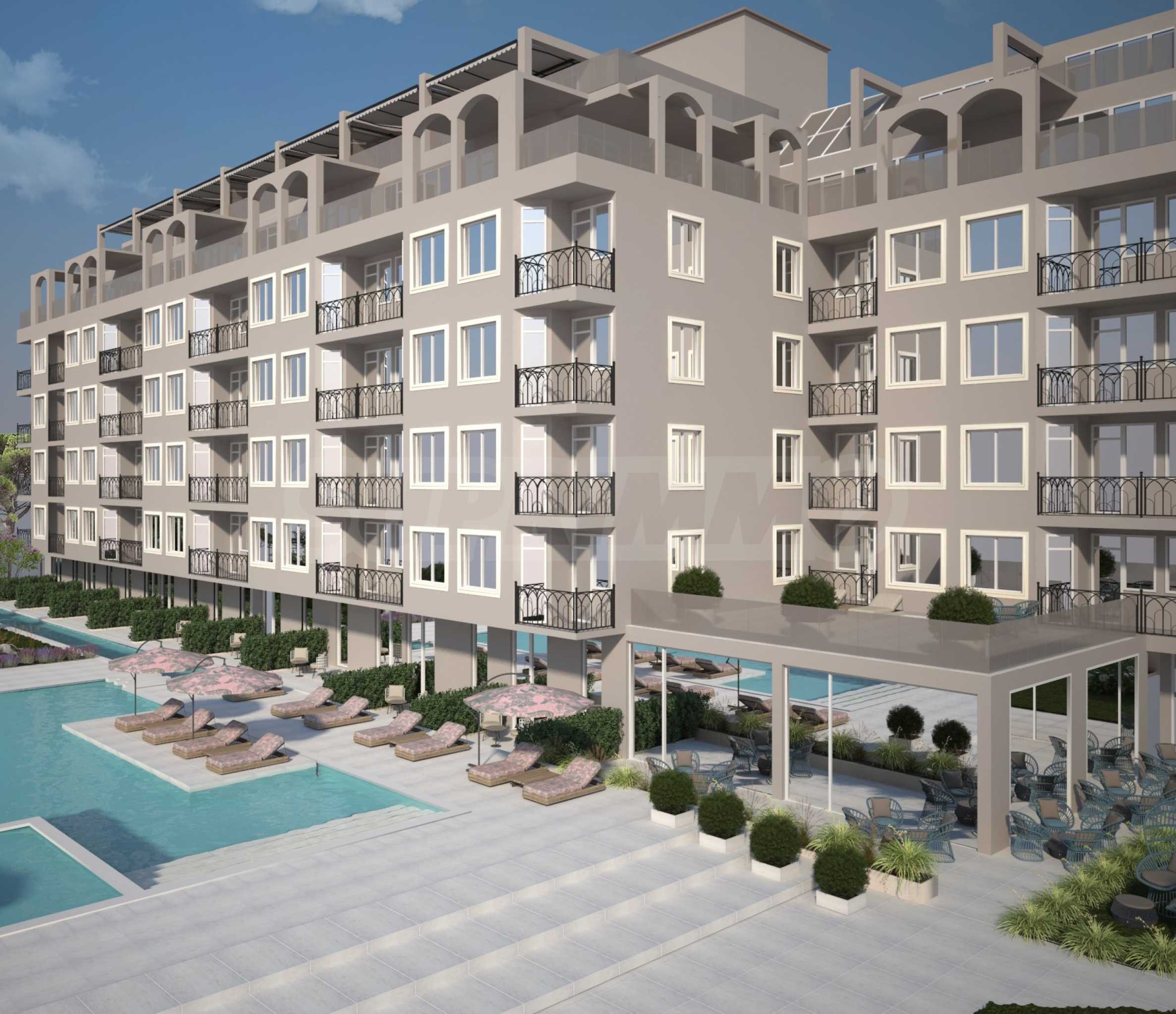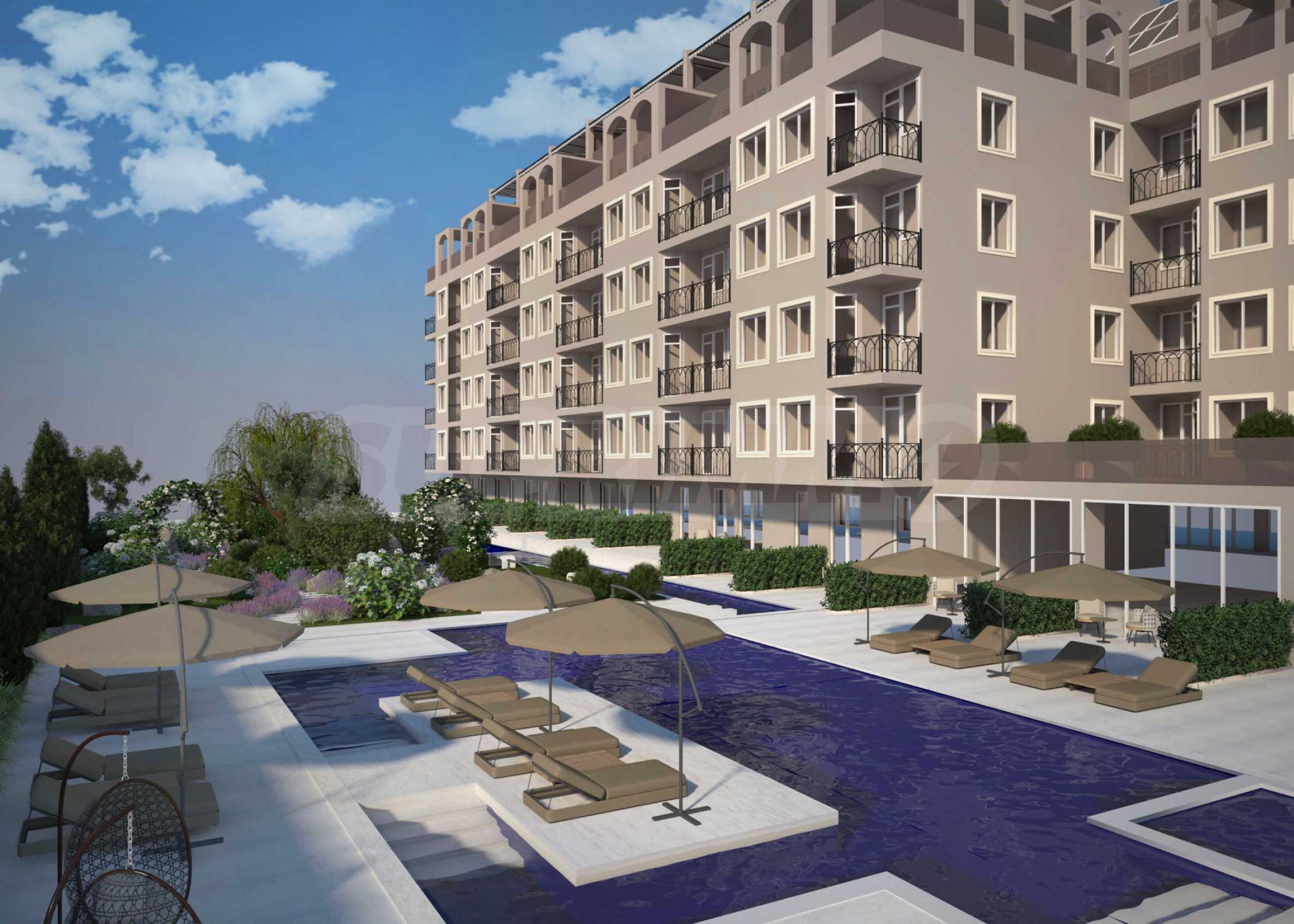 Der Komplex liegt nur 250 Meter vom Strand von Sonnenstrand entfernt, in unmittelbarer Nähe der attraktivsten Unterhaltungsmöglichkeiten Zazu und Bedroom Beach. Er ist von der französischen Riviera inspiriert und wird mit hochwertigen Materialien in sanften Pastelltönen ausgestattet und verfügt über Designerpools, üppige Landschaftsgestaltung, schöne Gärten und Erholungsbereiche.