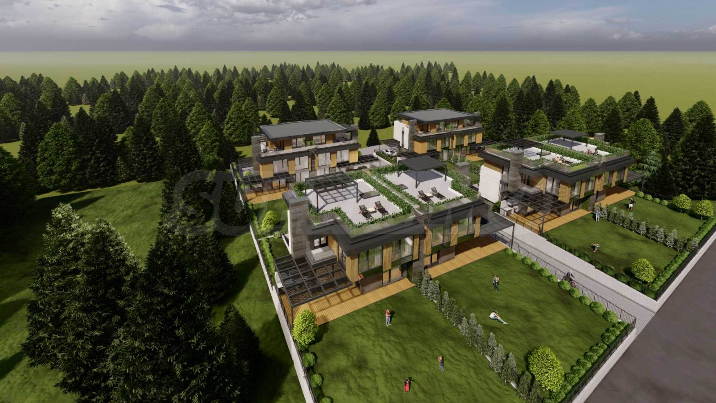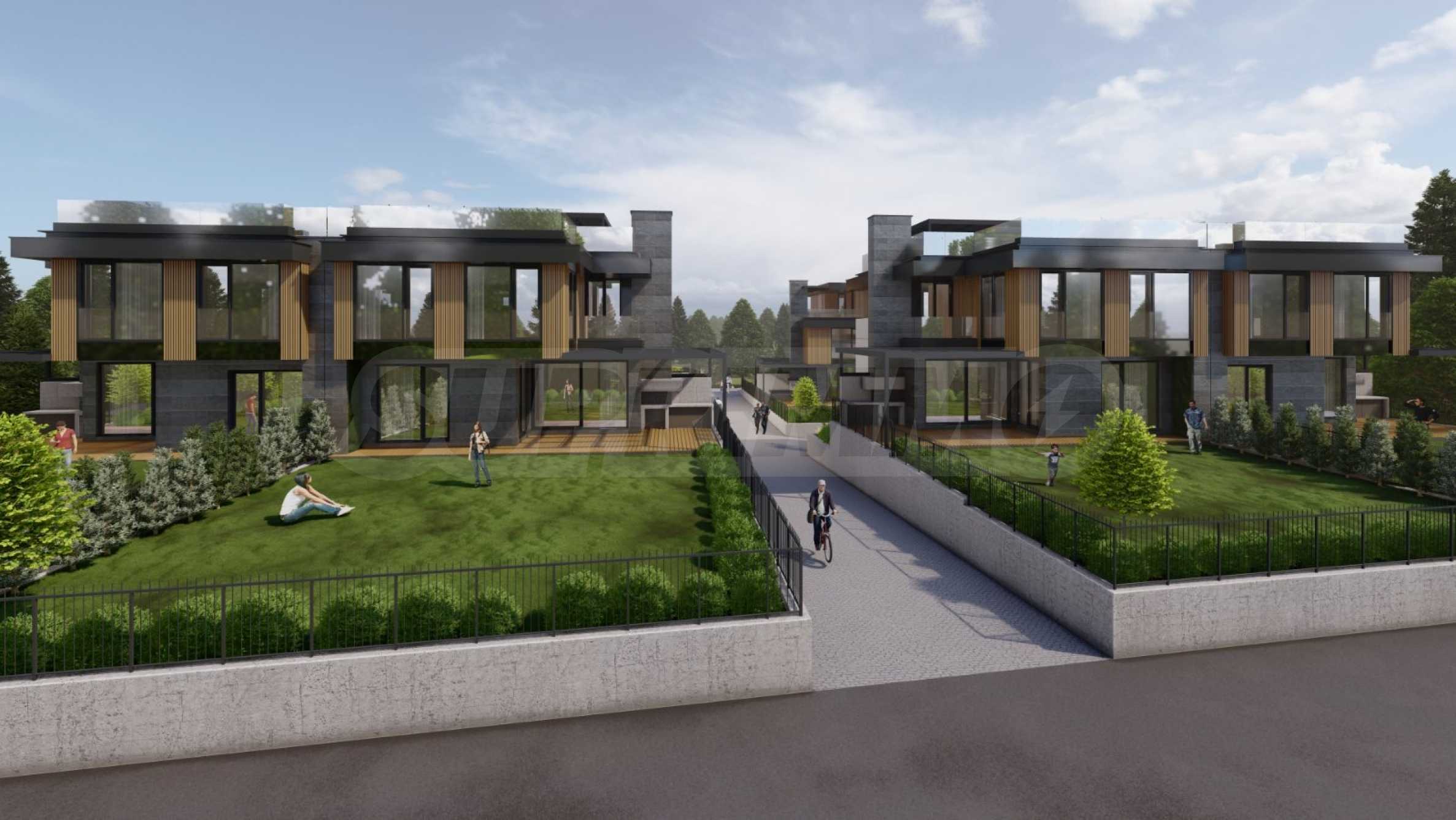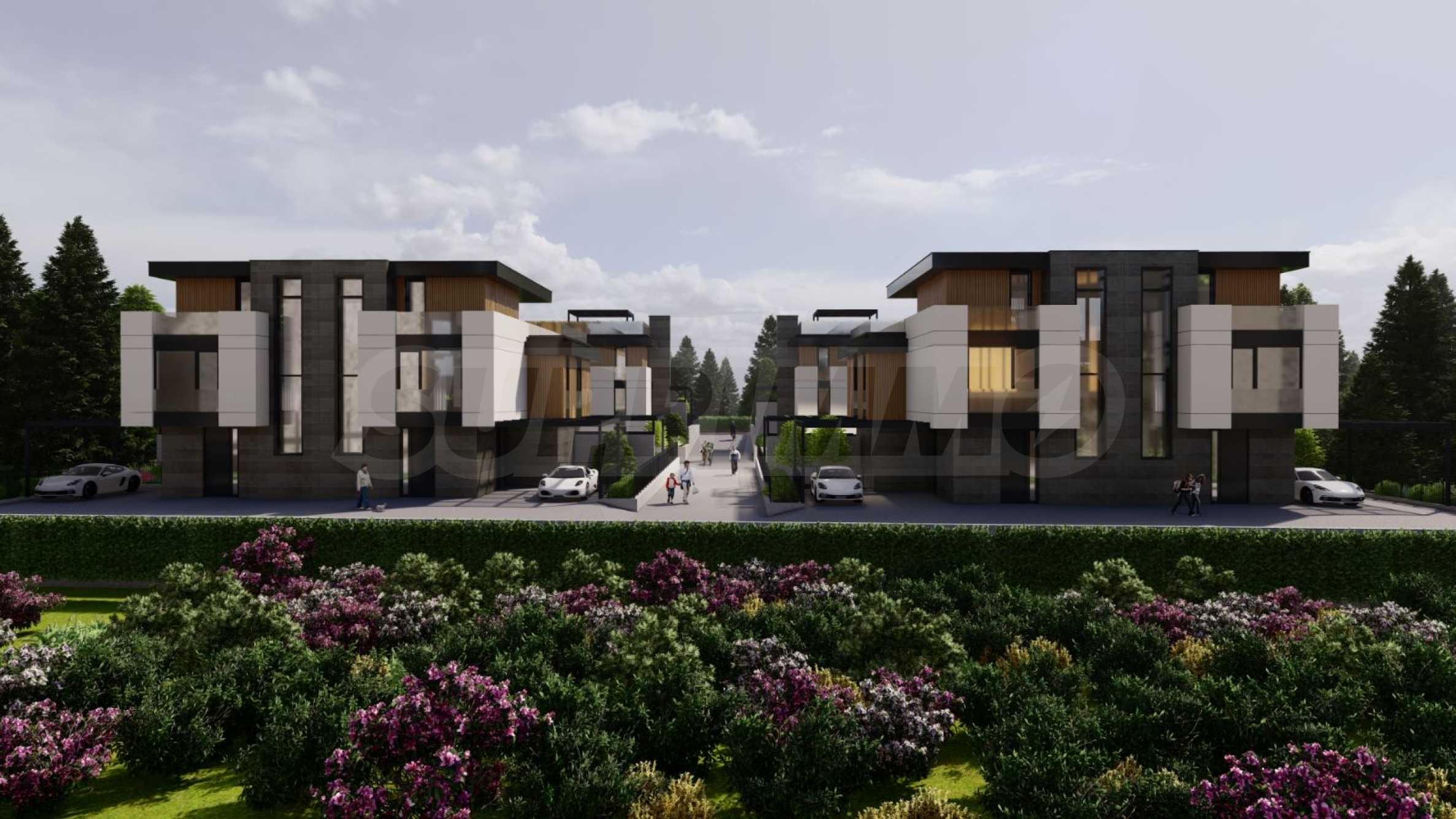 Die Häuser verfügen über eine moderne Architektur und funktionale Aufteilung, auf zwei und drei Etagen und unabhängige Gartenbereiche, drei/vier Schlafzimmer, drei Badezimmer, eine Garage für zwei Autos, mit einer Außenterrasse und einem Grillplatz.