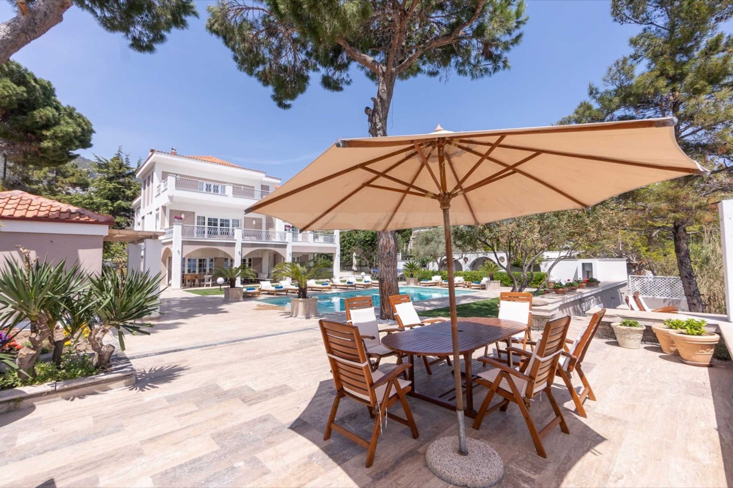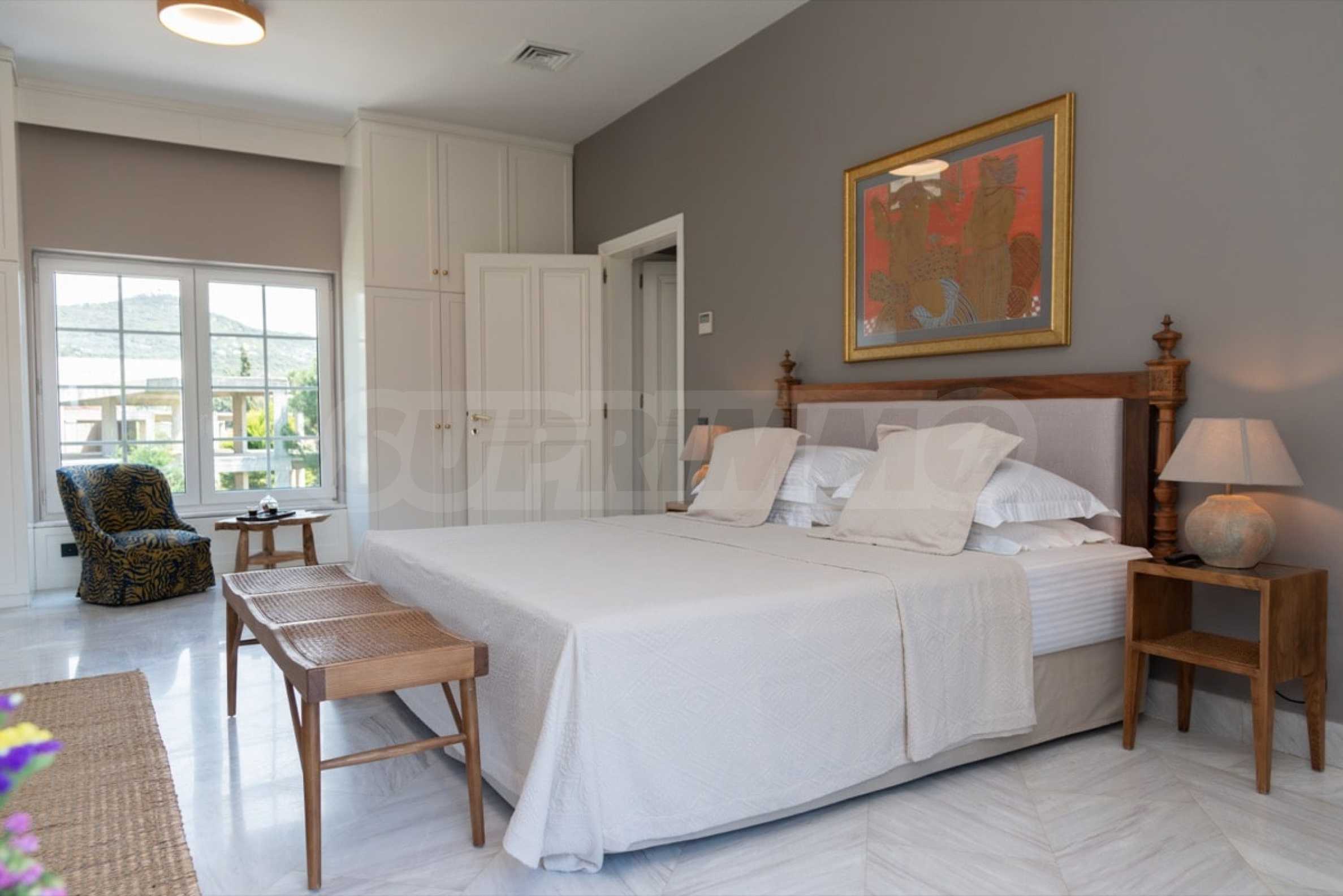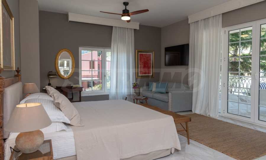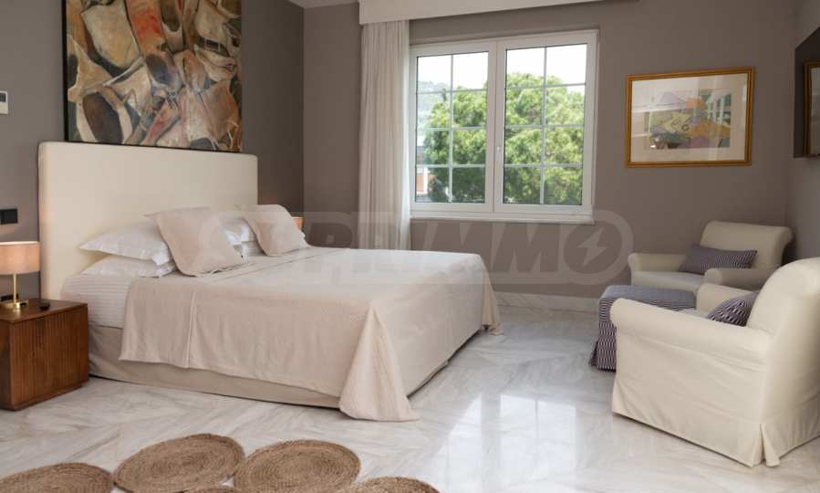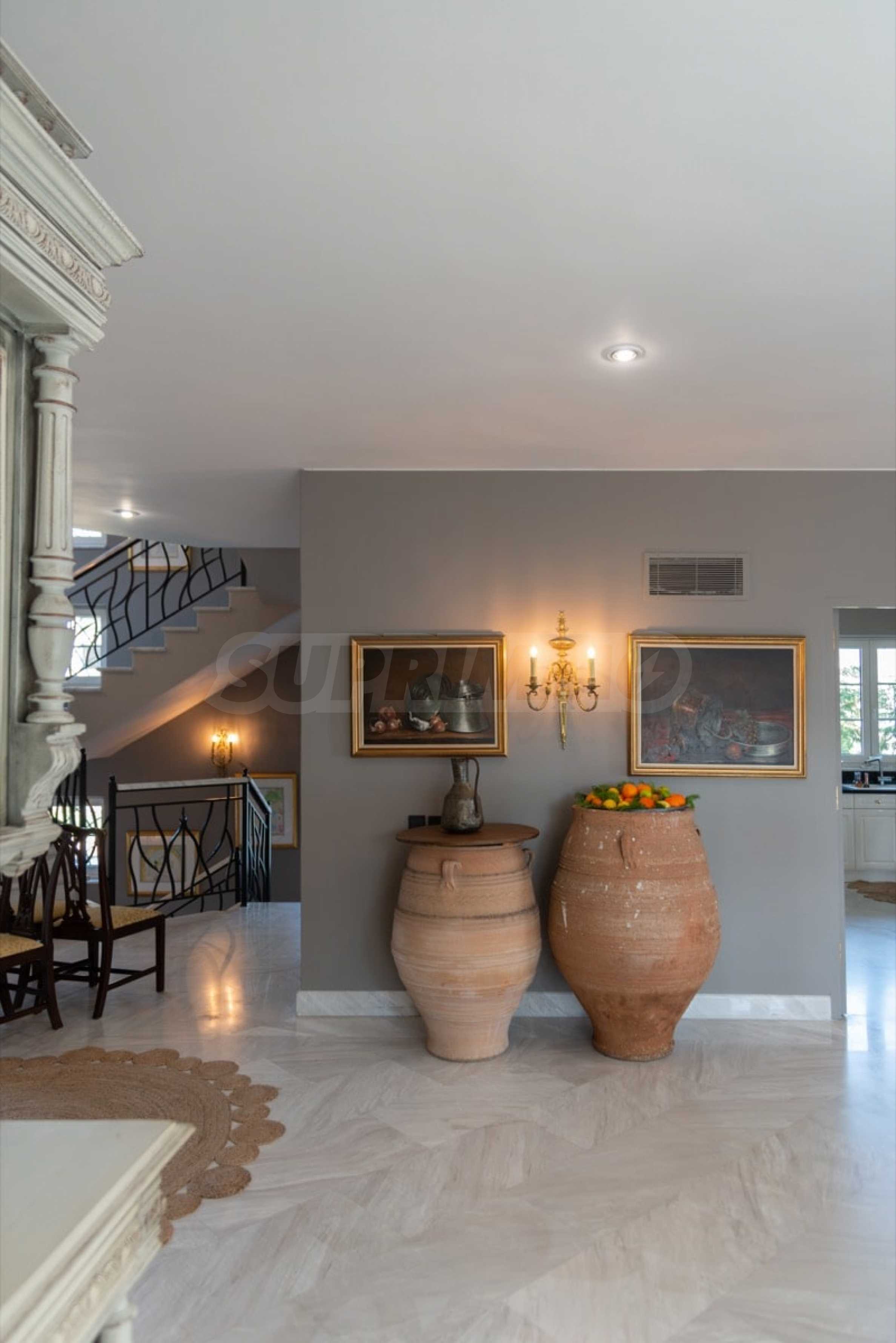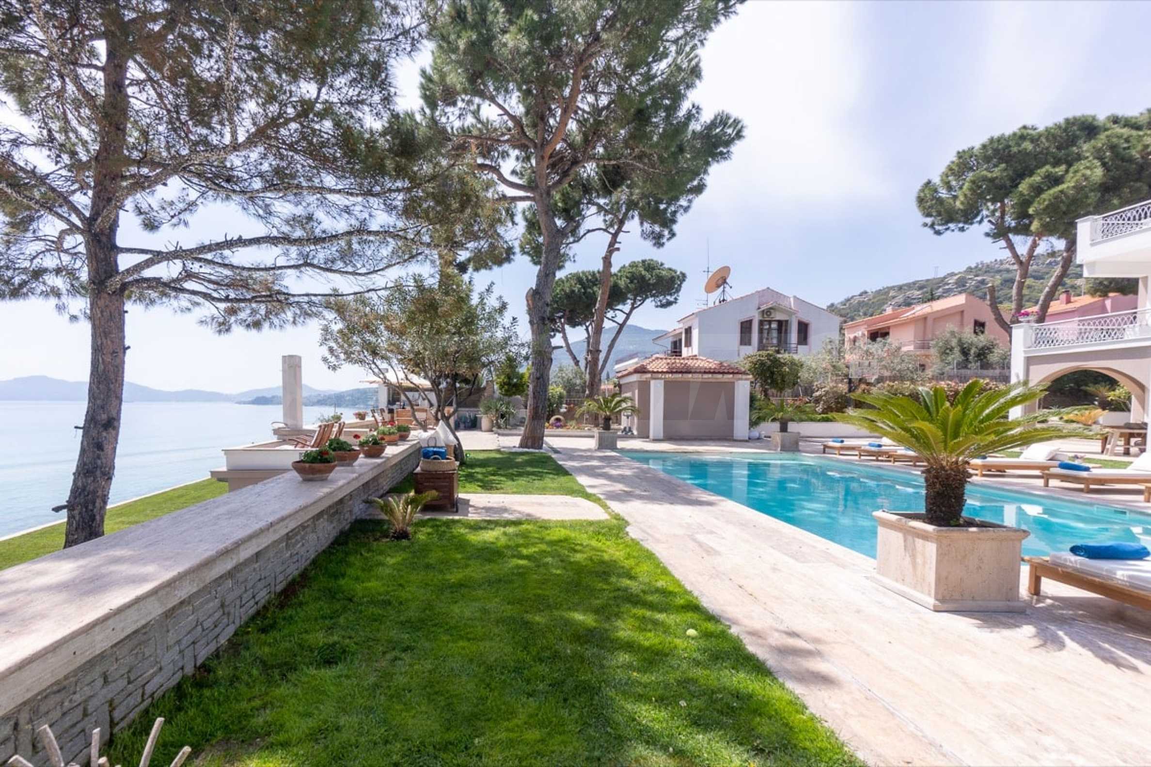 Kommen Sie und genießen Sie dieses herrliche Anwesen mit 6 Schlafzimmern, 8 Badezimmern, 2 Wohnzimmern und 2 voll ausgestatteten Küchen sowie einem Spielzimmer im Souterrain. Fünf der Schlafzimmer verfügen über ein eigenes Bad sowie einen Ruhebereich im Freien, eine Terrasse oder Veranda. Im perfekt gepflegten Garten mit verschiedenen Baumarten, Palmen, Pinien, Oliven, Orangen und Zitronen finden Sie einen Swimmingpool, eine Sommerküche mit Pizzaofen und Grill, ein Esszimmer und unzählige Ecken, die zum Genießen einladen die atemberaubende Aussicht auf das Ägäische Meer.