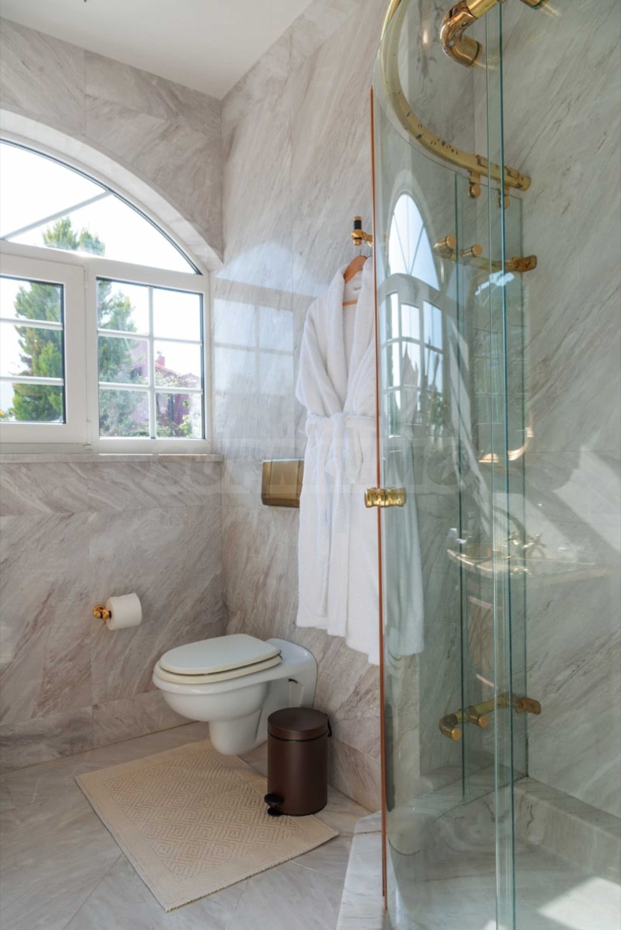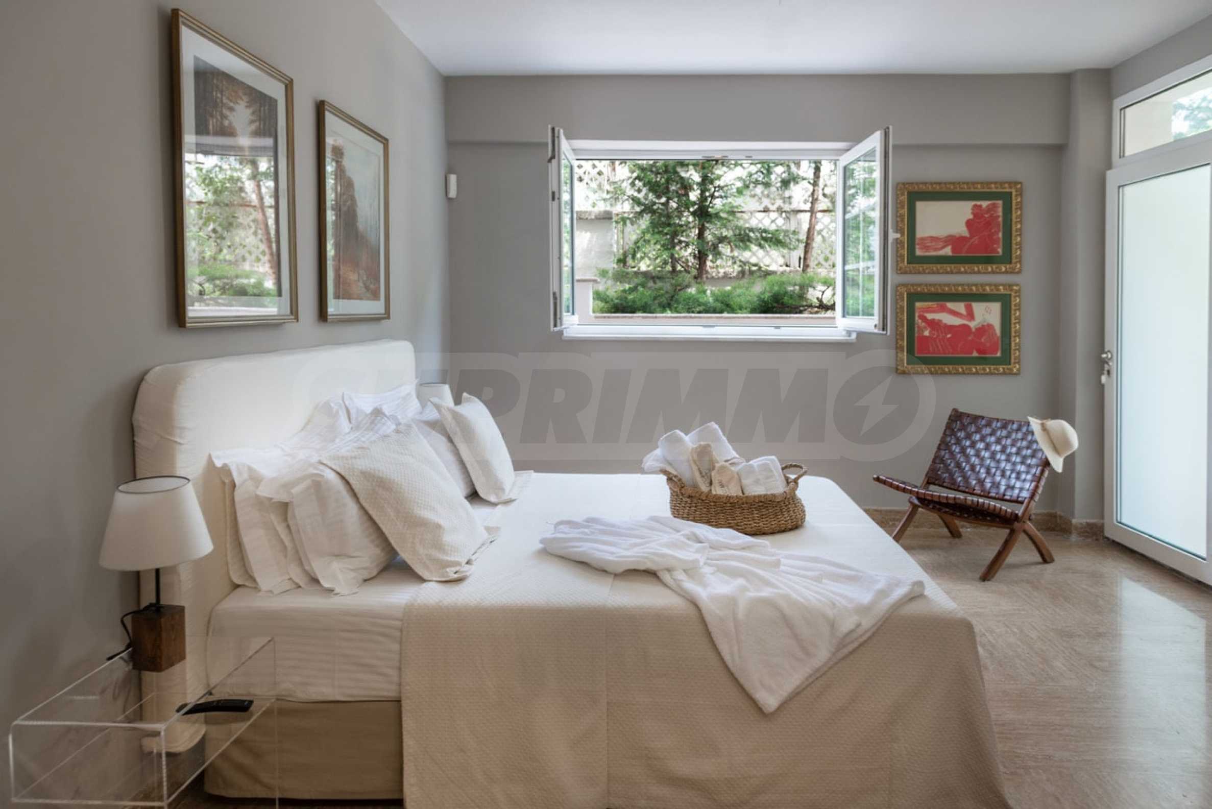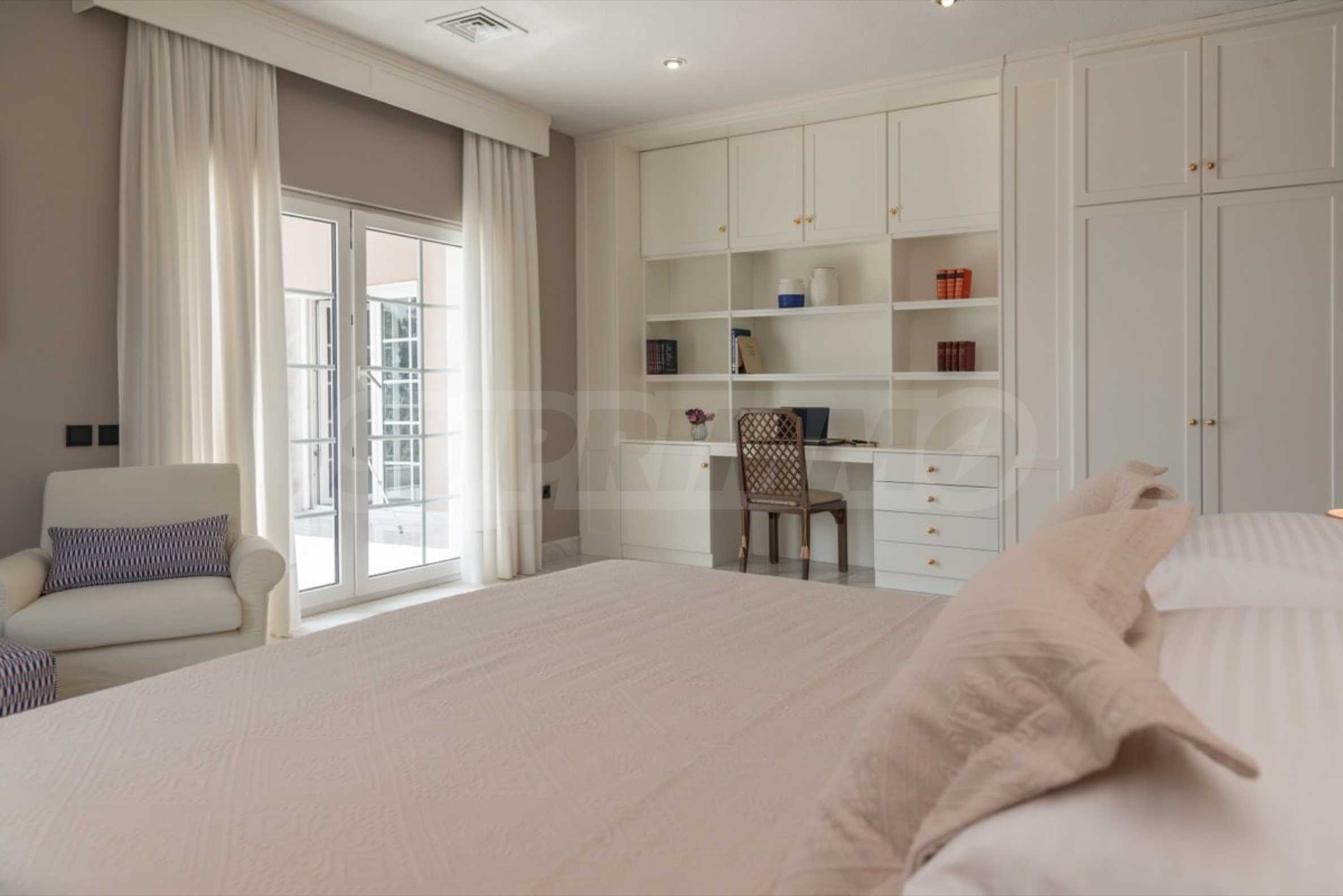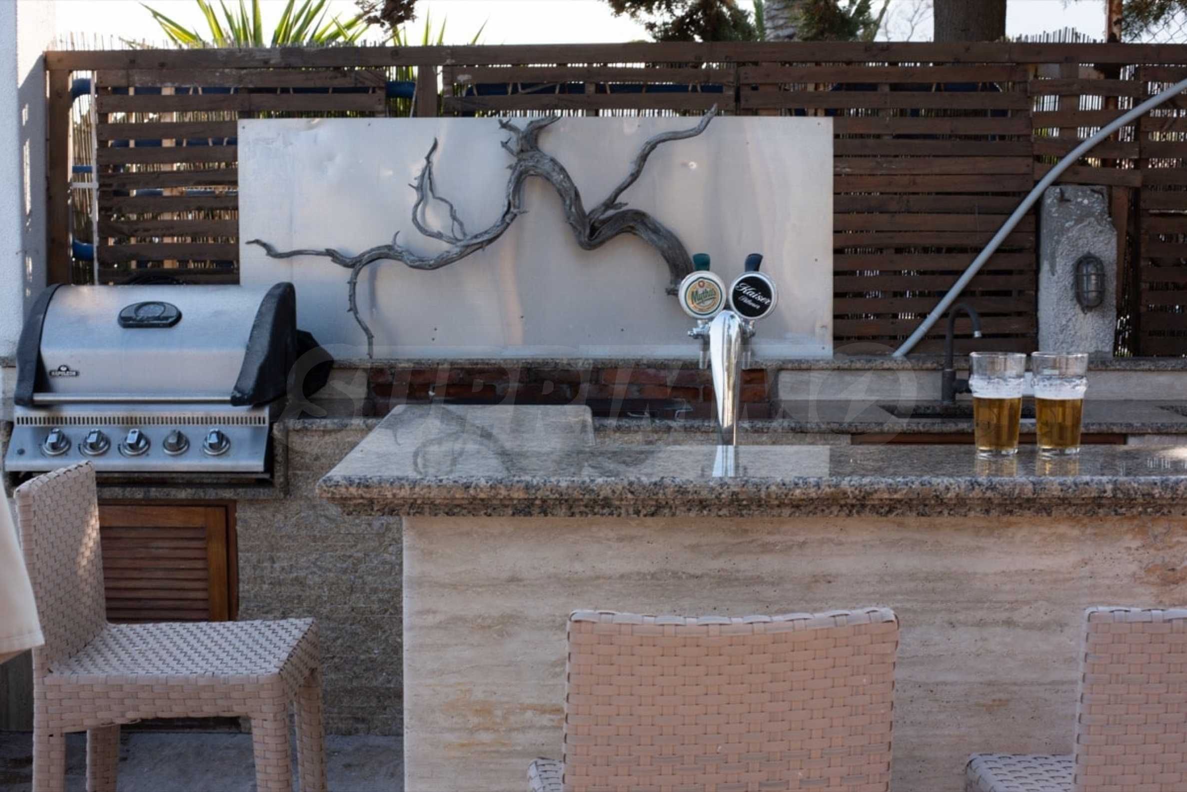 Kommen Sie und genießen Sie dieses herrliche Anwesen mit 6 Schlafzimmern, 8 Badezimmern, 2 Wohnzimmern und 2 voll ausgestatteten Küchen sowie einem Spielzimmer im Souterrain. Fünf der Schlafzimmer verfügen über ein eigenes Bad sowie einen Ruhebereich im Freien, eine Terrasse oder Veranda. Im perfekt gepflegten Garten mit verschiedenen Baumarten, Palmen, Pinien, Oliven, Orangen und Zitronen finden Sie einen Swimmingpool, eine Sommerküche mit Pizzaofen und Grill, ein Esszimmer und unzählige Ecken, die zum Genießen einladen die atemberaubende Aussicht auf das Ägäische Meer.