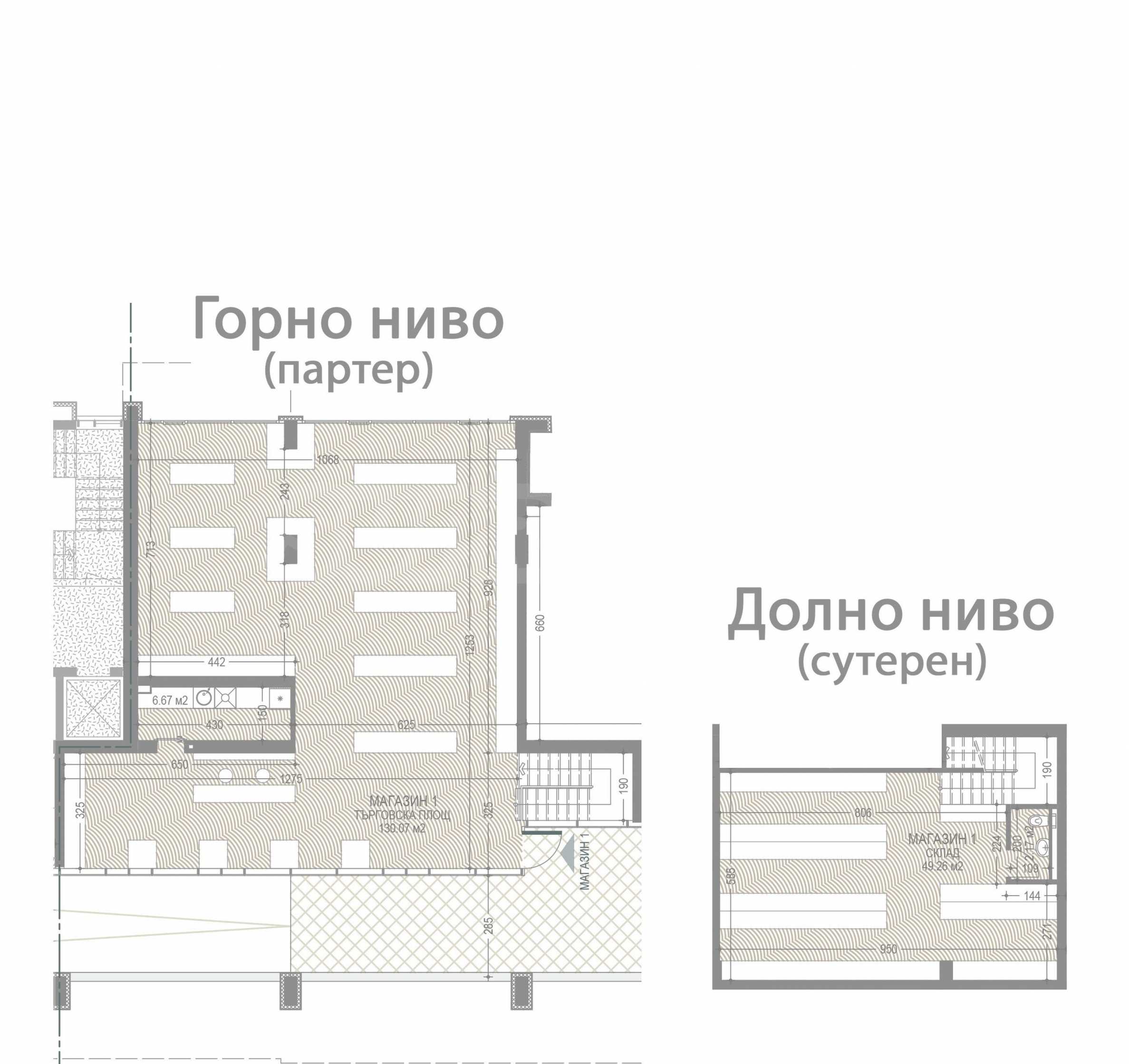 Im Gewerbegebiet des Gebäudes befinden sich insgesamt 5 Gewerbebetriebe. Sie sind auf 2 Ebenen organisiert (mit Ausnahme des kleinsten Objekts, das sich auf einer Ebene befindet). Die obere Ebene befindet sich im Erdgeschoss des Gebäudes (Etage „0“), die untere Ebene im ersten Untergeschoss des Gebäudes (Etage „-1“). Die beiden Ebenen sind durch eine für jedes Objekt individuelle Innentreppe verbunden. Die Eingänge zu den Gewerbebetrieben befinden sich jeweils direkt im Erdgeschoss des Gebäudes und sind direkt von der Straße aus zugänglich. Der Gewerbebereich selbst ist von den Eingängen zu den Wohn- und Büroteilen des Gebäudes getrennt. Die verfügbaren Ladenflächen reichen von 106,32 m² bis 259,76 m², inklusive Gemeinschaftsflächen. Die Haupt- und größeren Ladenfronten der Gewerbebetriebe befinden sich im Erdgeschoss, gegenüber der Westfassade des Gebäudes, vom Simeonovsko Shosse Blvd. Die Objekte verfügen außerdem über kleine Ladenfronten auf der anderen, östlichen Seite des Gebäudes, sodass sie von beiden Längsfassaden des Gebäudes (Ost- und Westfassade) aus sichtbar sind.