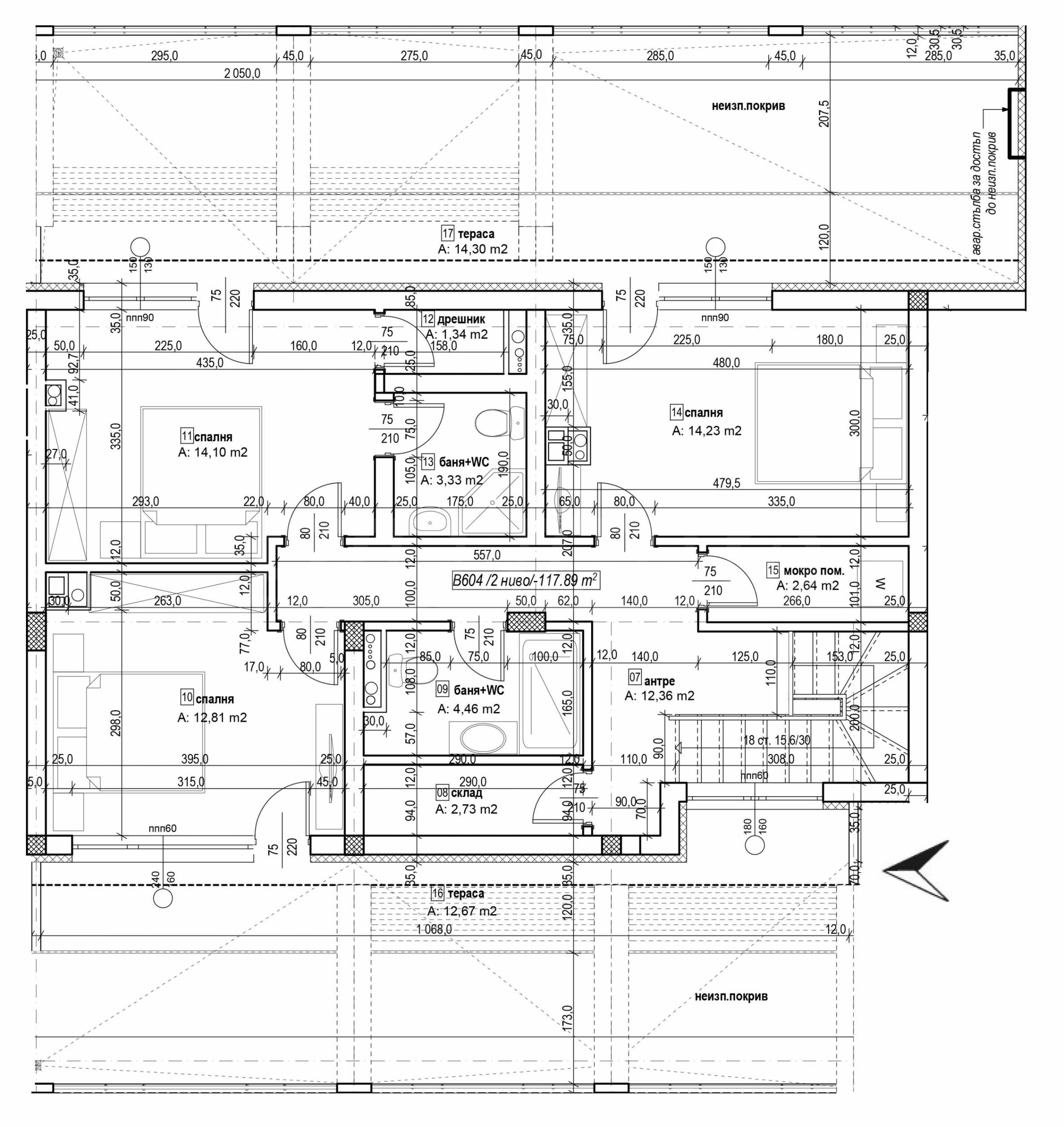 - zweite Ebene – 117,89 m²: drei Schlafzimmer, zwei Badezimmer/Toiletten, zwei Schränke, Waschküche, Flur, 2 Terrassen.