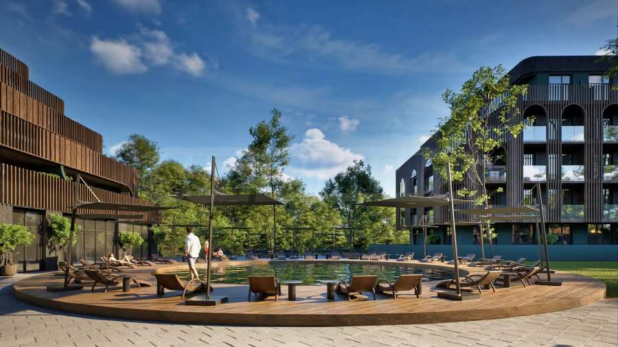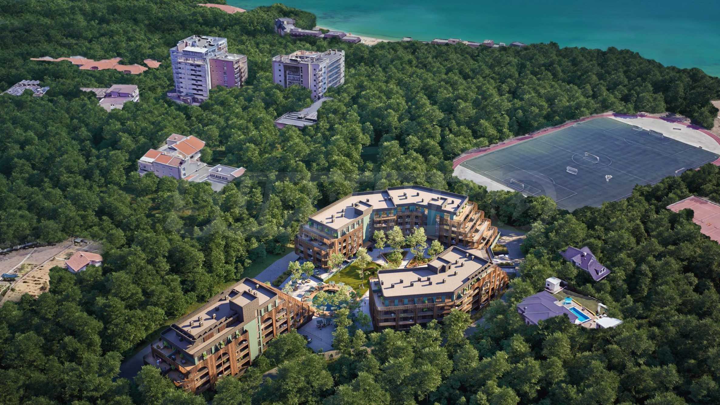 Der Komplex besteht aus vier 5-stöckigen Gebäuden und liegt 15 Minuten von den besten Stränden von Varna entfernt. Die Gesamtfläche des Projekts beträgt 15.000 qm. Es bietet Studios, Zweizimmer- und Dreizimmerwohnungen mit spektakulärem Blick auf das Meer auf der einen und den Eichenwald auf der anderen Seite. Drei der Gebäude werden durch einen Innenhof mit durchdachter Landschaftsgestaltung und Sitzgelegenheiten im Freien verbunden.