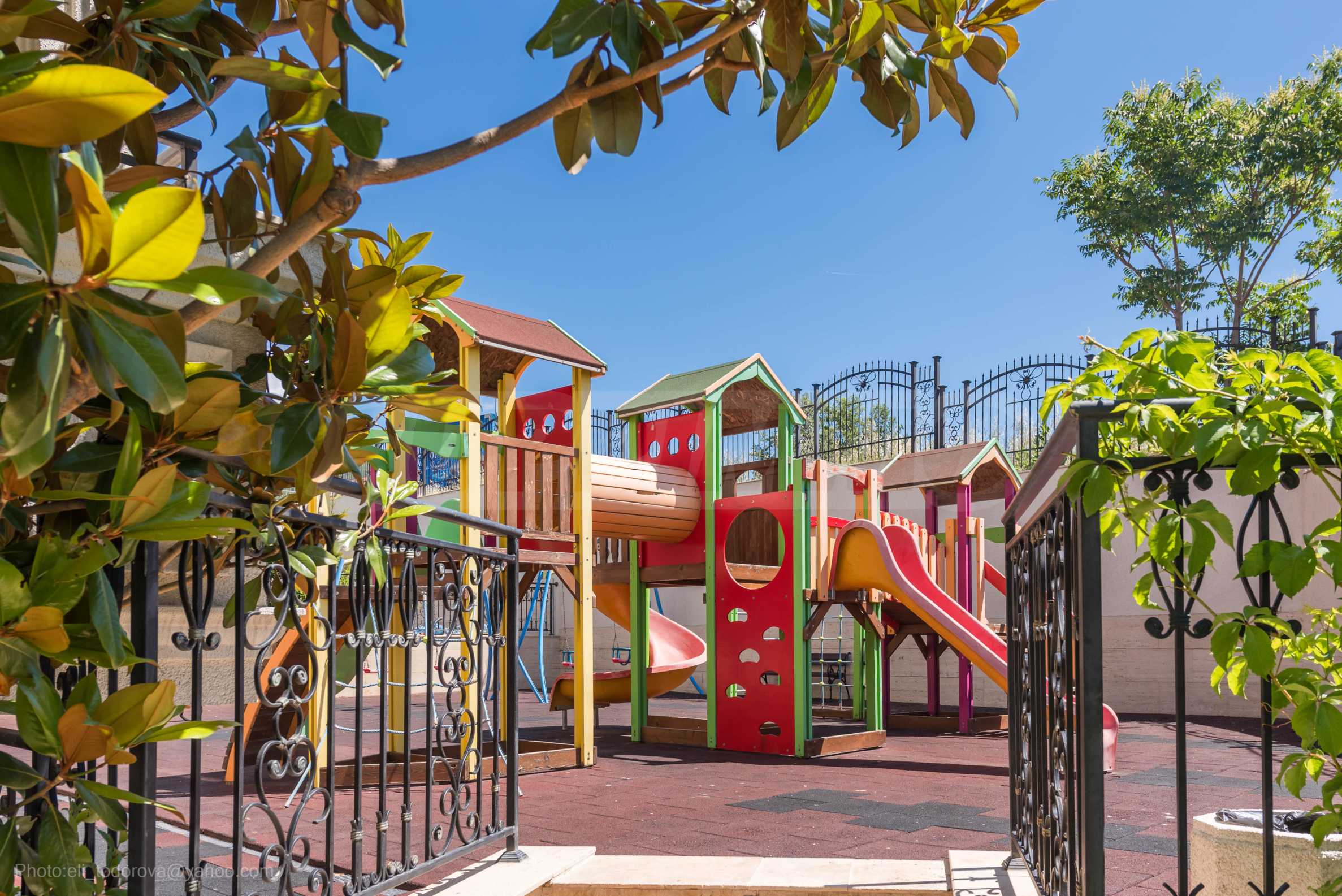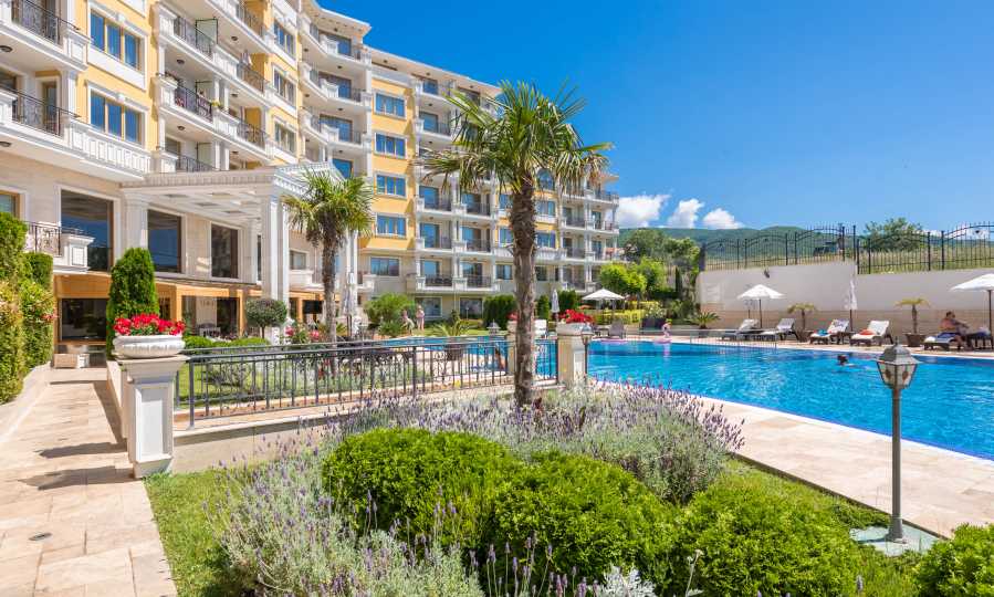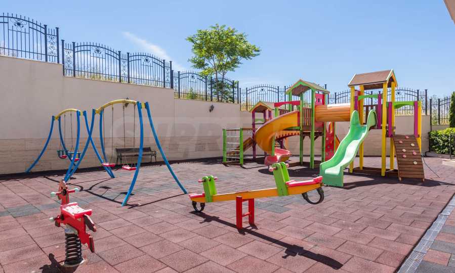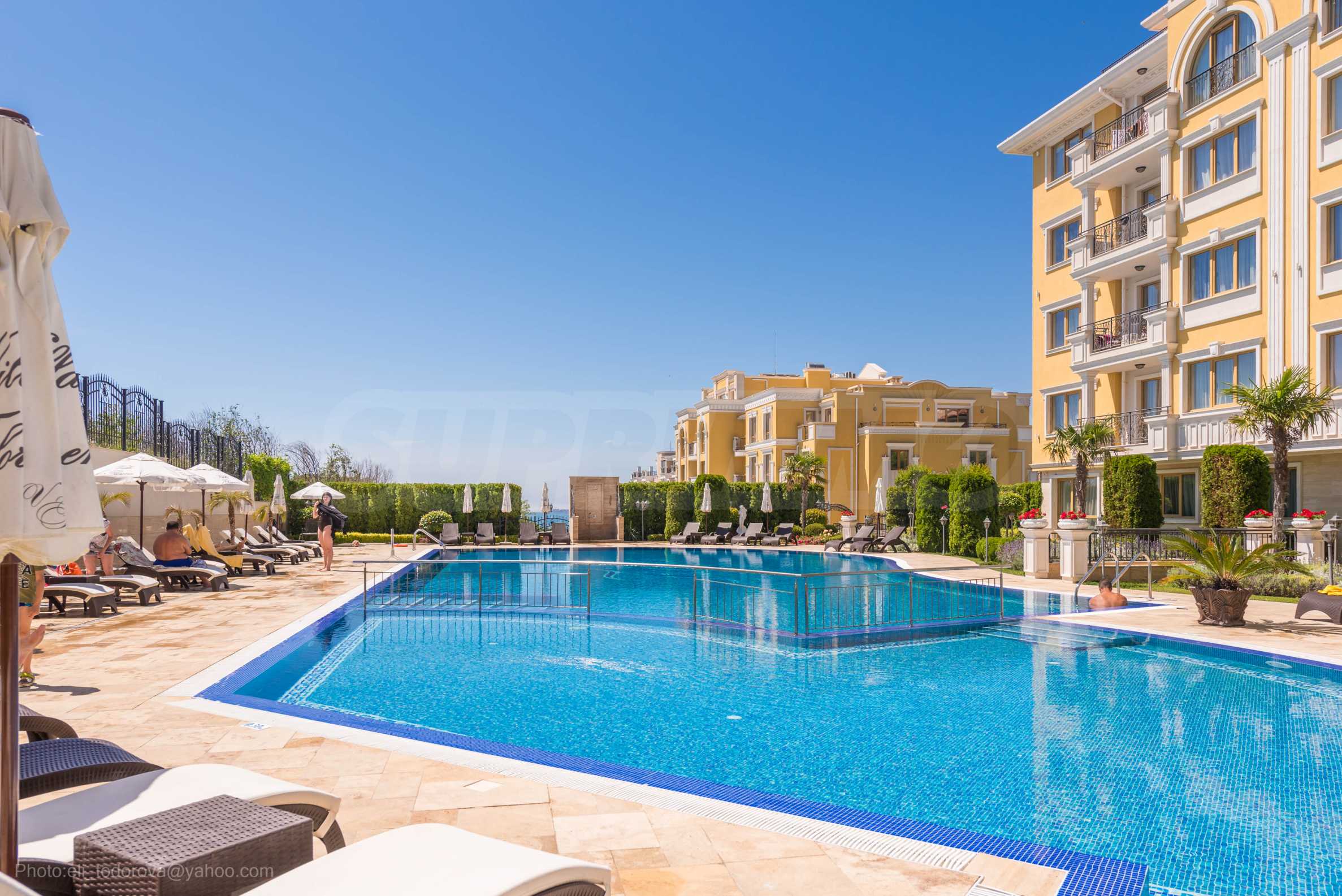 Die beiden Außenpools sind im Sommer von Mai bis September geöffnet. Für die Kinder wurde ein moderner Spielplatz gebaut und der Innenbereich des Komplexes mit einer Fläche von 6060 qm (Gebäude A 4330 qm + Gebäude B 1730 qm) ist gut gepflegt. Die beiden Gebäude des Komplexes verfügen über ein Untergeschoss mit Parkplätzen und Kellern, im größeren Gebäude befindet sich die Rezeption. Die Heizung erfolgt über Wärmepumpen und Klimaanlagen, was auch in den kalten Wintermonaten für eine angenehm warme Umgebung sorgt.