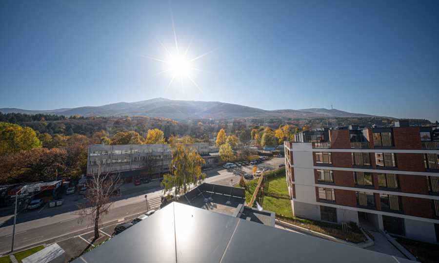 Die Wohnungen im Komplex sind auf unterschiedliche Bedürfnisse zugeschnitten – zum Verkauf stehen Objekte mit ein, zwei, drei und vier Schlafzimmern, wobei die Erdgeschosswohnungen über einen eigenen Innenhof verfügen. Die Wohnungen zeichnen sich durch funktionale Grundrisse und großzügige Räume aus. Die Panoramafenster lassen viel Tageslicht herein und bieten einen beeindruckenden Blick auf die Berge und die Stadt. Zum Wohnraum gehört außerdem ein Keller.
