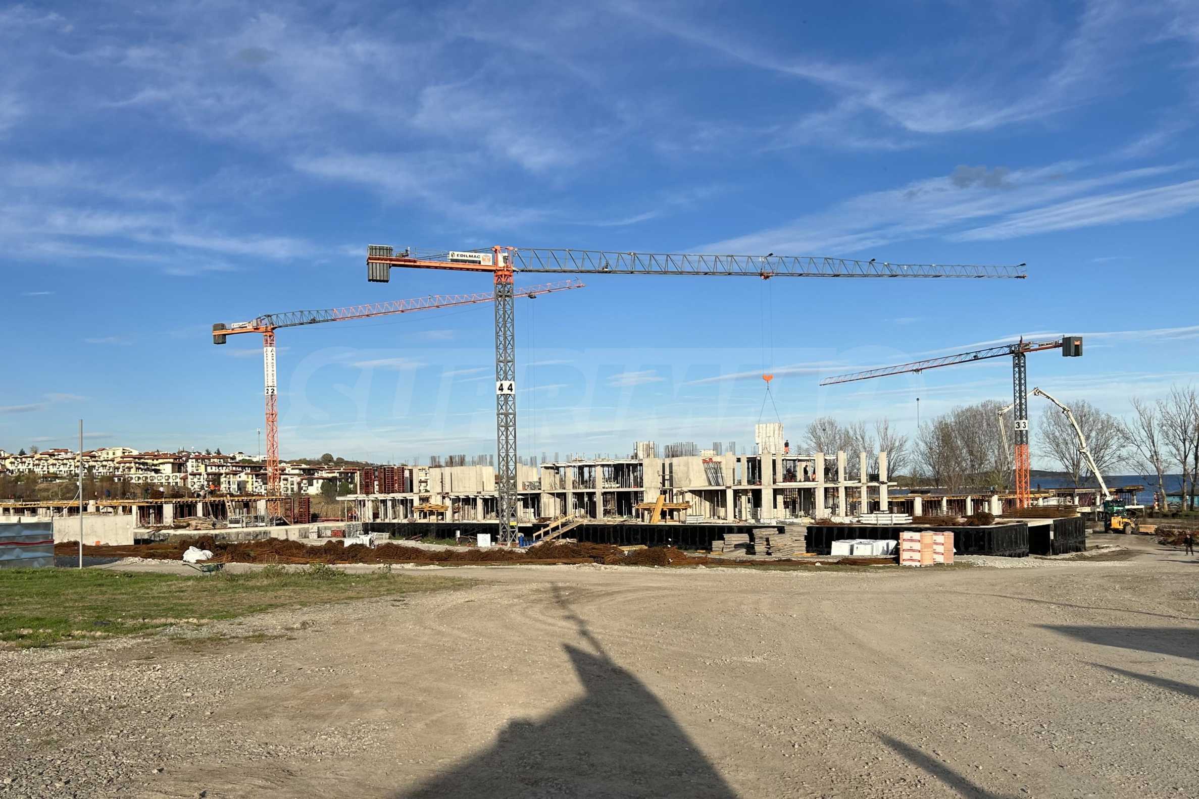 In der vierten Küstenlinie, nur 200 Meter Luftlinie vom Meer entfernt, wurden 5 Gebäude mit Schwimmbädern entworfen, jedes mit 4 Etagen plus Terrasse, mit kleineren Apartments - Studios und Zwei-Zimmer-Wohnungen, die sich im Fertigstellungszustand nach bulgarischen Baustandards befinden und optional möbliert werden können.