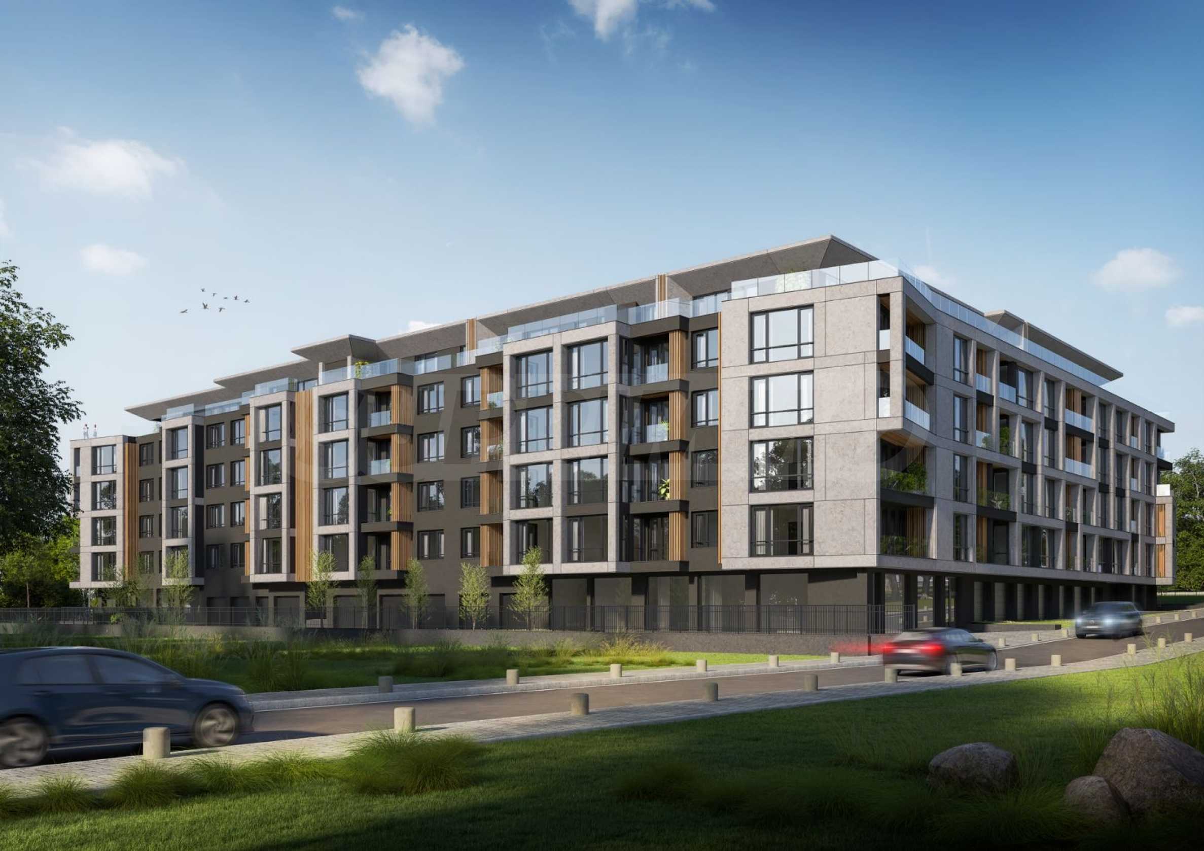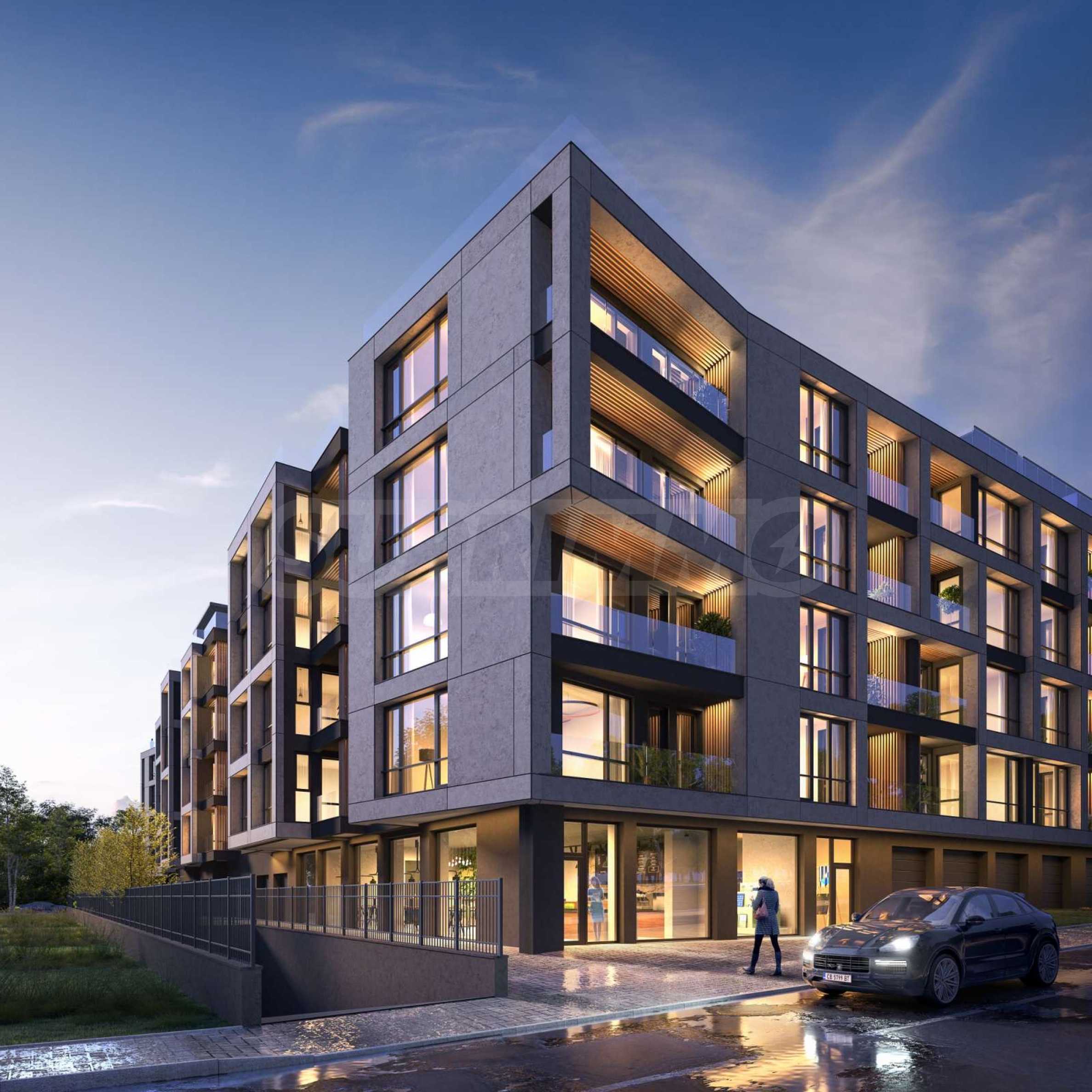 Die Konstruktion basiert auf einem geringen Anteil an Gleichteilen, hochwertigen Materialien und einer modernen architektonischen Vision. Die Fassade verfügt über klare Linien, eine Kombination aus Travertin und Holz sowie französische Fenster, die nicht nur viel natürliches Licht garantieren, sondern auch einen freien Blick auf den Vitosha-Berg und die Grünflächen rund um den Komplex gewährleisten. Den Eigentümern steht ein reich angelegter Garten mit Spazierwegen und Plätzen zum Entspannen zur Verfügung, der durch hohe und niedrige Vegetation und einen 90 m langen Fluss geprägt ist, sowie begrenzten Zugang für mehr Sicherheit und Ruhe. Das Parken wird mit Tiefgaragenstellplätzen gelöst.