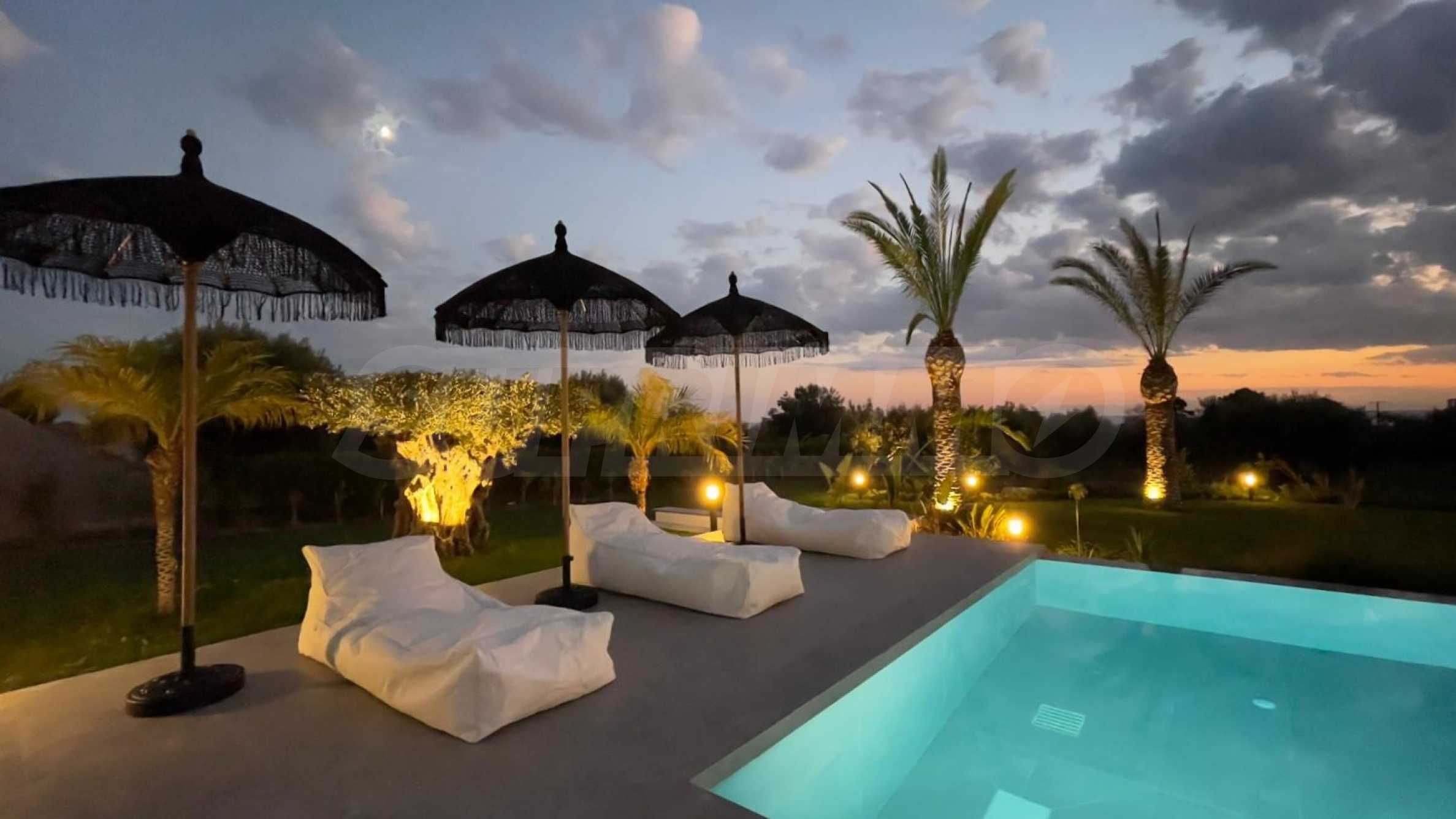 Die Villa befindet sich auf einem großzügigen Grundstück von 5890 m², das mit äußerster Sorgfalt angelegt und gepflegt wird. Im Innenhof genießen Sie Palmen aus Alicante, Spanien, die einen exotischen Charme verleihen, sowie Blumen, Zitronen und Orangen, die die Luft mit dem Duft tropischer Früchte erfüllen. Der vordere Teil des Grundstücks ist mit Olivenbäumen bepflanzt, die eine einzigartige Harmonie zwischen Natur und Luxus schaffen.