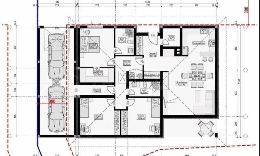 - Eingangshalle mit zwei Fächern für Einbauschrank und Waschküche – 8,97 qm, warme Verbindung zur Garage – 3,68 qm;