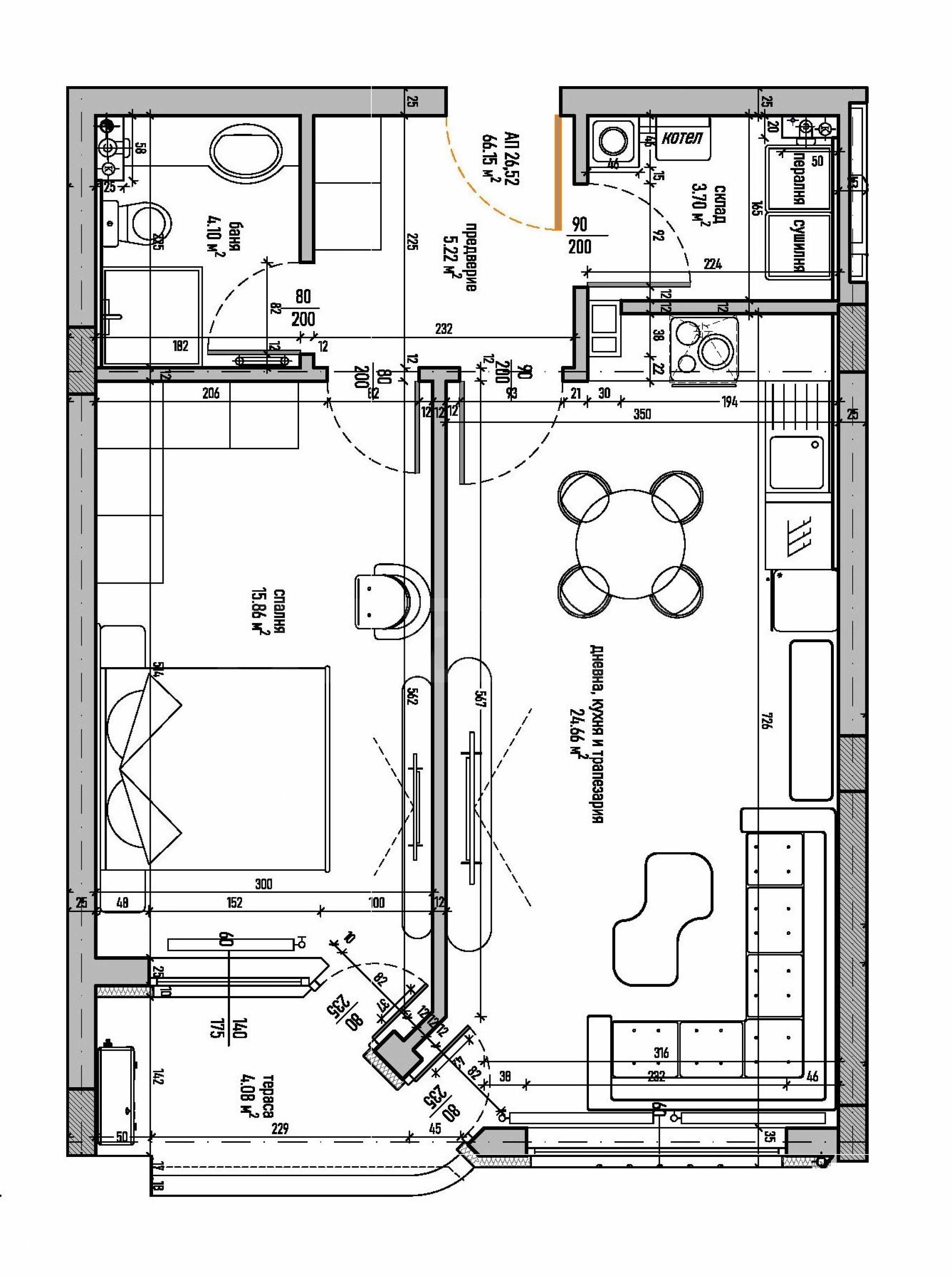 Die Wohnung befindet sich im 4. Stock und bietet eine Fläche von 79,03 m², die funktional in Eingangsbereich, Abstellraum, Wohnzimmer mit Küchenbereich und Esszimmer, Schlafzimmer, Badezimmer mit WC und Terrasse aufgeteilt ist.