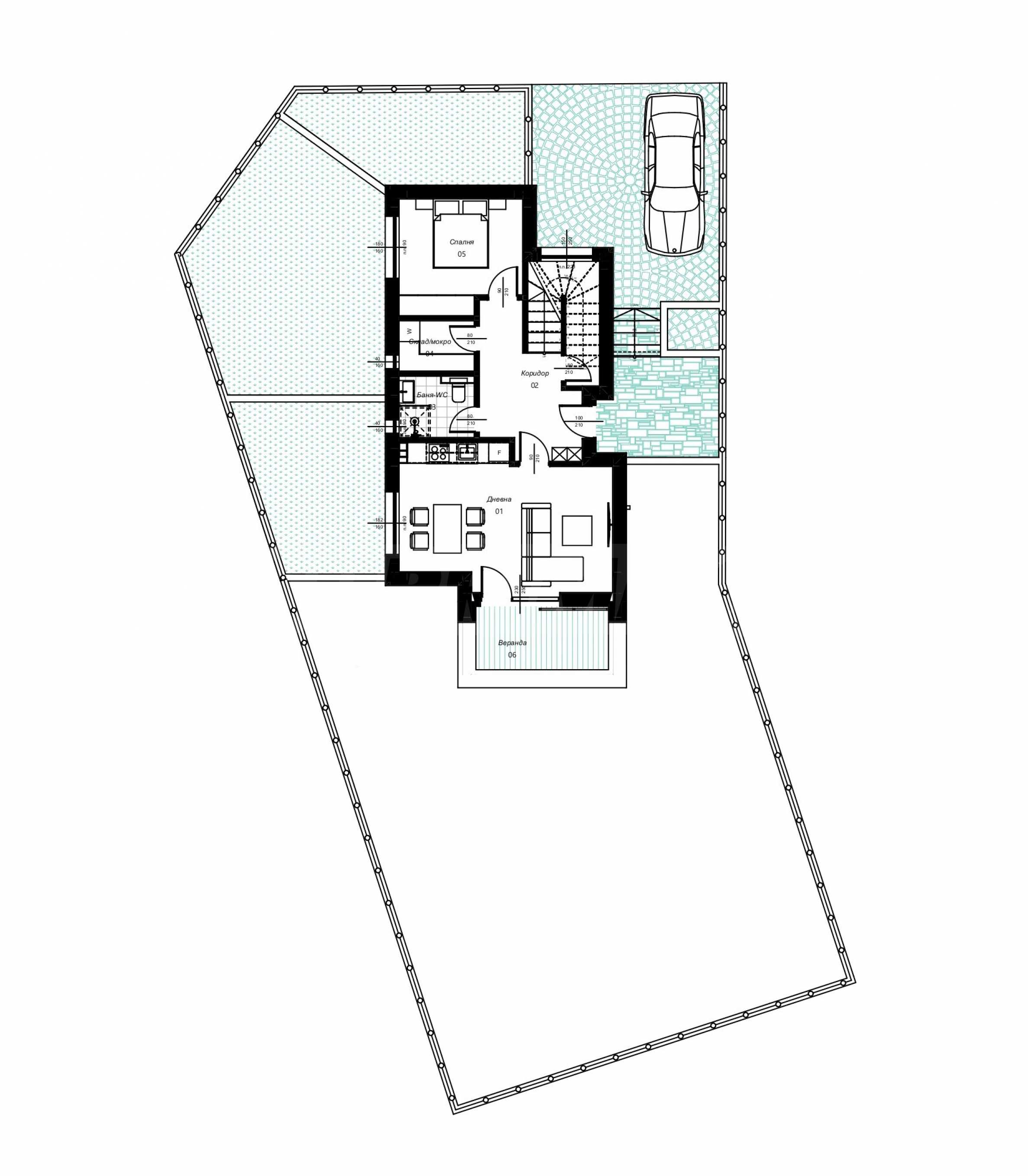 - Erdgeschoss: Flur, Wohnzimmer mit Küche, Schlafzimmer, Badezimmer mit WC, Abstellraum/Nassraum und Veranda;