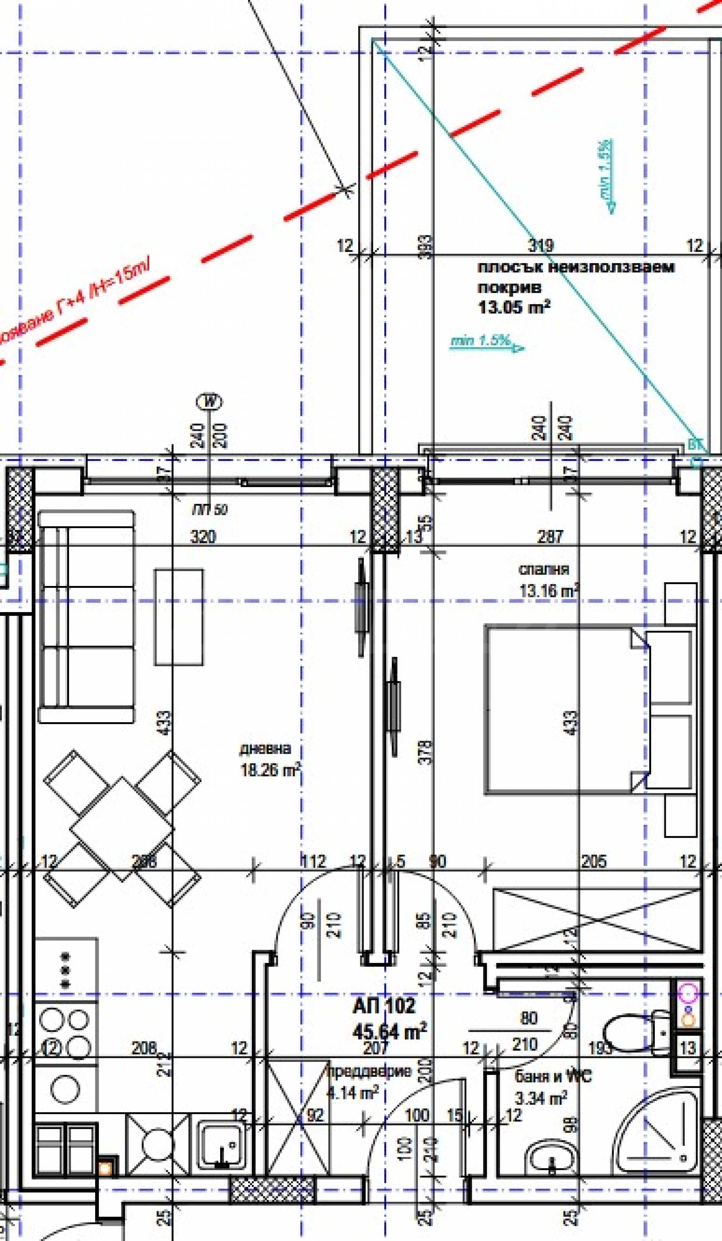 - Flachdach mit verlegten Schichten nach Detail - Dampfsperre, Wärmedämmung aus extrudiertem Polystyrolschaum - XPS, verstärkter Estrich mit Gefälle, zwei Lagen Rollbitumenabdichtung; ohne Wärmebrücken an den Bauteilen;