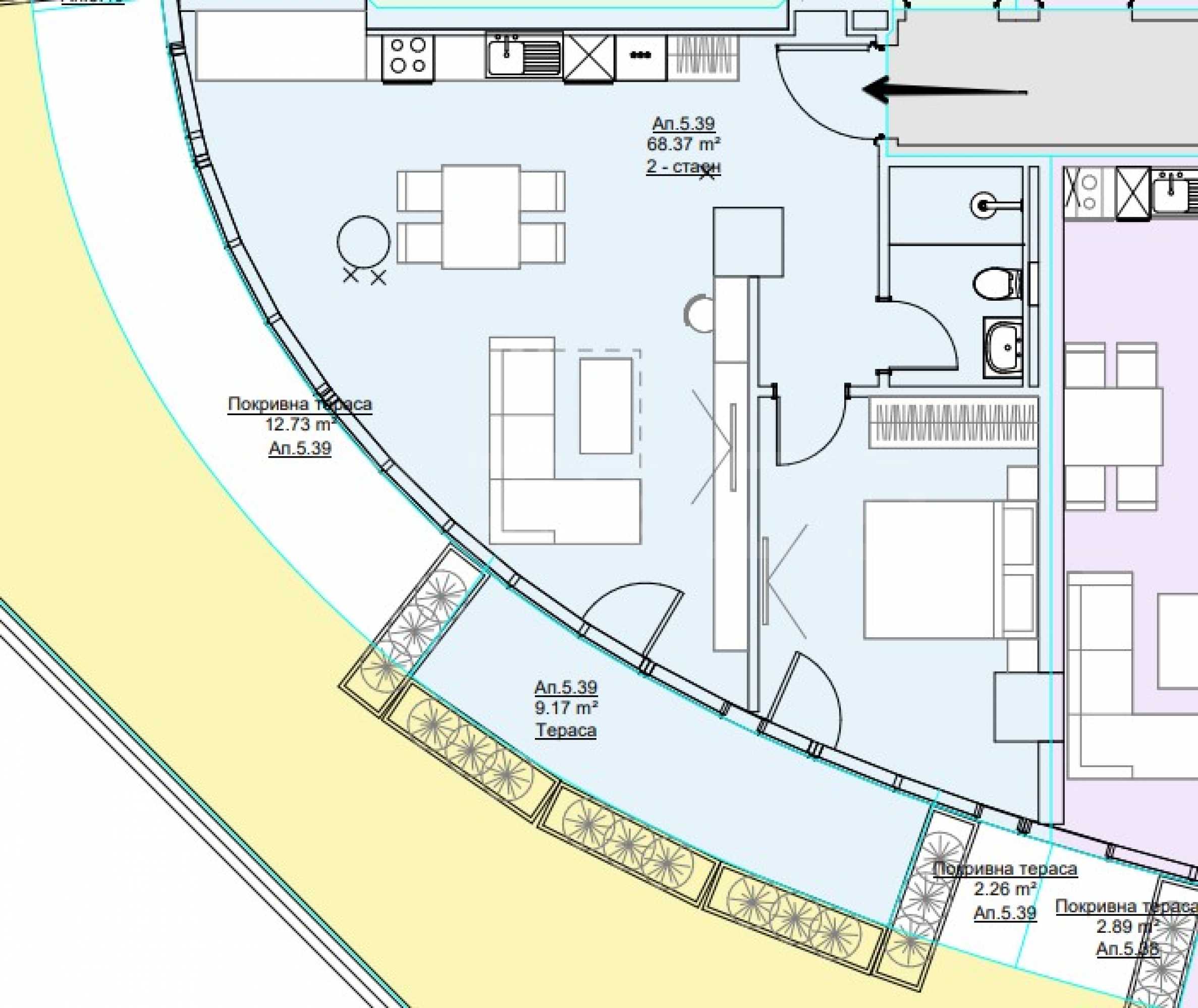 Die Wohnung befindet sich im 5. von insgesamt 15 Stockwerken und bietet eine Gesamtfläche von 96,07 m² (Nettowohnfläche 77,54 m² + Gemeinschaftsflächen 18,53 m²). Das Grundstück hat eine günstige Ausrichtung - Süd/Südwest. Es wird nach bulgarischen Standards (mit Kitt und Estrich) mit einer soliden gepanzerten Eingangstür und hochwertiger Aluminiumschreinerei mit Wärmebrücke und Dreifachverglasung angeboten. Das Gebäude wird über eine Klimaanlage und eine Zentralheizung verfügen.
