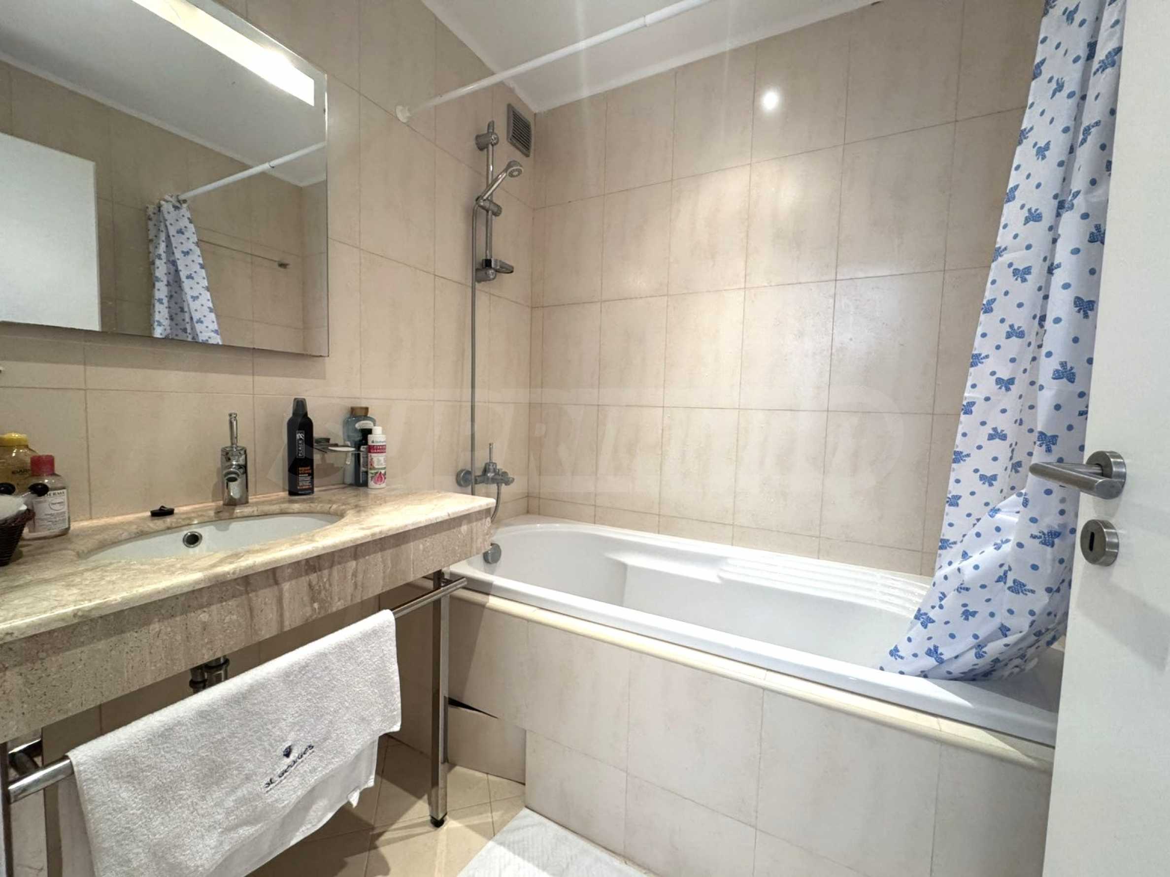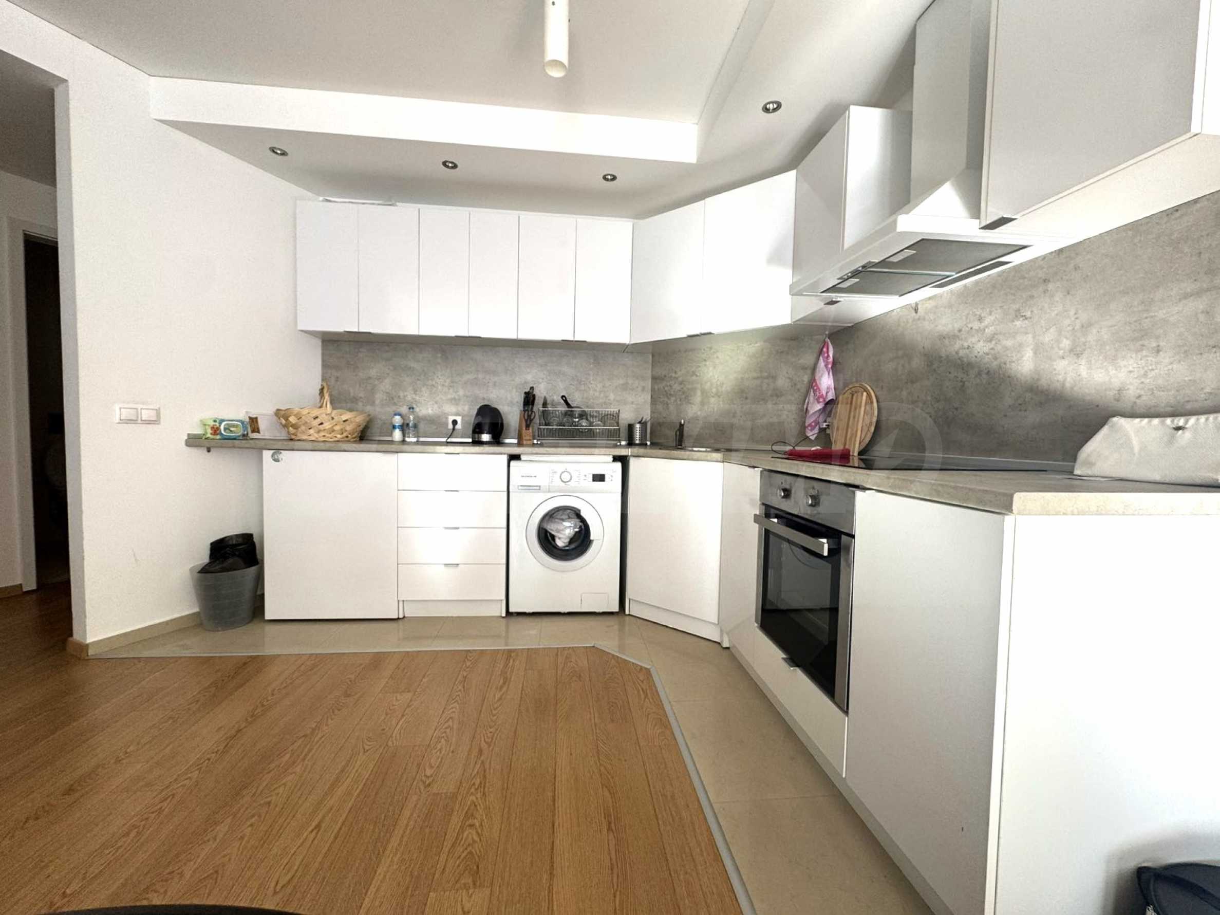 Die Wohnung verfügt über eine individuelle Gestaltung, mit viel Liebe zum Detail. Für die Dekoration werden nur hochwertigste und natürliche Materialien verwendet. Das geräumige Wohnzimmer verfügt über weiche Möbel und eine weiße Küche, die komplett mit hochwertigen Geräten ausgestattet ist: Backofen, Waschmaschine, Kochplatten und Kühlschrank.