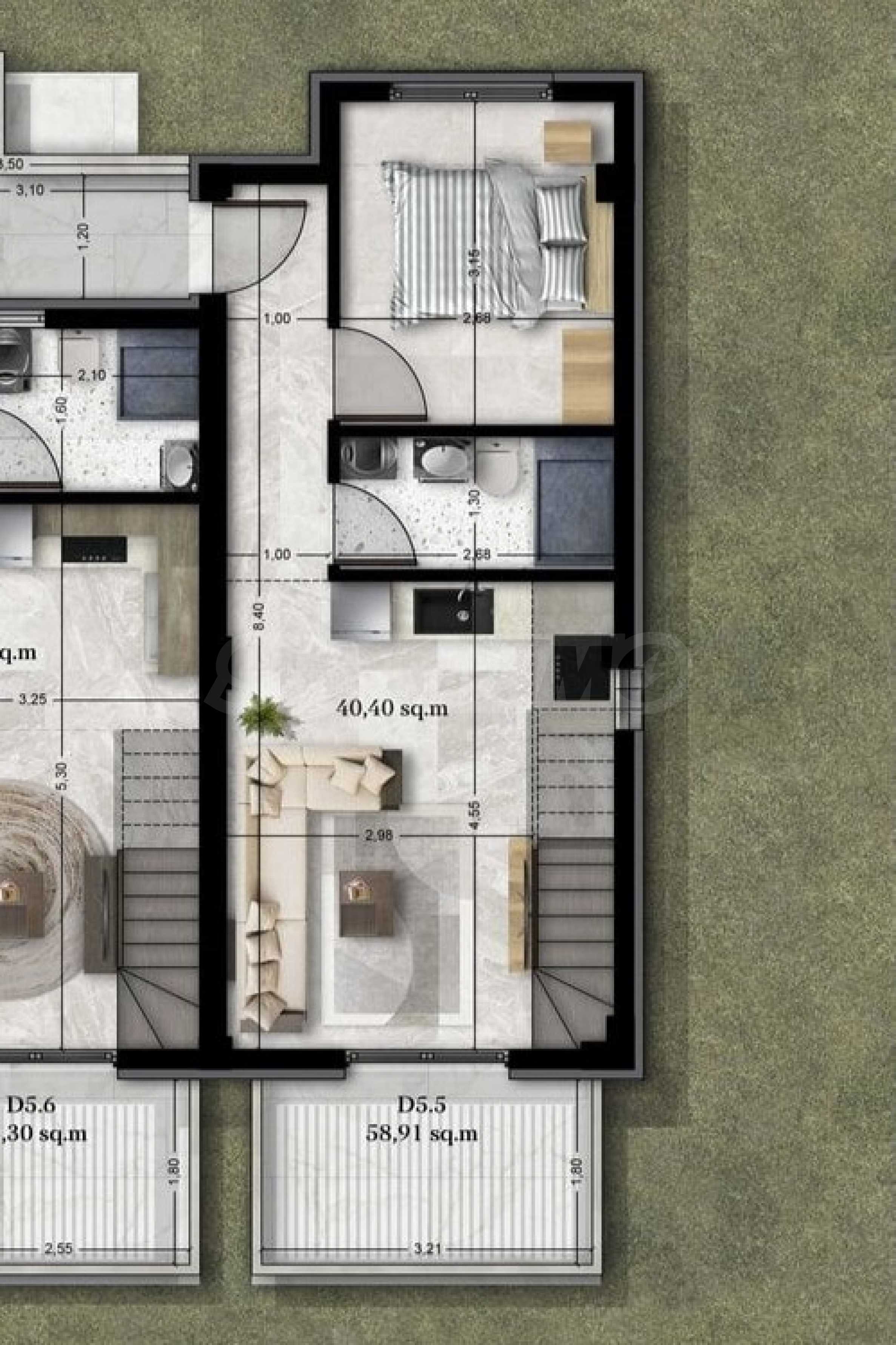 - Die erste Ebene umfasst ein Wohnzimmer mit Küchenzeile, ein Schlafzimmer, ein Badezimmer mit WC und eine Terrasse;