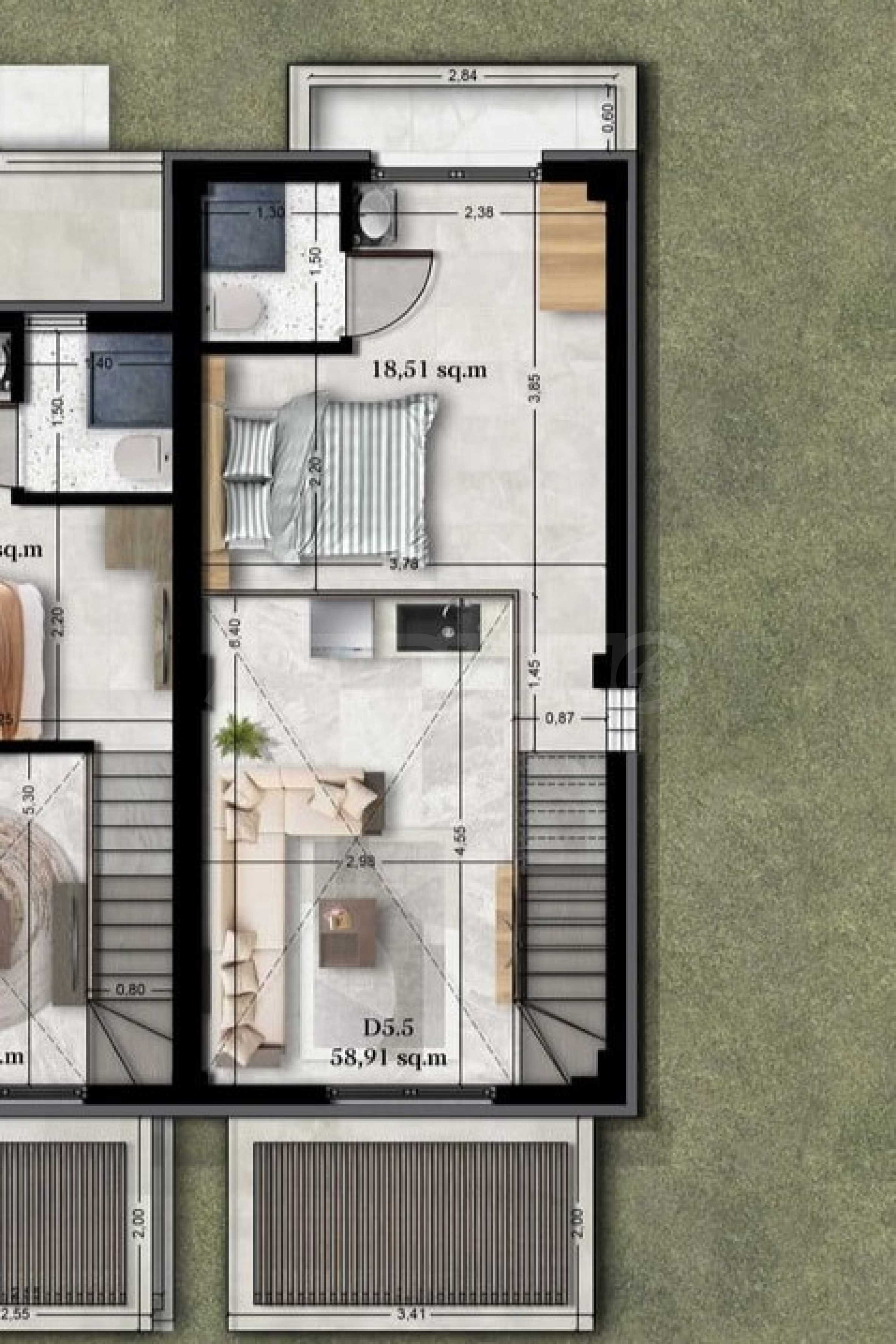 - Die zweite Ebene umfasst ein Schlafzimmer mit eigenem Bad und Terrasse;