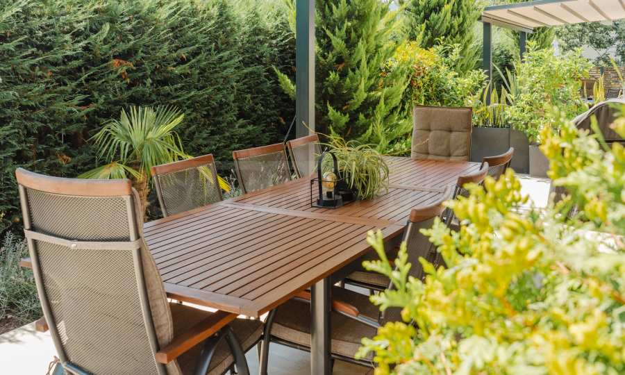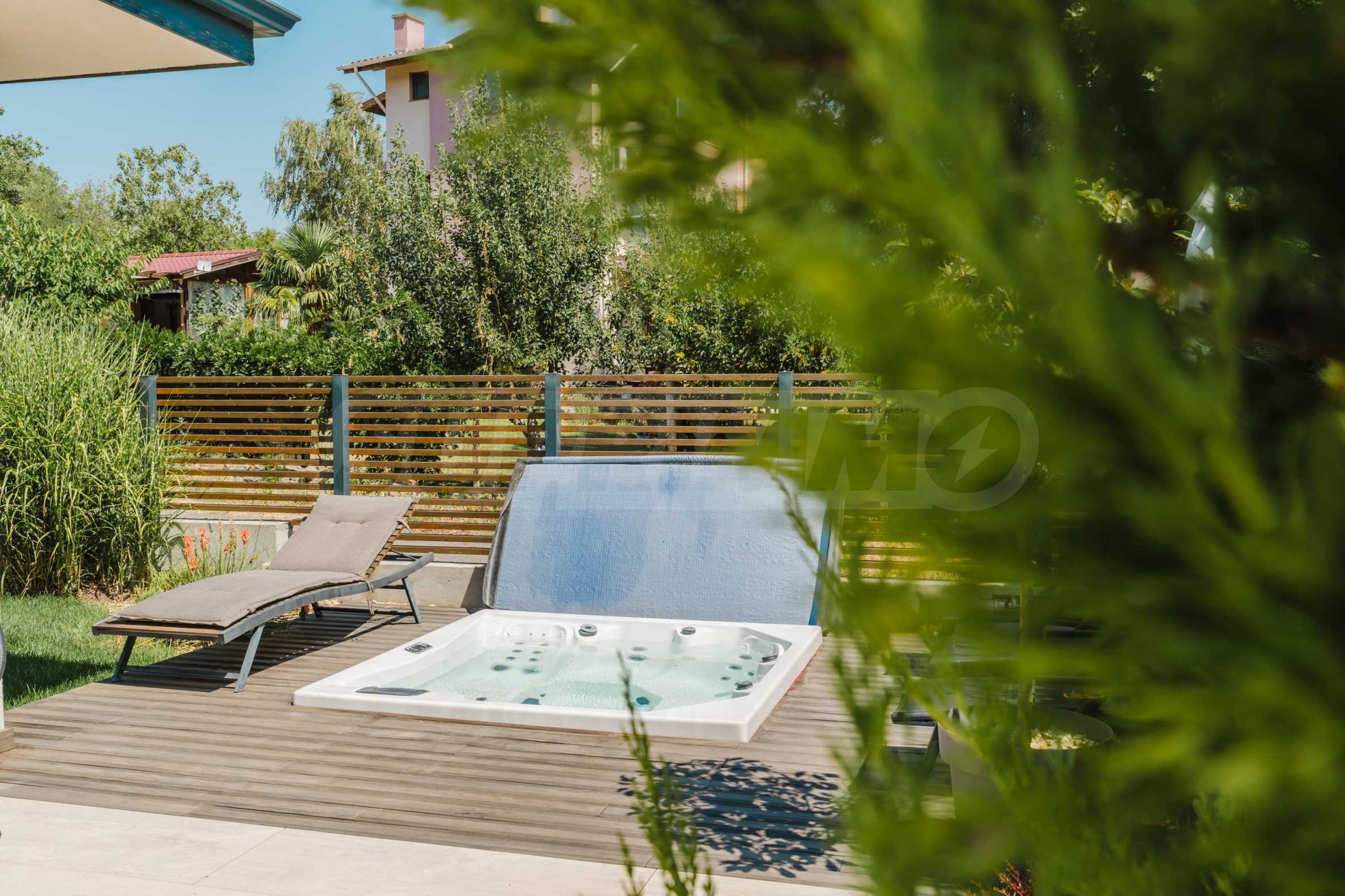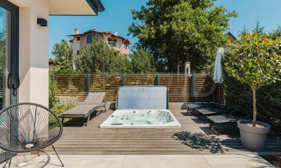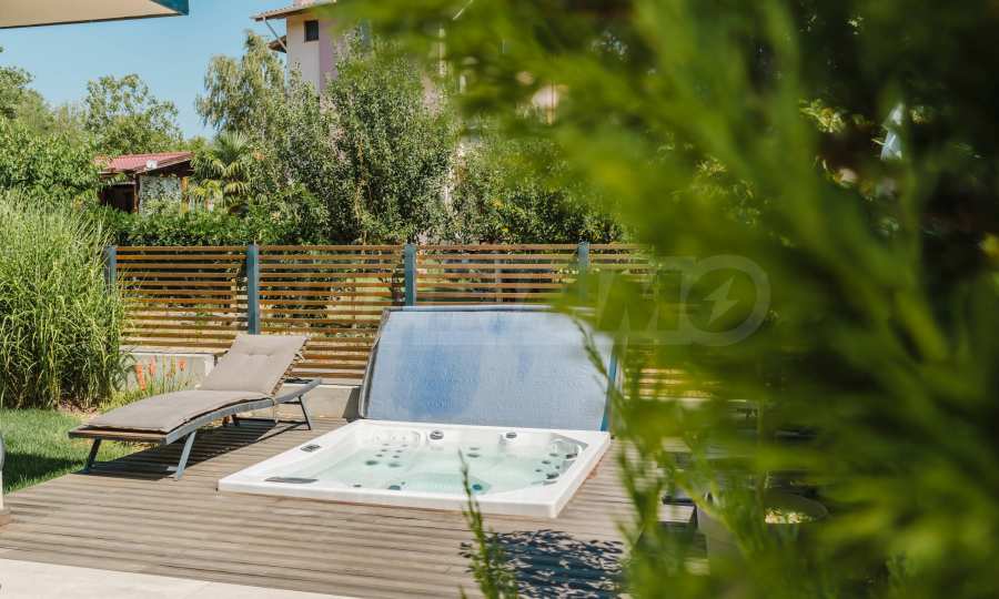- Das Wohnzimmer öffnet sich zu einer Veranda mit Whirlpool.