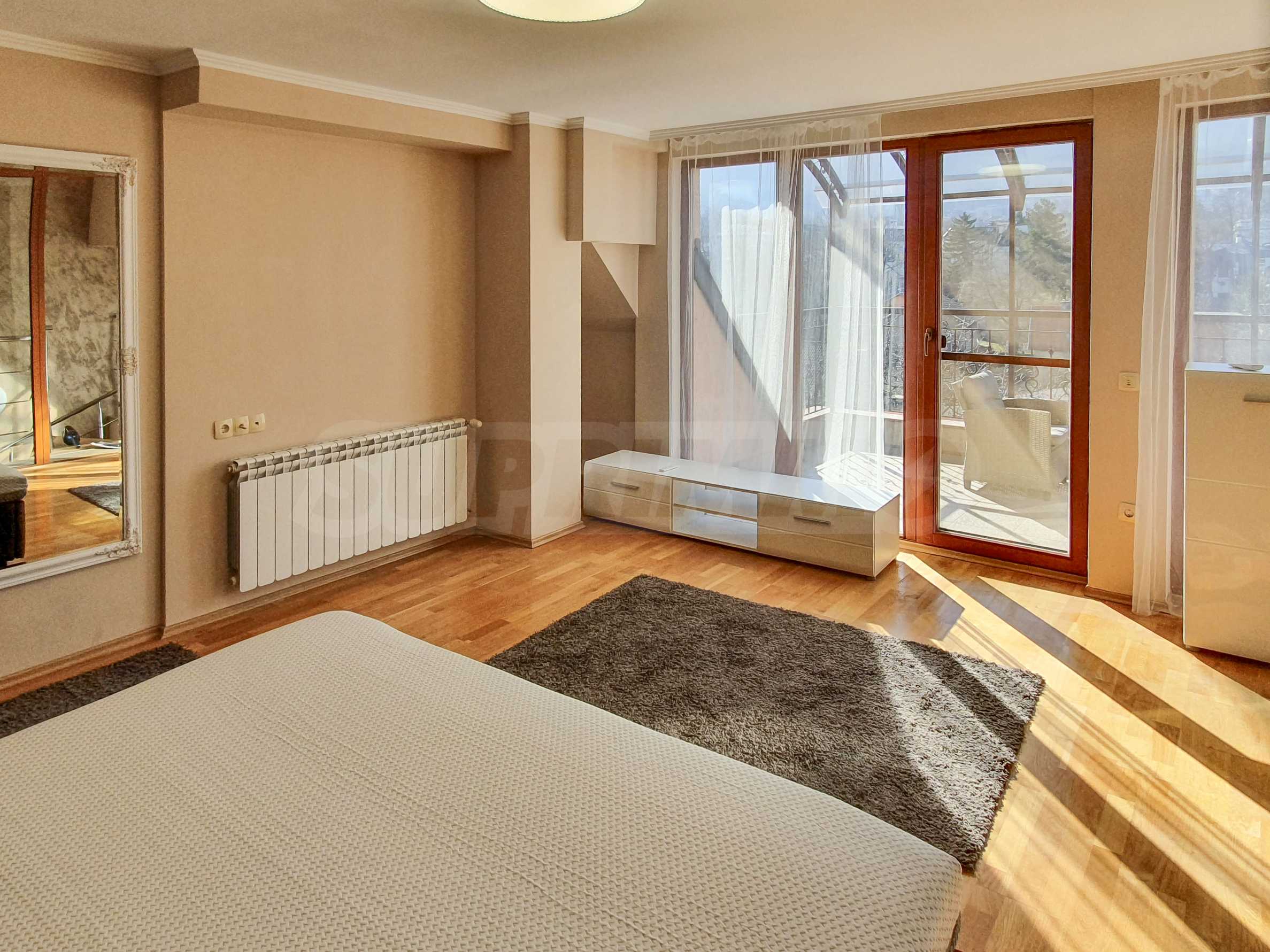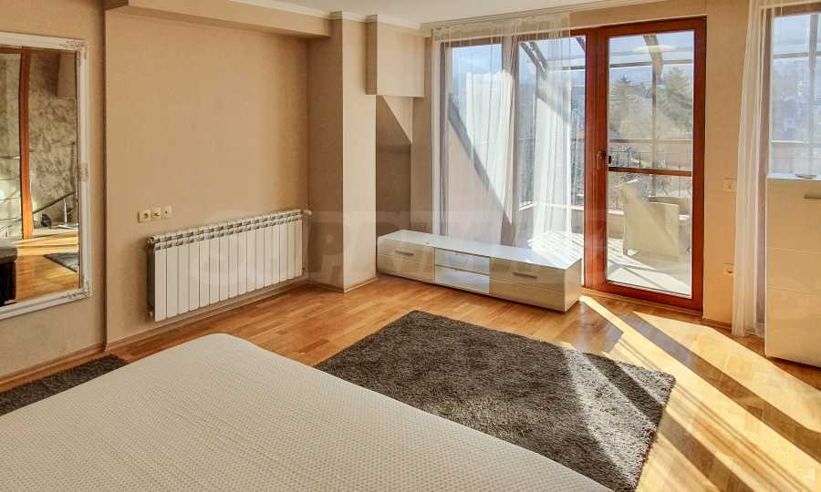 ETAGE 2 – großes Schlafzimmer mit Schrank, Badezimmer mit Toilette und große Terrasse mit einzigartigem Blick auf das Witoschagebirge.