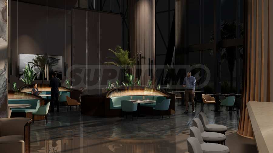 • Lobbybar und Restaurant mit bis zu 10 Meter hohen Decken, die ein unermessliches Gefühl von Großzügigkeit erzeugen;