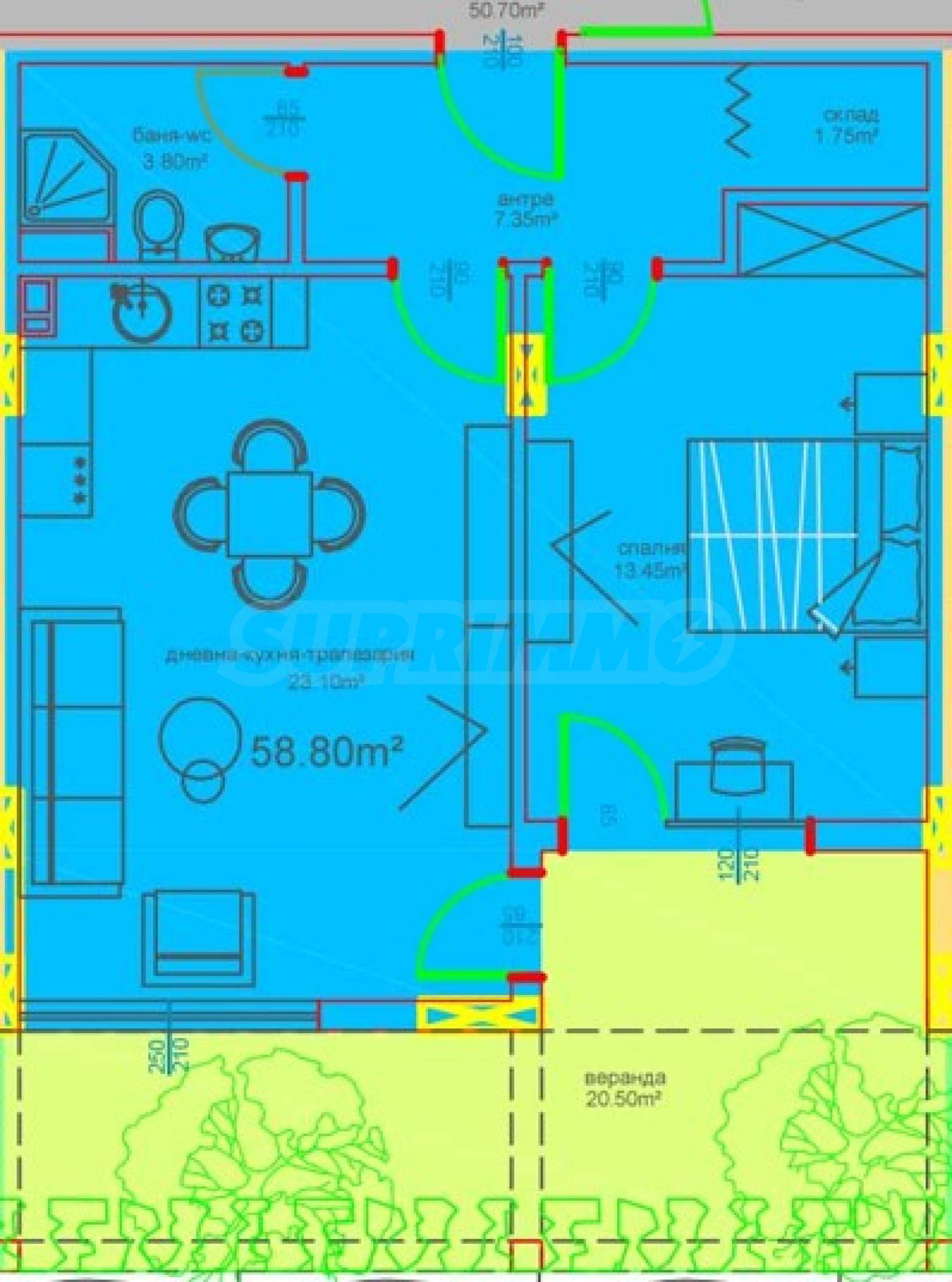 Das Anwesen verfügt über eine Gesamtfläche von 65,66 m², befindet sich im Erdgeschoss und verfügt über einen eigenen Hof von 20,50 m². Es wird in einem Fertigstellungsgrad entsprechend den bulgarischen Baunormen, mit Kitt und Estrich, mit hochwertigen Materialien, ausgegeben.