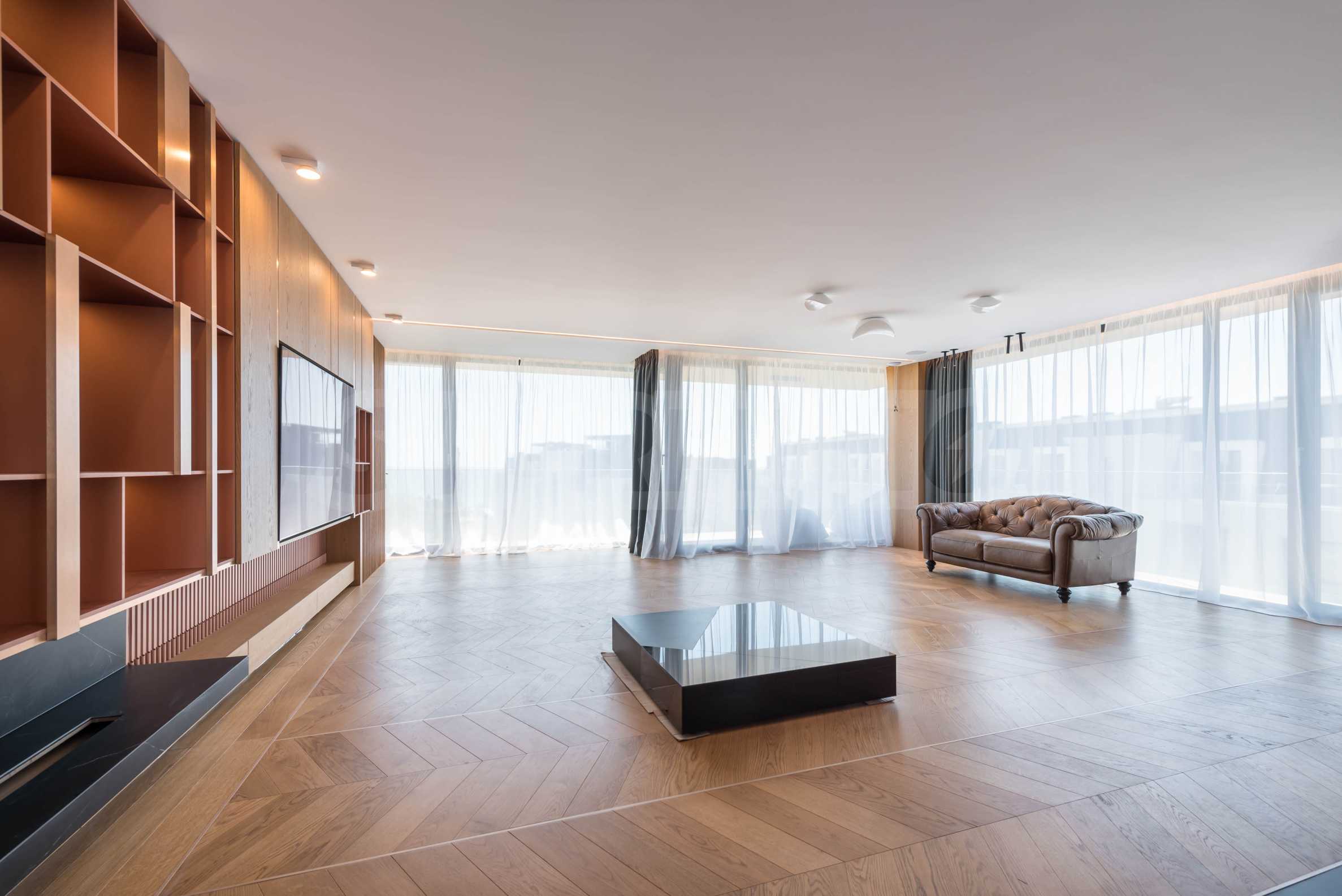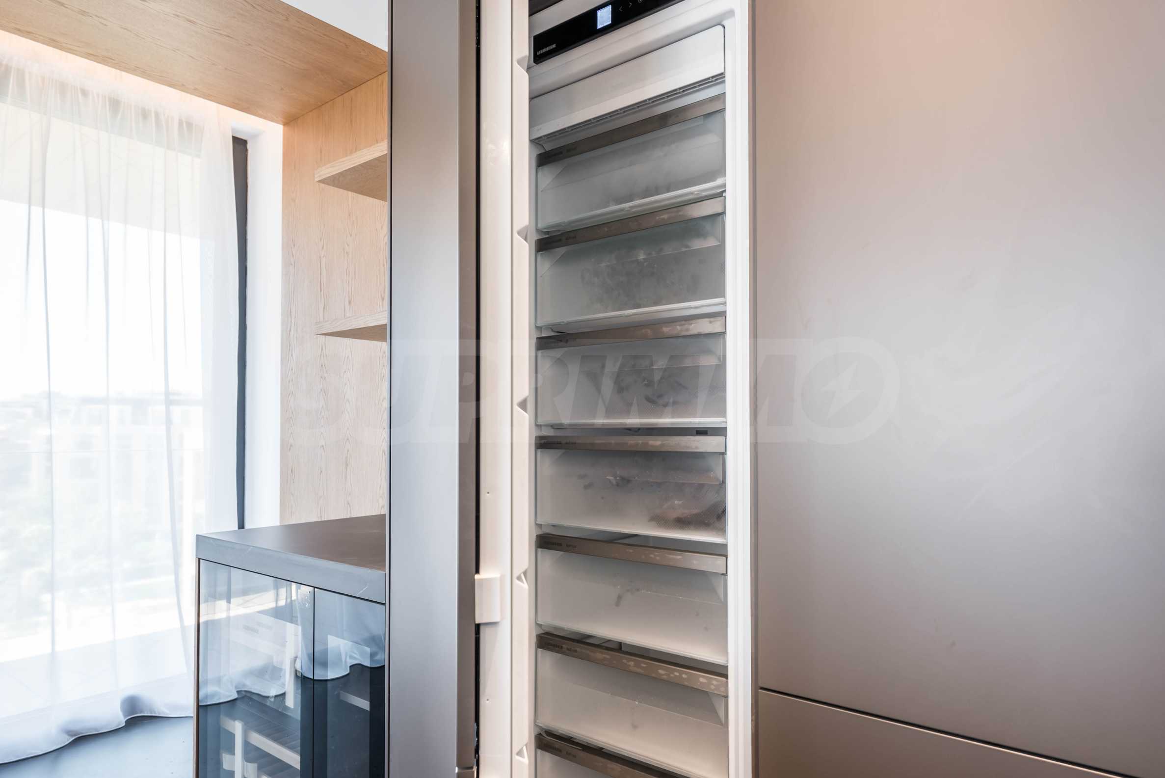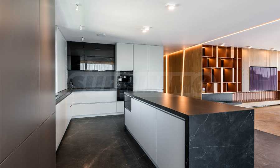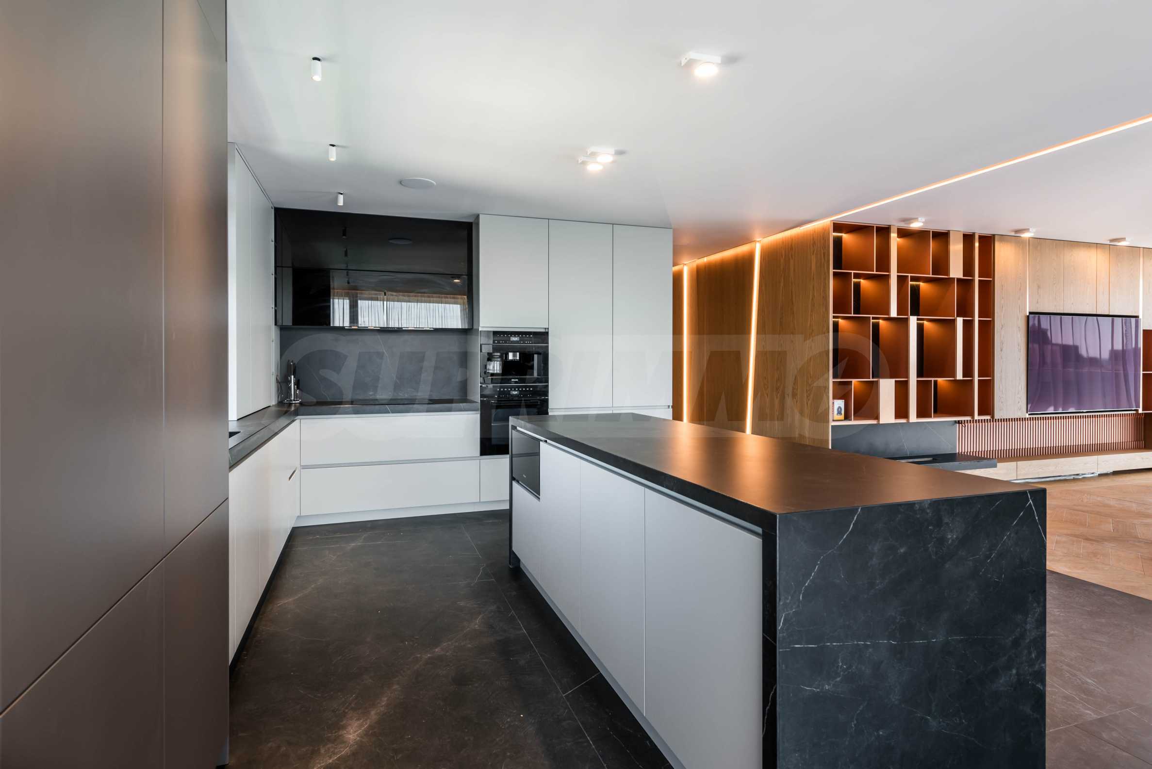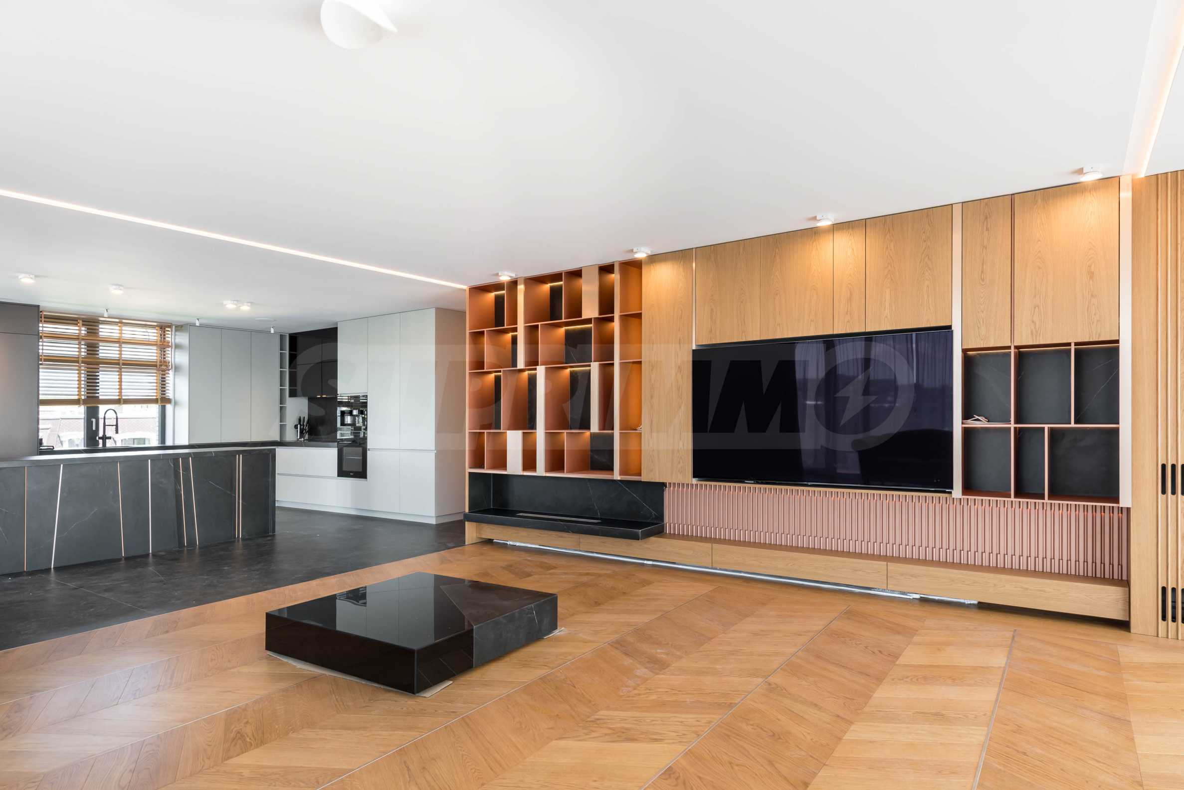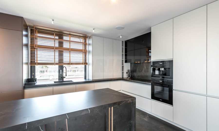 Die Wohnung ist qualitativ mit hochwertigen Materialien ausgestattet und mit modernen und funktionalen Möbeln ausgestattet. Die Einbauküche wurde nach individuellem Projekt mit hochwertigen Miele-Geräten gefertigt. Zur Ausstattung gehören Backofen, Kochfeld, Geschirrspül- und Kaffeemaschine, Einbaukühlschrank mit Gefrierfach, Weinvitrine und Spüle. Die Böden sind im Wohnzimmer mit Naturparkett und in der Küchenecke mit italienischen Granitfliesen ausgelegt, in den Schlafzimmern mit weichem Textilboden und auf den Terrassen mit Dielen aus Verbundmaterial. Die Wände sind mit Furnierpaneelen mit integrierter Beleuchtung, Spiegeln und Glas verkleidet und im Kinderzimmer mit farbenfrohen Zeichnungen gefüllt. Die Decken sind mit eingebauter Beleuchtung und Hintergrundbeschallung (Bowers & Wilkins) abgehängt. Die meisten Zimmer sind komplett möbliert, im Wohnzimmer können Sie die Polstermöbel jedoch nach Ihrem Geschmack auswählen.