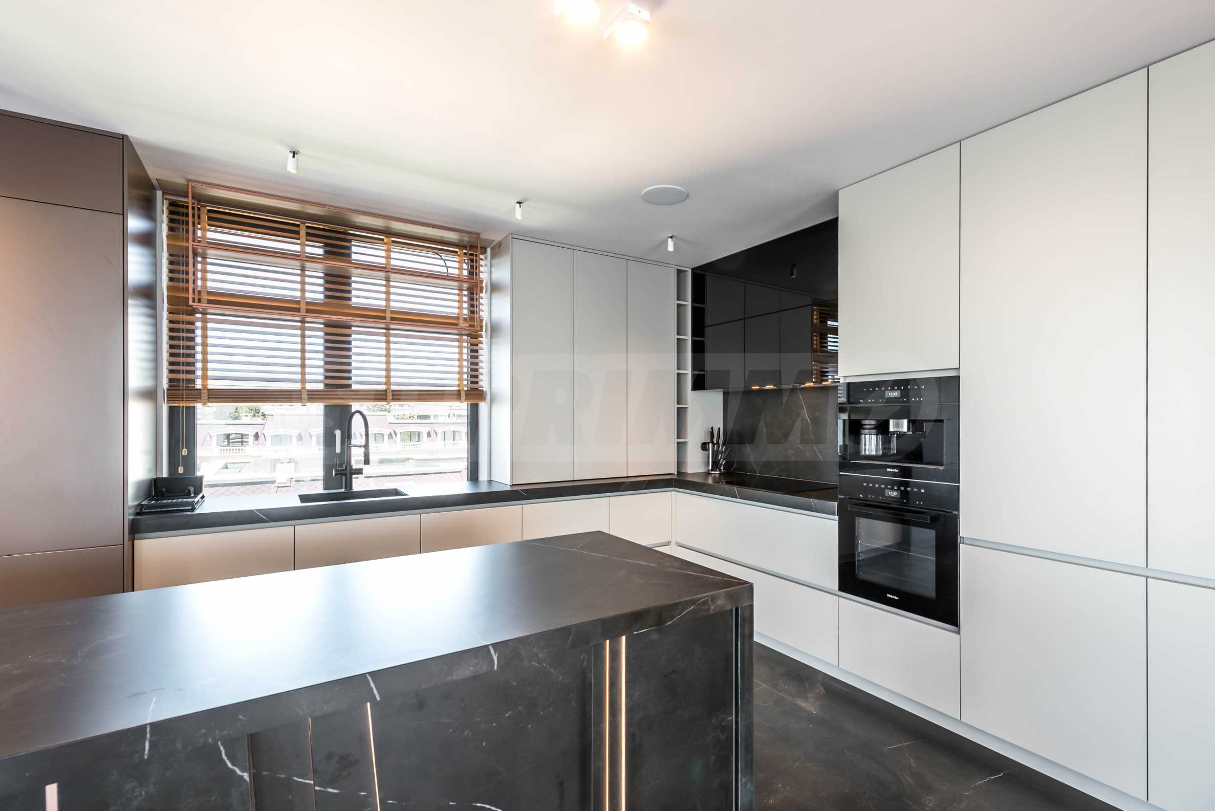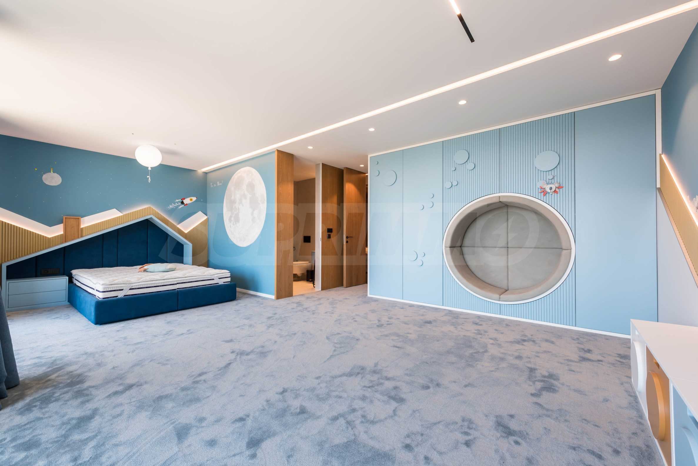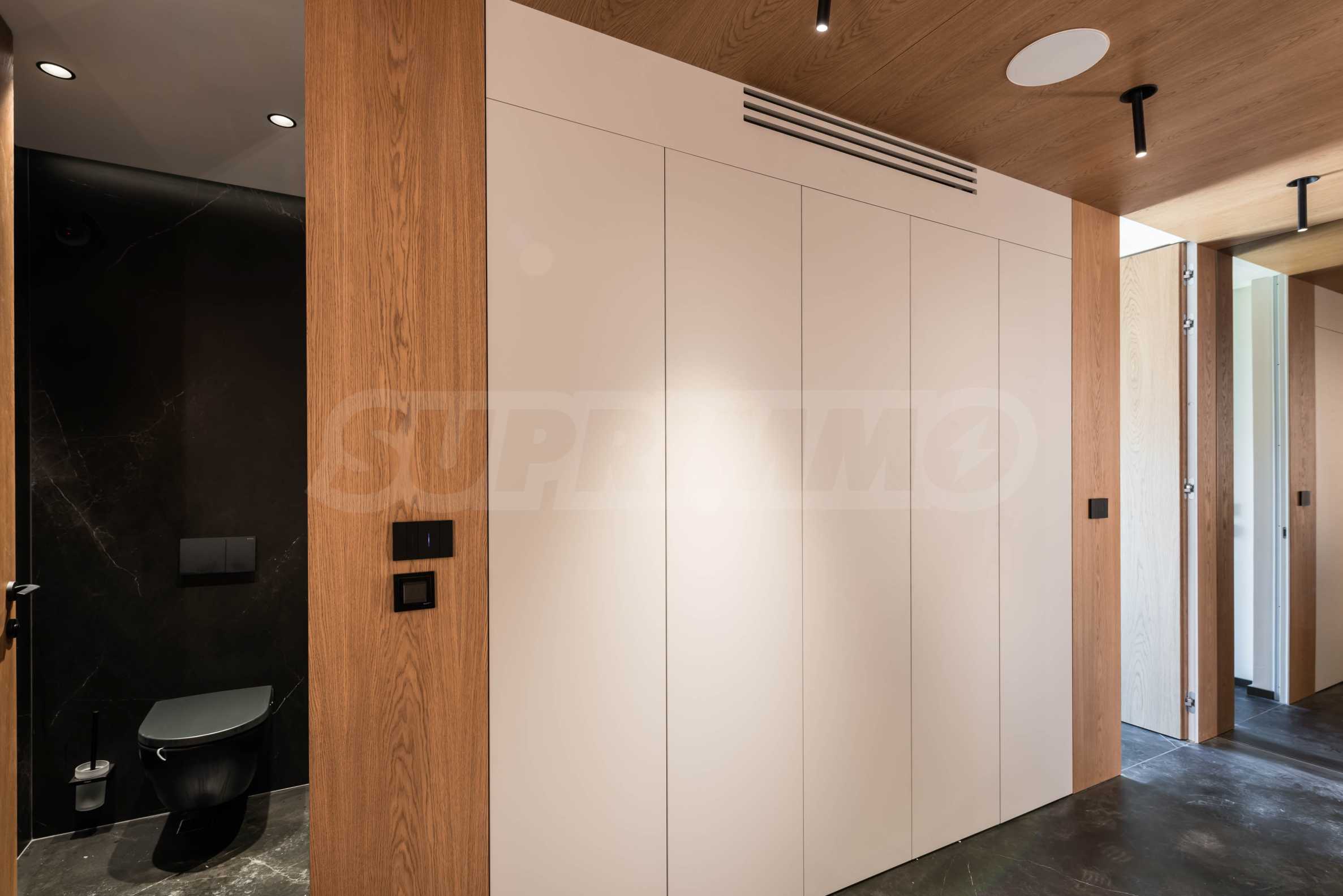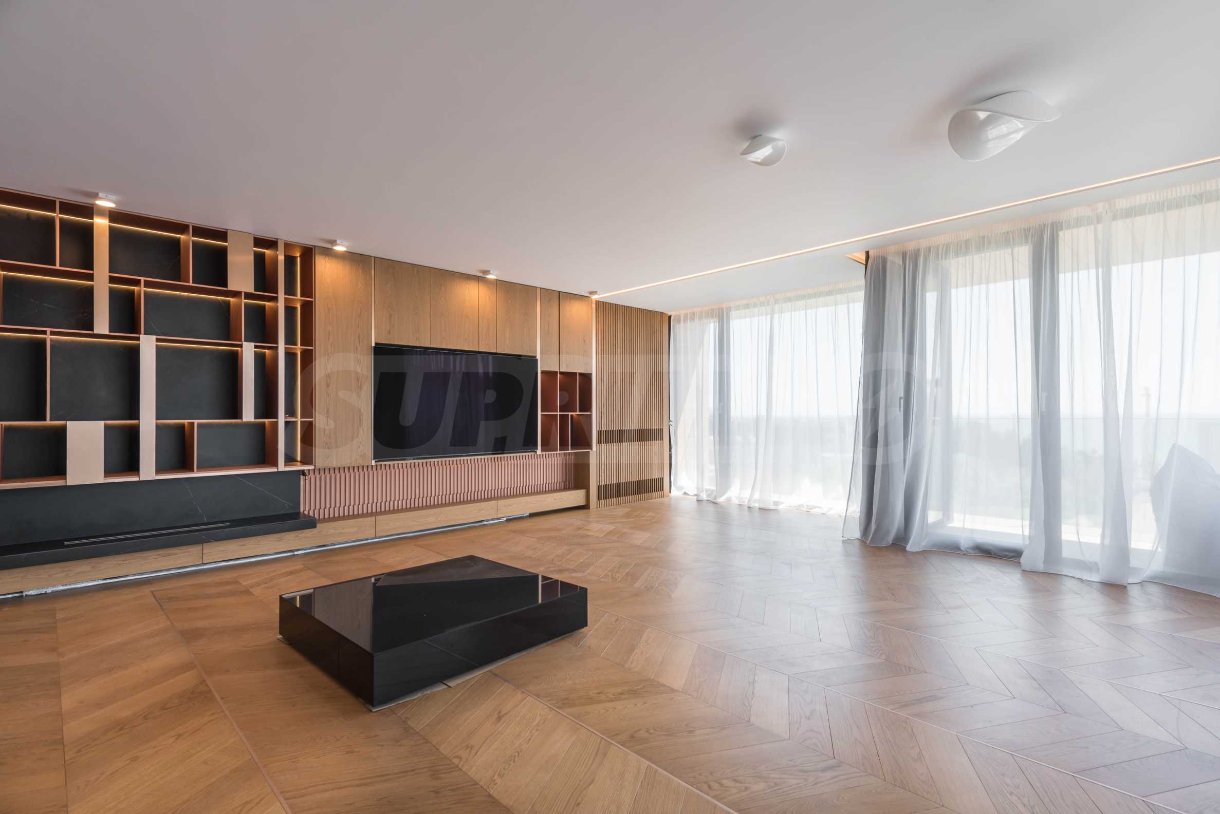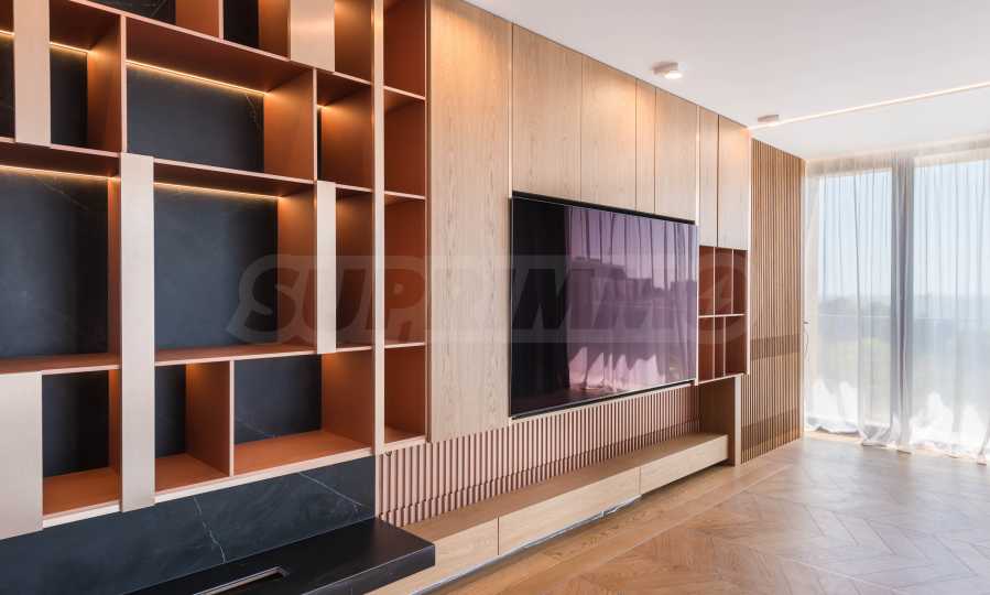 Die Wohnung ist qualitativ mit hochwertigen Materialien ausgestattet und mit modernen und funktionalen Möbeln ausgestattet. Die Einbauküche wurde nach individuellem Projekt mit hochwertigen Miele-Geräten gefertigt. Zur Ausstattung gehören Backofen, Kochfeld, Geschirrspül- und Kaffeemaschine, Einbaukühlschrank mit Gefrierfach, Weinvitrine und Spüle. Die Böden sind im Wohnzimmer mit Naturparkett und in der Küchenecke mit italienischen Granitfliesen ausgelegt, in den Schlafzimmern mit weichem Textilboden und auf den Terrassen mit Dielen aus Verbundmaterial. Die Wände sind mit Furnierpaneelen mit integrierter Beleuchtung, Spiegeln und Glas verkleidet und im Kinderzimmer mit farbenfrohen Zeichnungen gefüllt. Die Decken sind mit eingebauter Beleuchtung und Hintergrundbeschallung (Bowers & Wilkins) abgehängt. Die meisten Zimmer sind komplett möbliert, im Wohnzimmer können Sie die Polstermöbel jedoch nach Ihrem Geschmack auswählen.